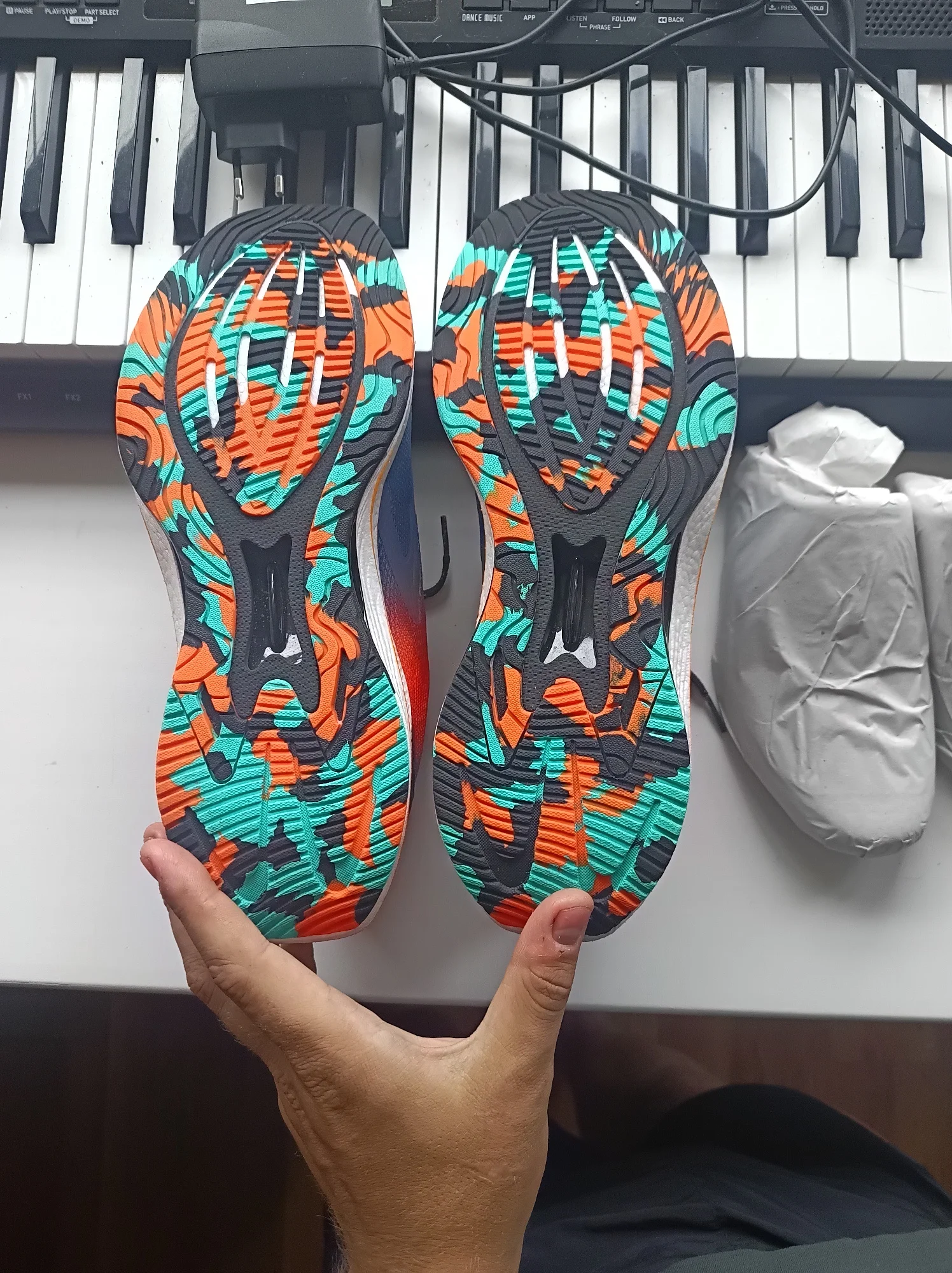 Выглядят красиво и качественно. Пена мягкая и упругая. Не бегал в них ещё, только прошёлся на улице. Ощущения не однозначные - пластиковая арка под сводом стопы чрезмерно давит, это не понравилось. Пятка свободно ерзает внутри Вообще кажется эта модель хорошо подойдёт для широкой стопы, для узкой слишком свободно внутри. Возможно после усадки на ногу ощущения изменятся.