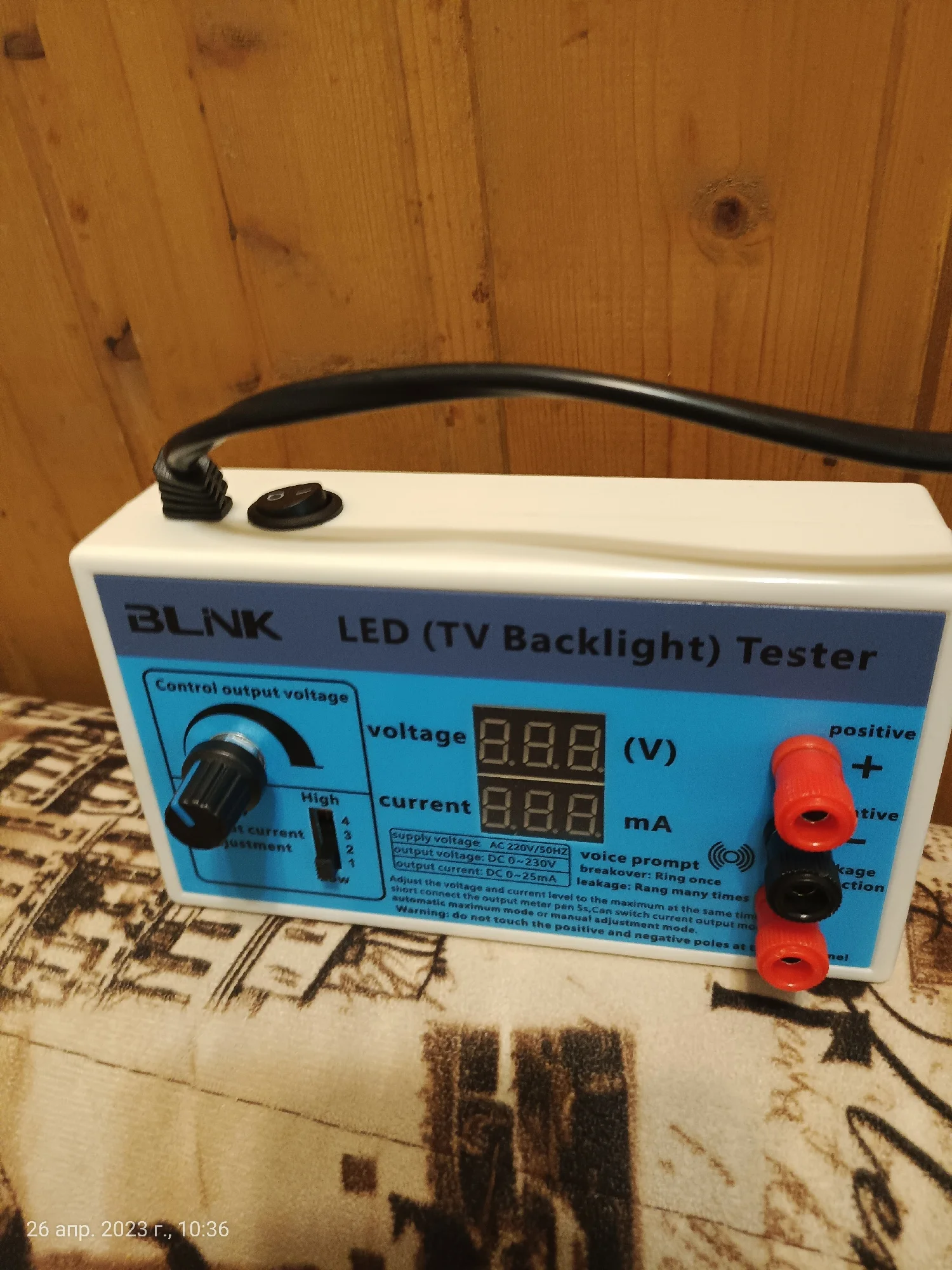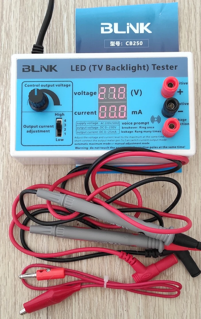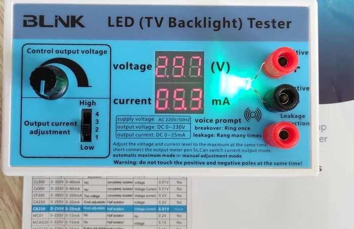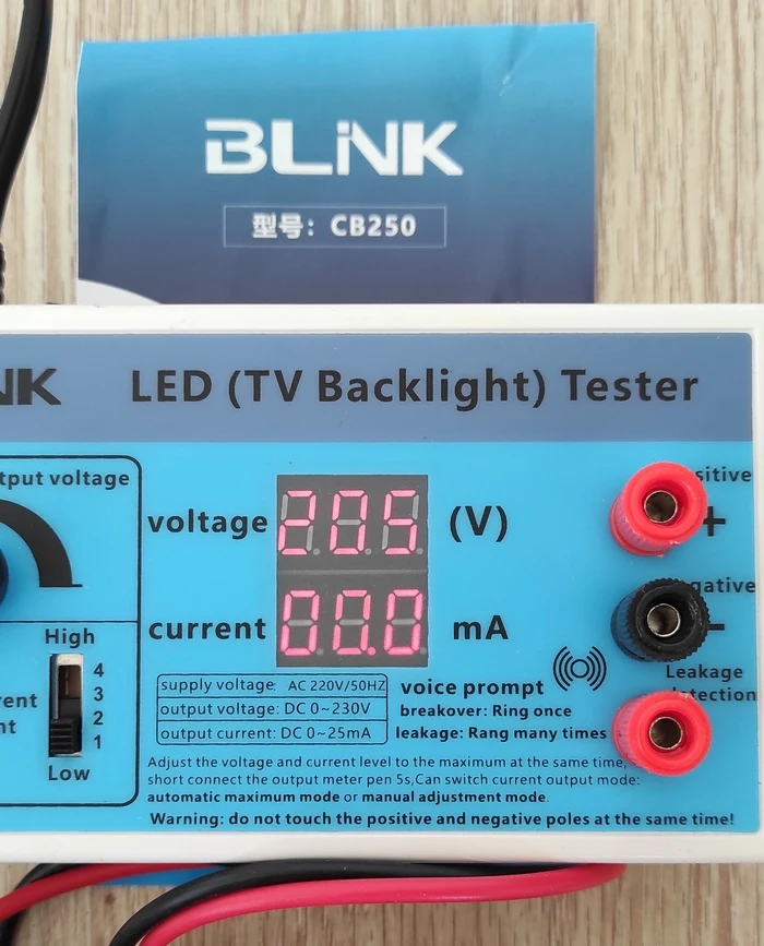 BLINK CB250. LED-Tester оправдал мои ожидания! Ограничение напряжения регулируется плавно: 0-200В. Ограничение тока можно выбрать: 2_5_15_20мА. ------- Упаковано отлично! Свежачок! Поставщика рекомендую. Доставлено всего 16 дней. ------- 26.075.2021 - Заказал. 12.08.2021 - Товар получил, спасибо! -------- Packaged perfectly! I recommend the supplier. 26.07.2021 - Order. 12.08.2021 - I recieved the good, thanks!. -------- Екатеринбург, Урал, Россия. Yekaterinburg, Ural, Russia.