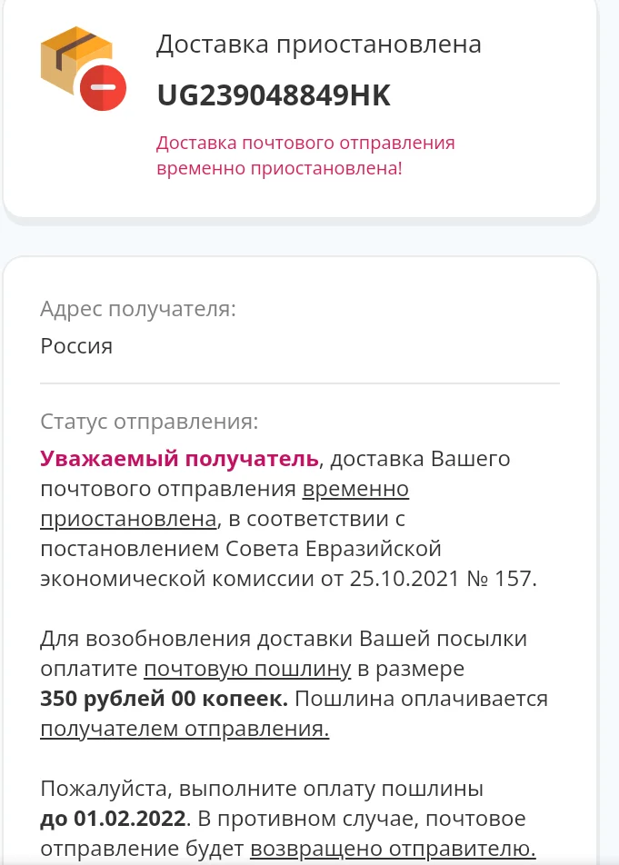 товар не доставлен. при отслеживания по трек-номеру, увидела сообщение г необходимости оплатить доставку в размере 350р, иначе товар будет отправлен отправителю... ни денег, ни товара