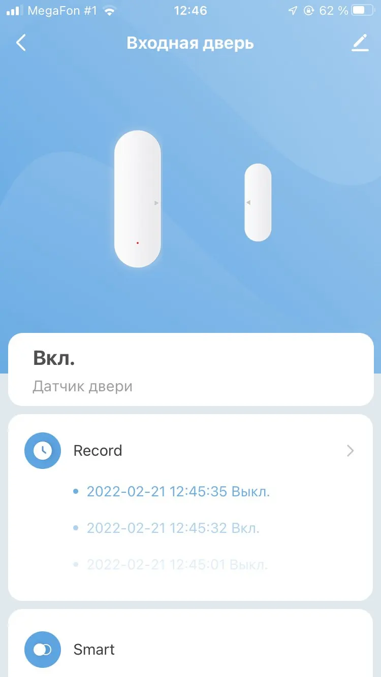 Отличный датчик! Компактный, работает от двух мизинчиковых батареек. Подключила к приложению Smart live (андроид), установка элементарная, можно настроить сценарии, уведомления по открытию, закрытию, разряду батареи, можно настроить промежутки времени. Уведомление прилетает на телефон через секунду. Можно подключить к домашнему вайфаю или раздавать с телефона, но если переключаете сеть, то нужно будет сбросить и привязать заново. переживала, что нет возможности установить половинки в одной плоскости, дверь немного утоплена, но все хорошо, контакт сохраняется и при таком положении. Доставка очень быстрая, на кассу пятерочки, хотя указывала почту. В общем - советую!