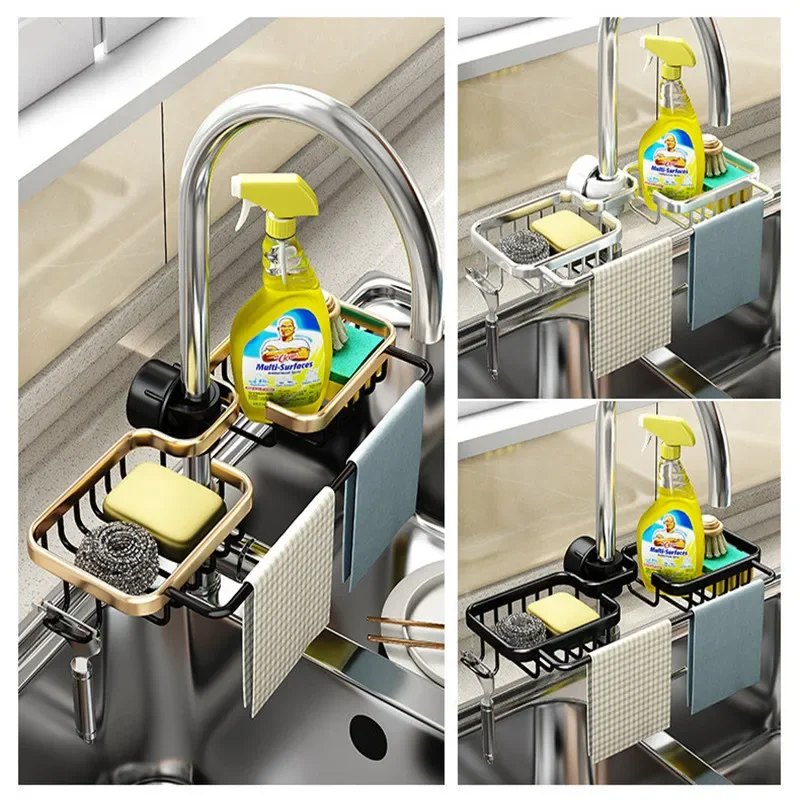 Стеллаж для хранения в кухне, алюминиевая полка для мыла с губкой, органайзер для слива раковины, аксессуары для ванной комнаты