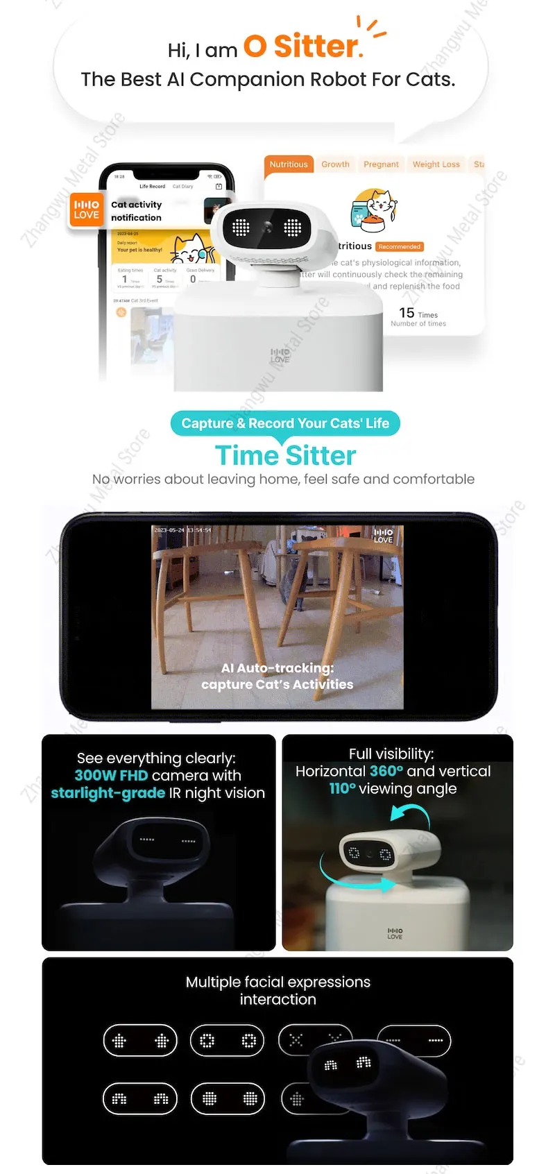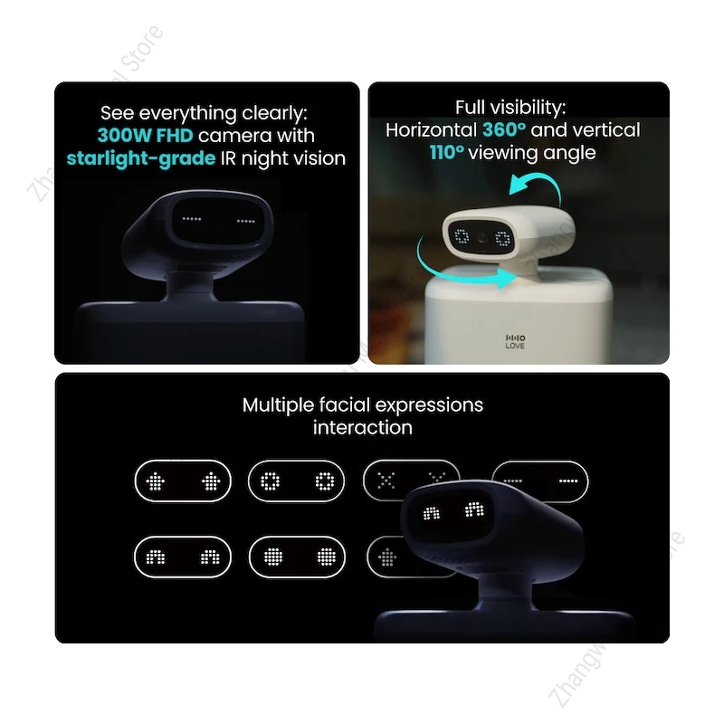 【Умная камера】 Благодаря конструкции высокоскоростной бесшумной облачной станции и коллекции взаимодействия лазера, камеры и экспрессии O Sitter может переключаться между любым режимом, включая подключение, съемку и обновление.