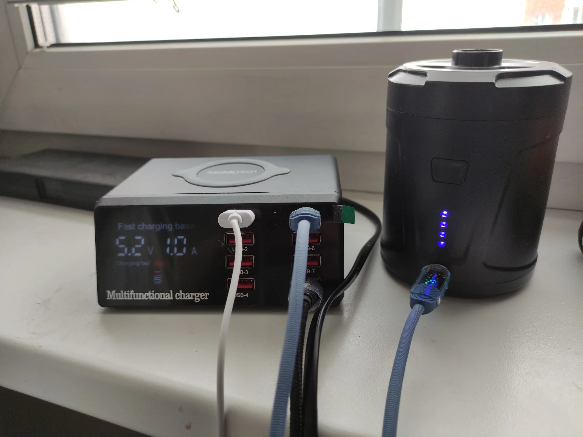 Для своего размера дует хорошо. Компактный, стильный. Брал для раздува мангала, производительности вполне хватает и не мотается никаких проводов. Заряжается током 1 ампер.