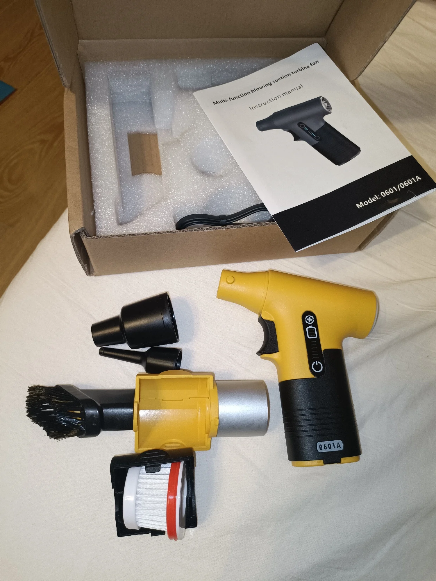 Отличная воздуходувка, маленькая компактная и достаточно мощная, со своей задачей полностью справляется, с большой насадкой дует лучше. Брал для выдувания пыли из труднодоступных мест, продувки системных блоков. Пришла модель 0601A, что соответствует 100W, ~120000 RPM, выдув 50м/с. Как пылесос работает слабенько, но пыль и мелкие сорины собрать хватит.