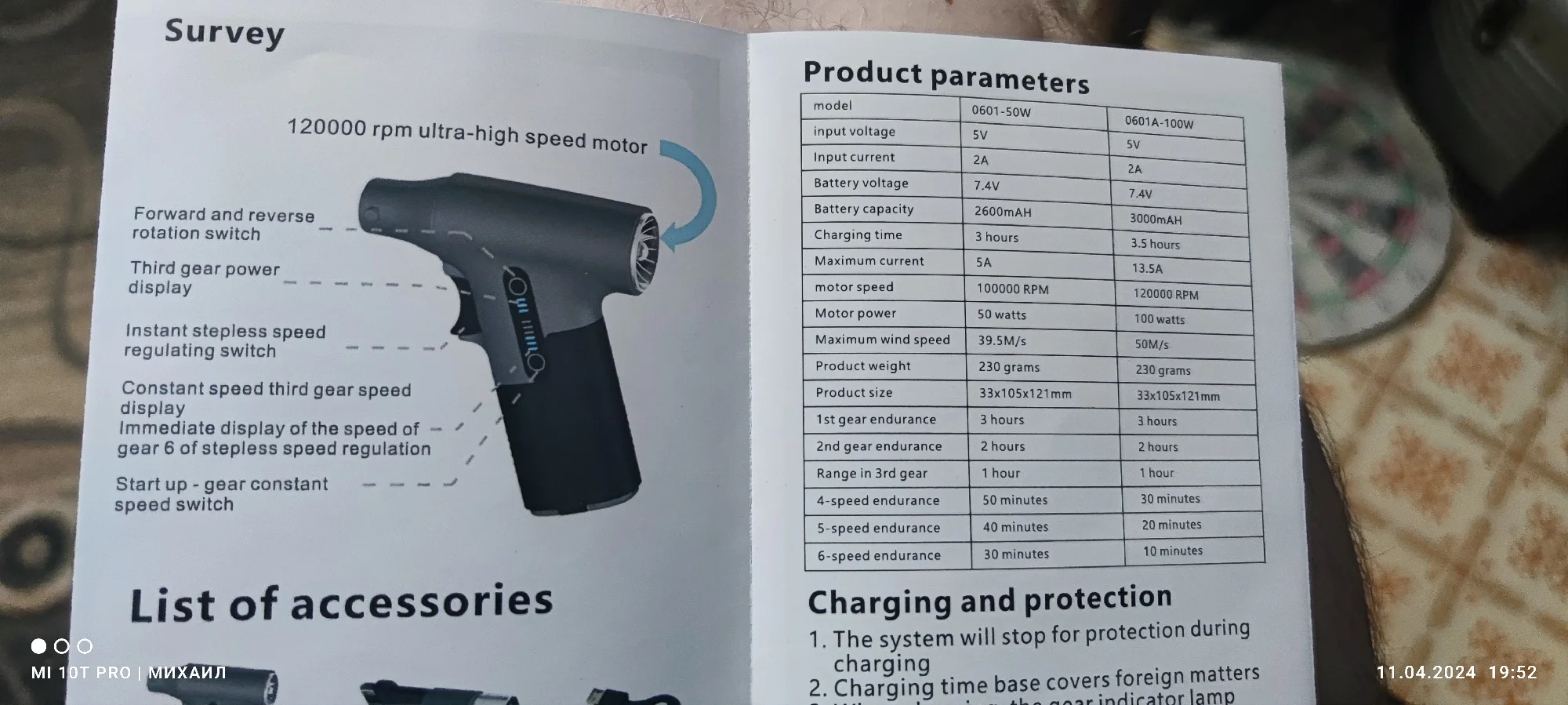 Ветродуйка огонь! Модель 0601А-100w .Дует прилично, двигатель мощь! Есть реверс(для пылесоса), так же фиксированые обороты и плавная регулировка с кнопки. Зарядка type-c с индикацией остаточной емкости. 5 мин работы на максимальных оборотах есть небольшой нагрев корпуса. Самая тонкая насадка существенно режет воздушный поток! Лучше средняя насадка или без нее! Меньше чем ожидал!