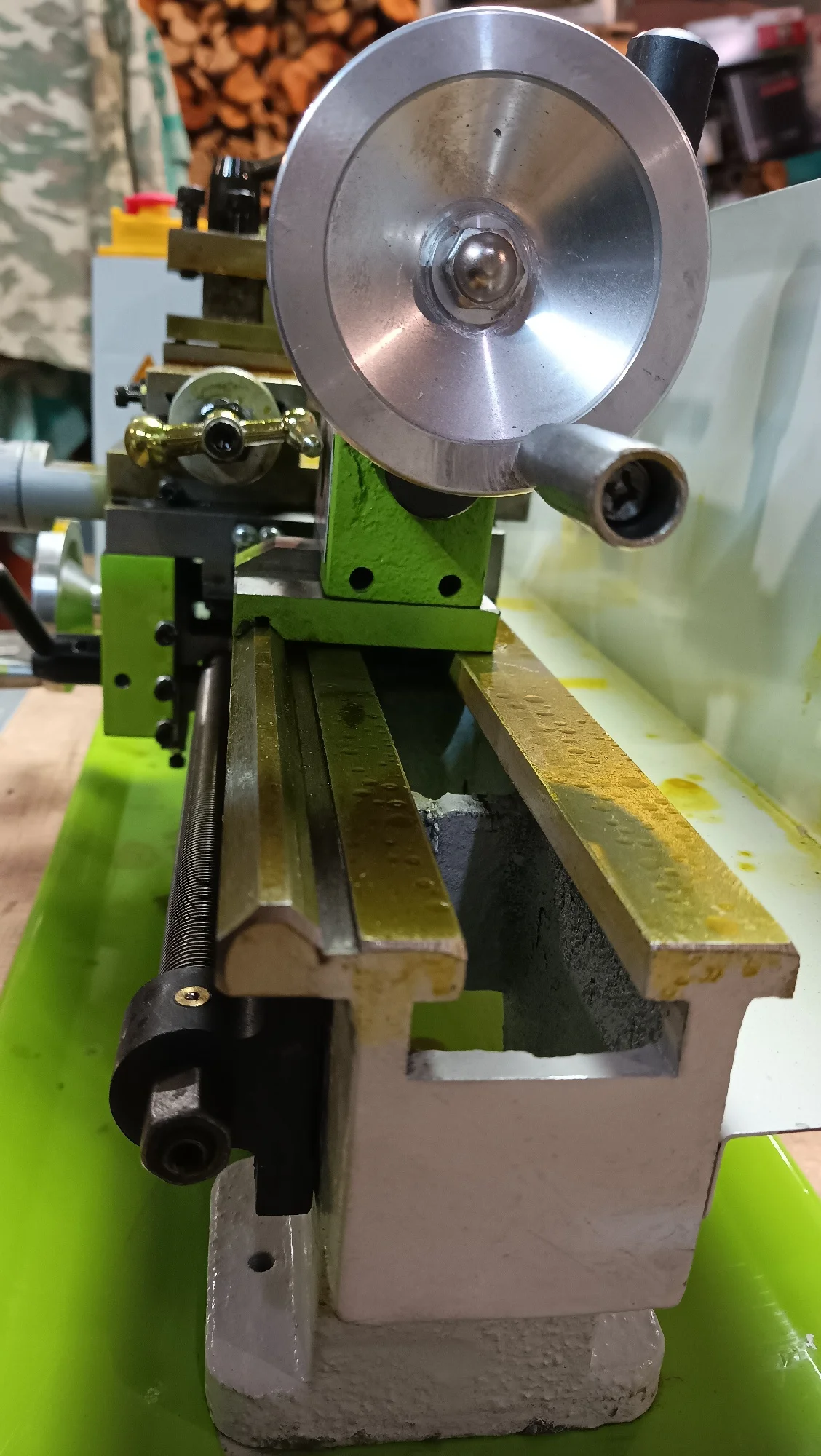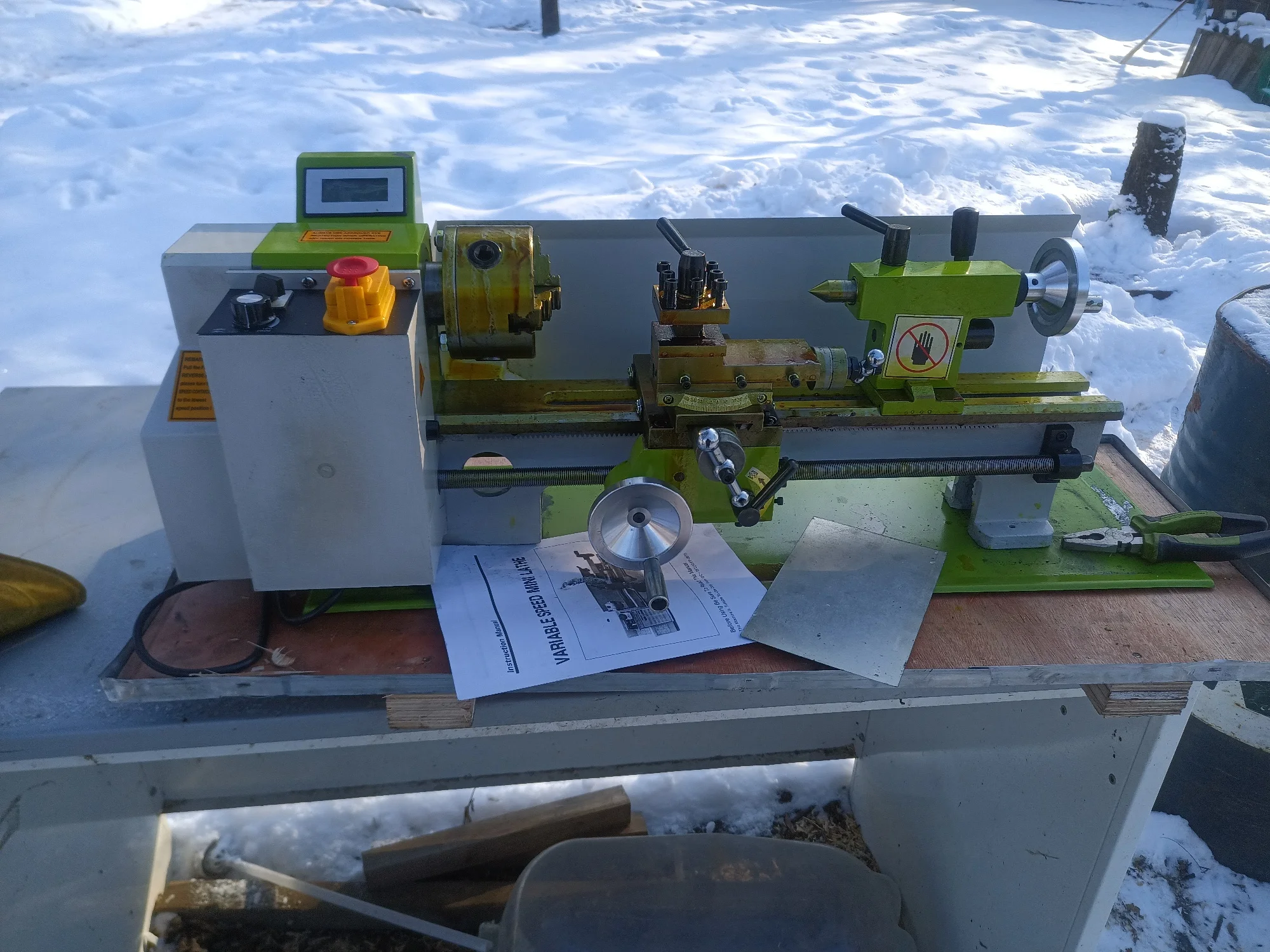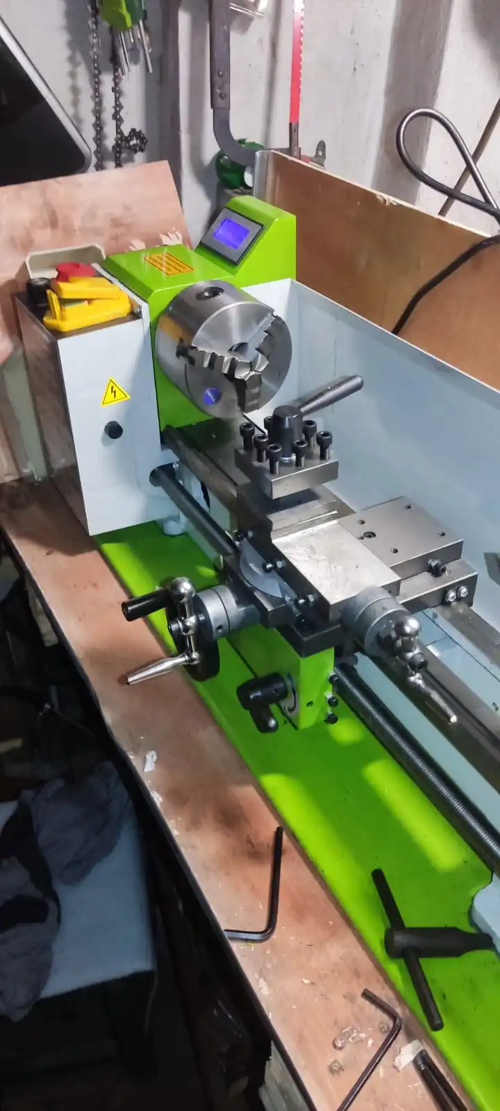 Станок доставили за месяц с копейками (хотя у продавца до самого закрытия заказа висел статус "ожидает передачи в транспортную компанию"). Фанерный ящик был практически не коцаный, НО-станок внутри закреплён не был и болтался как известная субстанция в проруби, из-за чего пострадал юзер мануал (к счастью не критично) и лист металла-типа поддон. Консервационной смазки не пожалели, отмывал бензином и это заняло немало времени. Комплектация небогатая-обратные кулачки для патрона, ключи для регулировок и обслуживания, резиновые ножки и...всё(( О самом станке-кожухи мотора и электроники очень хлипкие, не консервная жесть конечно, но металл достаточно тонкий и соединения так себе. Кожух гитары из толстого пластика, который выглядит и ощущается надёжнее металлических. Сама гитара...как бы это сказать...звучит как настоящая гитара с дисторшном. Люфты на осях шестерён чудовищные, в процессе работы (особенно при автоподаче слева направо) шум стоит такой, что даже бензопила кажется не таким уж громким инструментом. На шкале регулировки скорости вращения указаны диапазоны оборотов 50-1500 и 100-2500, но передача у станка только одна, и порог от 134 об/мин. Ну да ладно. В каретке люфты подвыбрал (кроме штурвала перемещения всей каретки, там люфт градусов в 15), но жёсткости у неё всё равно маловато. Резюмирую: для небольших и не очень точных работ в условиях гаража вполне пойдёт, есть ощущение, что я изрядно переплатил за это изделие.