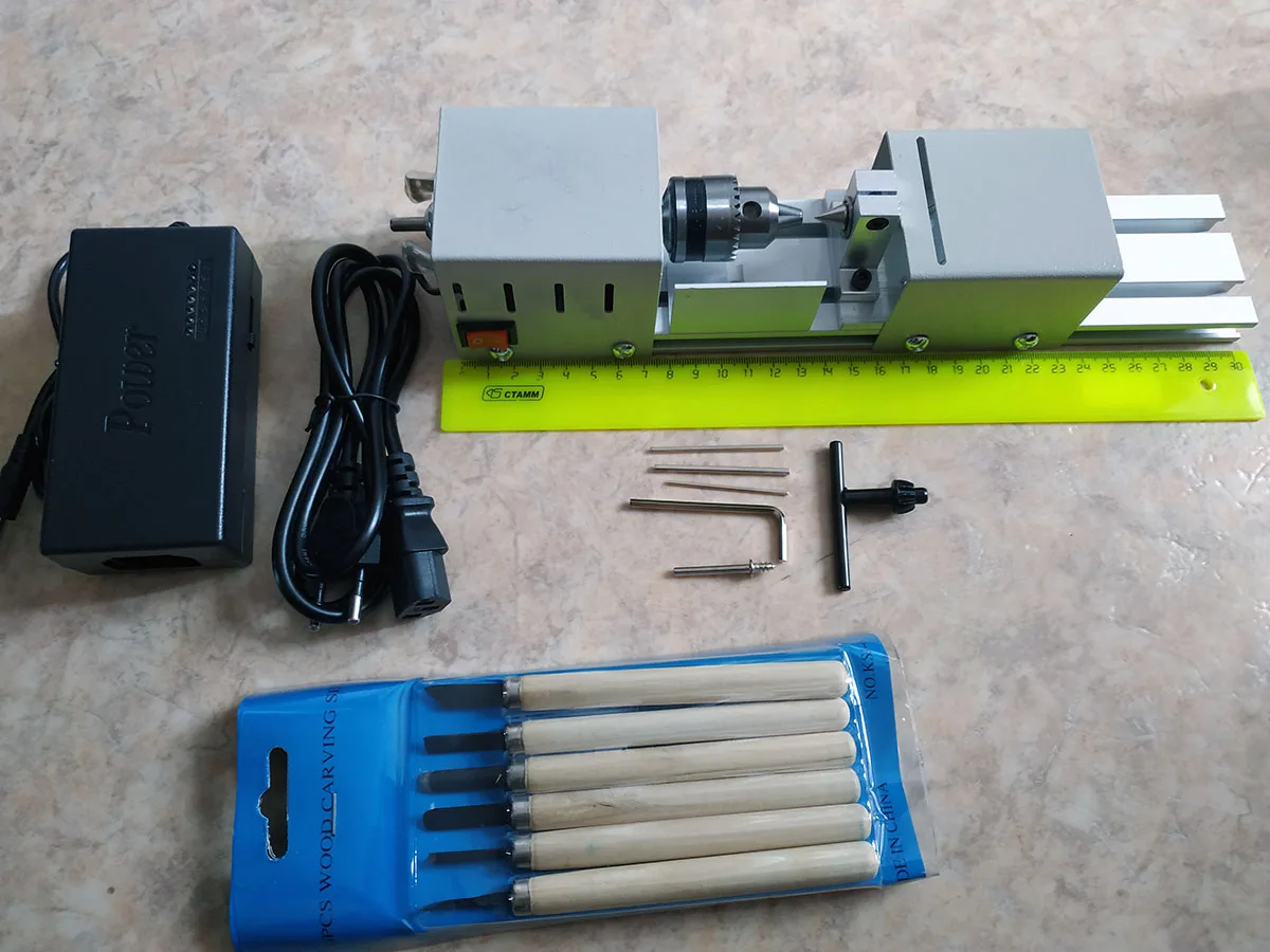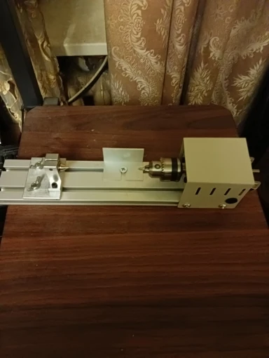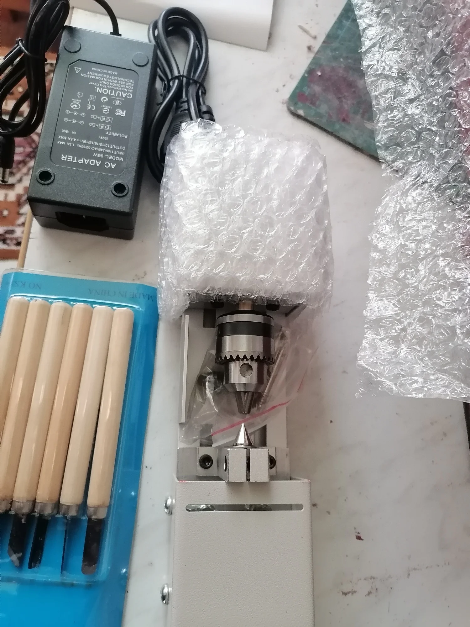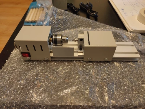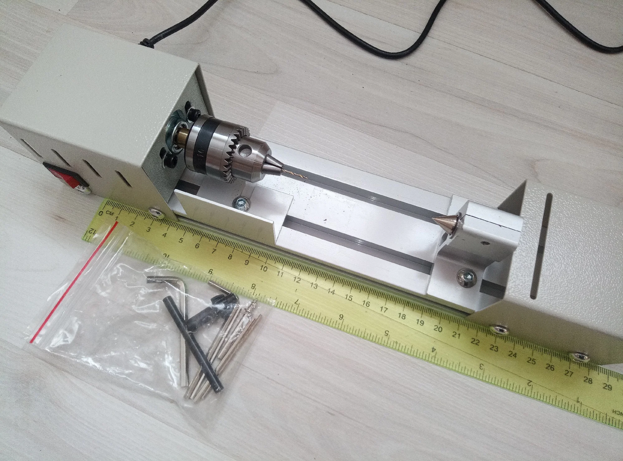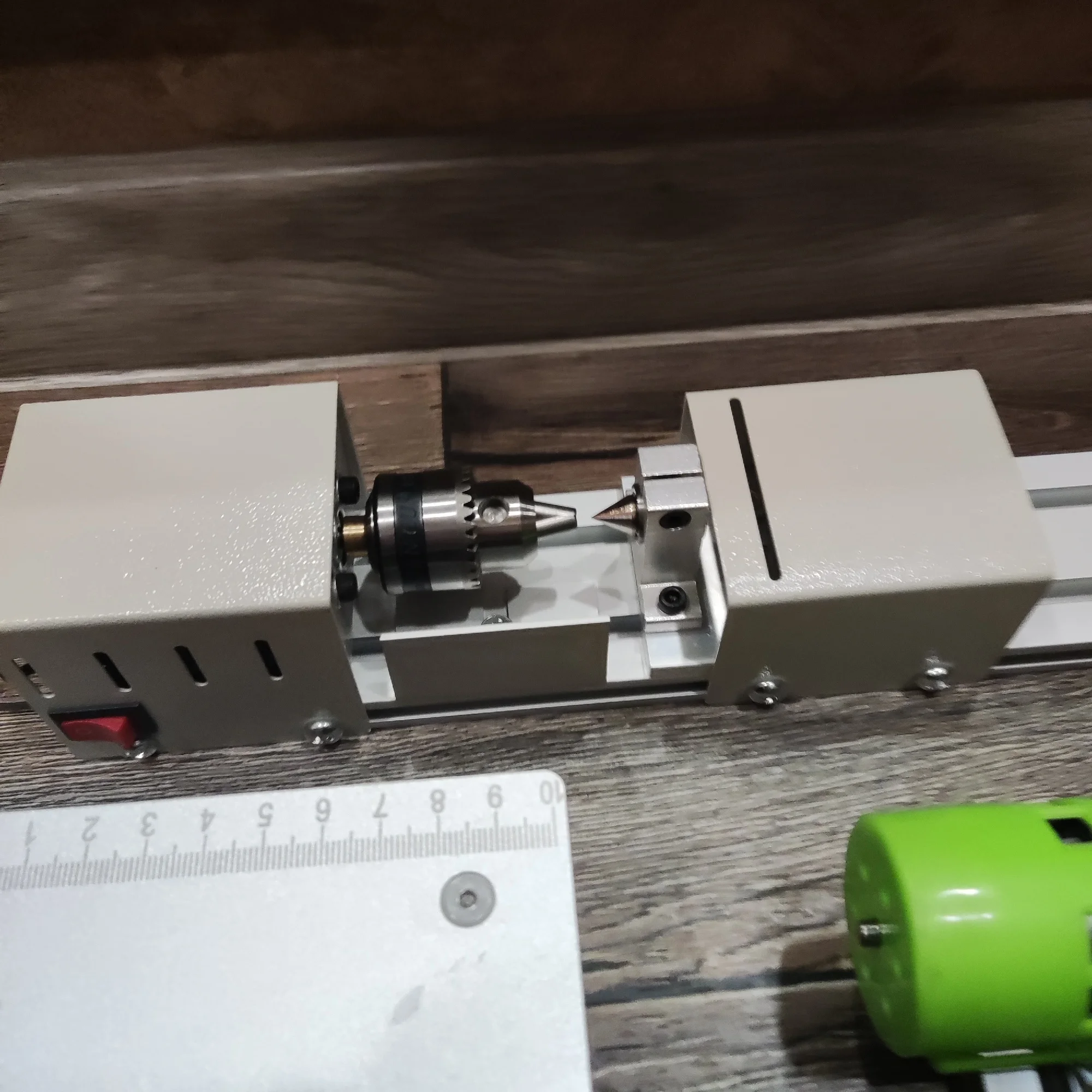 Станок получил- спасибо. Доставка из России вообще не понятно кем и не каждый сайт может отследить продвижение, но принёс домой курьер - не плохо. Сам станок является наверное лучшим вариантом, чем колхозить из дрели. Расстояние от оси до станины 28 мм, максимальное от патрона до упора задней бабки около 17 см, ширина упора для Резцов 52 мм, максимальное приближение упора к оси вращения 25 мм. Металл Резцов без фанатизма рукой не гнётся, но как что-то режущее - не алё, заточку не держит. Упор, вставляемый в патрон, винтовой, при обработке мягкого материала проворачивается в детали. Задний упор-конус просто вставлен в подшипник, легко вынимается, соосность нужно ловить перемещением бабки. В общем есть над чем поработать для улучшения станка, в целом не плохо. Моторчик крутит уверенно, скорости вращения регулируются на блоке питания - 7 режимов.