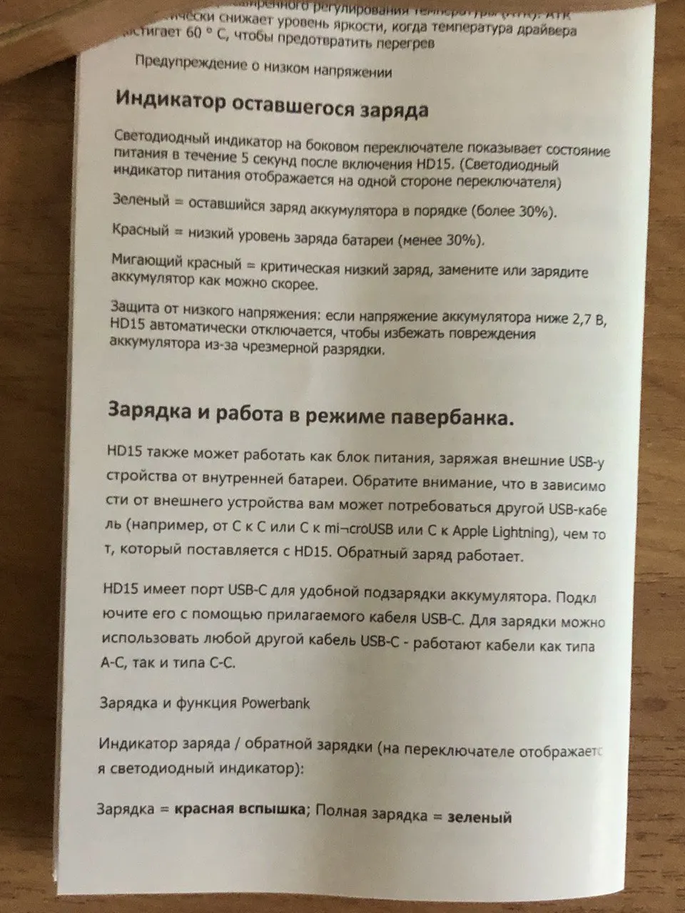 Это уже третий HD15. Добрался из Китая до Уфы за рекордные 8 дней! Ниже опубликую свой отзыв на первый приобретённый фонарь, так как он по каким-то причинам отсутствует в отзывах. Первый фонарик был на 4000К. Постскриптум в конце относится к последнему приобретённому фонарику. ********************** Оказался немного больше, чем ожидал. Тёмно-зелёный цвет корпуса весьма понравился. Сначала о хорошем ). Ближний свет весьма хорош -- приятный тёплый оттенок(4000К), цветопередача, равномерность освещения, угол шире(в меру) чем у скиллхант h03, что для меня было важным и определяющим. Так как фонарик брался в основном для работы руками. Теперь о грустном -- это заметно отдающий зеленью дальний свет. Причём, самое смешное, что это становится явно заметным при переключении с абсолютно правильного ближнего света на Дальний. К тому же он ещё и теплее, и почему-то пятно засвета имеет немного овальную форму. Но Это уже мелочи по сравнению с уклоном в зелень(на фото не видно, вытягивает авт.бал.бел.). Картину спасает включение дальнего вместе с ближним. Moonlight реальный, как любят гурманы с фонарёвки, актуален только в полной темноте, разглядеть что-либо в руках, не разбудив остальных. Я бы лучше предпочёл ещё один режим ближнего света между min и med. Впрочем med режим и так неплохо попадает в необходимый диапазон яркости(при работе руками), Правда яркость будет несколько меняться в зависимости от уровня заряда аккума из-за отсутствия стабилизации. В самом начале немного ярковат, под конец тускловат, но глаза вытягивают динамический диапазон. В плюс "Дальнему" свету -- хорошо подобран размер светового пятна, лишнего не заужен, что на мой взгляд очень хорошо, По факту свет для средне-ближних дистанций, пешей прогулки -- на мой взгляд, для налобника в самый раз. В верхних режимах фонарик заметно нагревается(в турбо довольно быстро), что свидетельствует о хорошем теплоотводе. Зарядка током до 2A на мой взгляд явно многовато для 18650. Это можно обойти подбором зарядника на 1А. Заряжает примерно до 4,17-4.18В. Можно немного дозарядить переподключением. С моим OTG кабелеи телефон жалуется на низкий ток обратной зарядки. Навскидку где-то 0,5А. Порадовало наличие трубки на 18350, с ним пользоваться фонариком комфортнее, не приходится сильно затягивать резинку. Комплектный аккум при первичном заряде/разряде током 0,7/0,5А выдал почти 3Ач(добавил фото с тестом последнего). При чистых контактах показометр Lii-500 определил 30-25мОм, как на среднетоковых Sanyo. Резиновые кольца крепления хорошо подходят под формат AA(14500), но натягивать их на 18650 и поворачивать фонарик -- то ещё развлечение )). Сразу убрал в коробку. Заказал пластиковое, быстросъёмное крепление, а-ля как у D10. В целом плюсы затмевают недочёты, я покупкой доволен, да ещё и по распродаже. Могу рекомендовать -- многим оттенки вообще до звезды )). ****************** PS: у данного экземпляра как и у двух предыдущих что-то не то с термоконтролем. При комнатной температуре 26° в режиме HI на двух светодиодах фонарик через 11 минут разогрелся до 60° на корпусе в головной части, но так и не снизил яркость, только незначительно, из-за отсутствия стабилизации. Дальше насиловать не стал -выключил. 6мин - 50° 8мин - 55° 9мин - 57° 10мин - 59° 11мин - 60° Оценка снижена из-за этого факта. Ещё заметил что у данного экземпляра(5000К) оттенок ближнего чуть холоднее(ближе к 5000К), чем у предыдущего(второго при