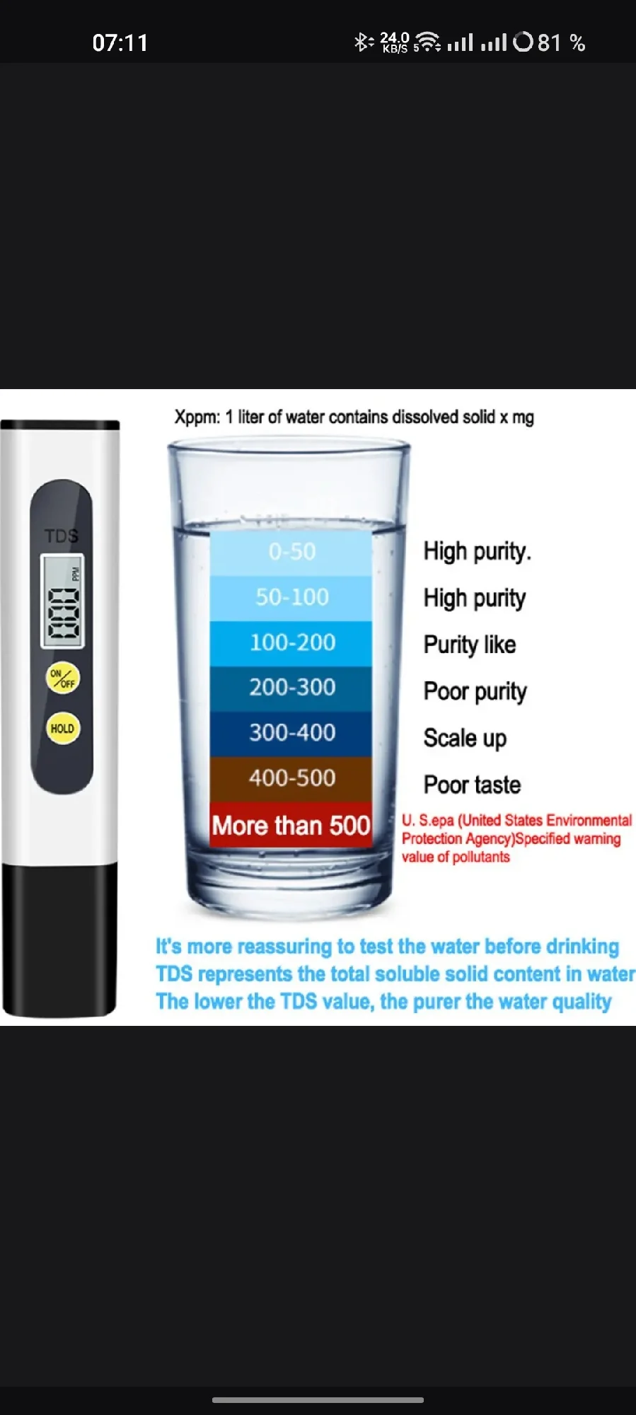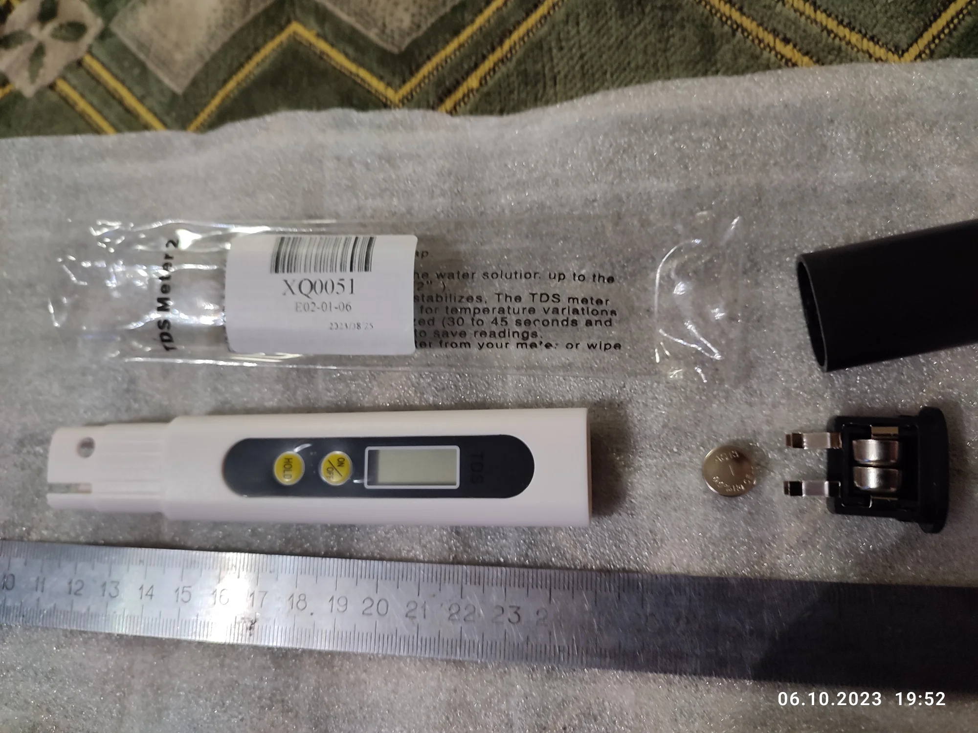 Пришло без батареек.Батарейки двеLR44 или аналоги из фикспрайса.Вроде какие то измерения показывает.Вода из водомата показала 019.Вода из под фильтра аквафор 258.Вода из обычного крана 260.Если верить этому прибору,то вода из крана и вода из фильтра(тройной очистки 1.фильтр грубой очистки2.фильтр умягчения3.угольный фильтр.)почти одинакового значения.Получается,что фильтр нихрена не фильтрует....Не знаю чему и верить.Всем мира и добра.