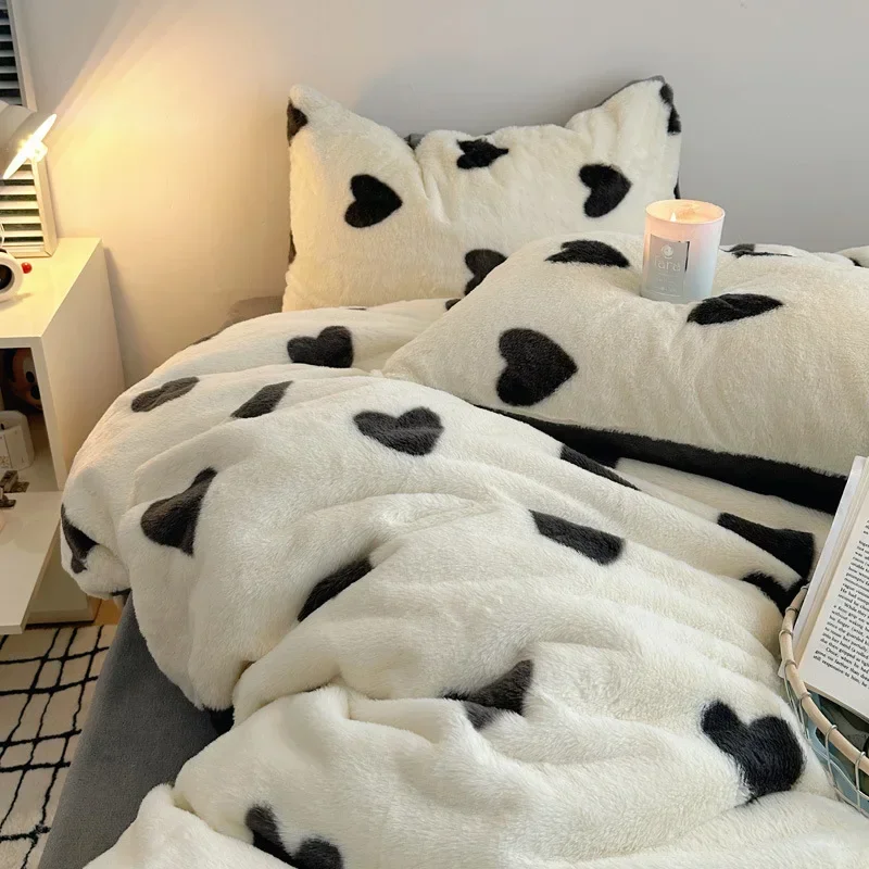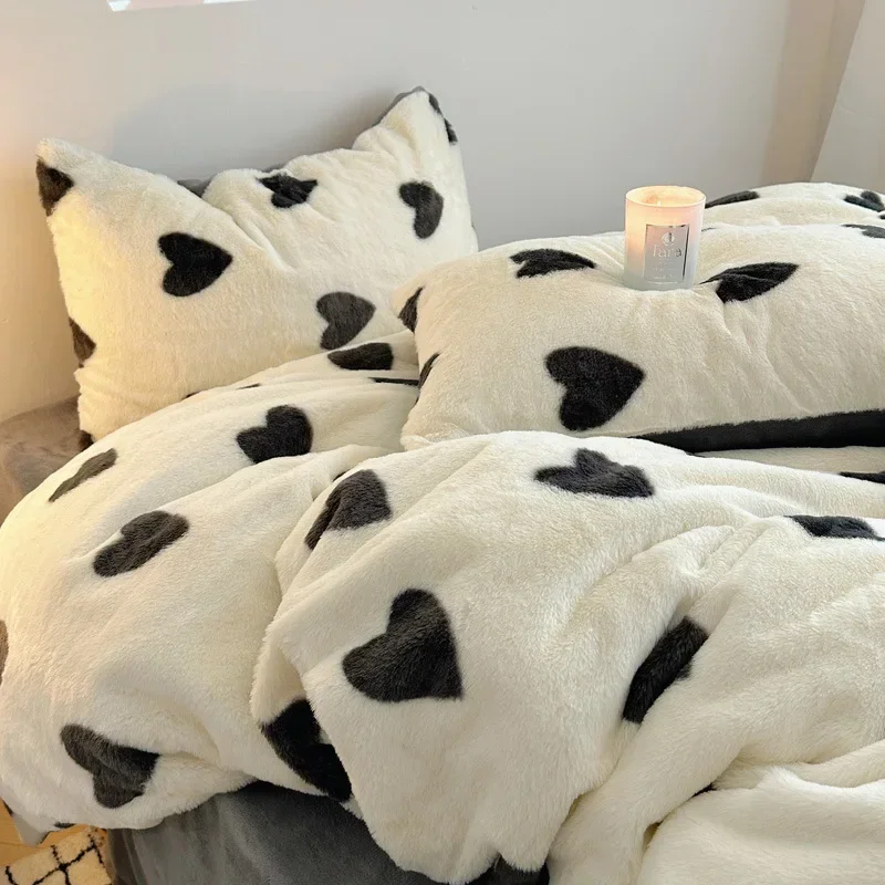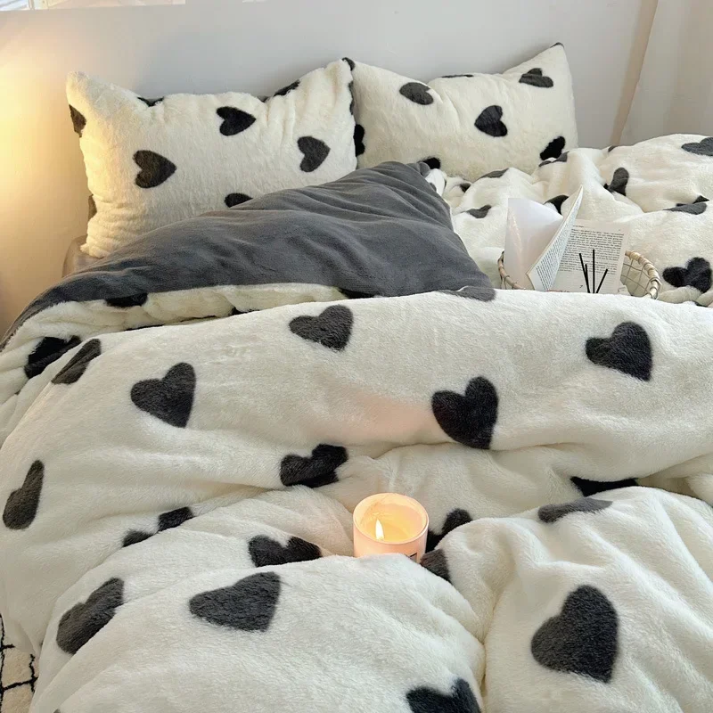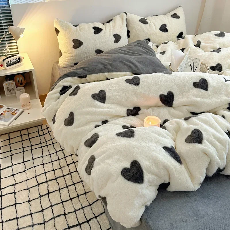 Зимний утолщенный бархатный теплый комплект постельного белья с милым рисунком сердца, пододеяльник, простыня, наволочка, 4 шт., роскошный двойной комплект пододеяльников