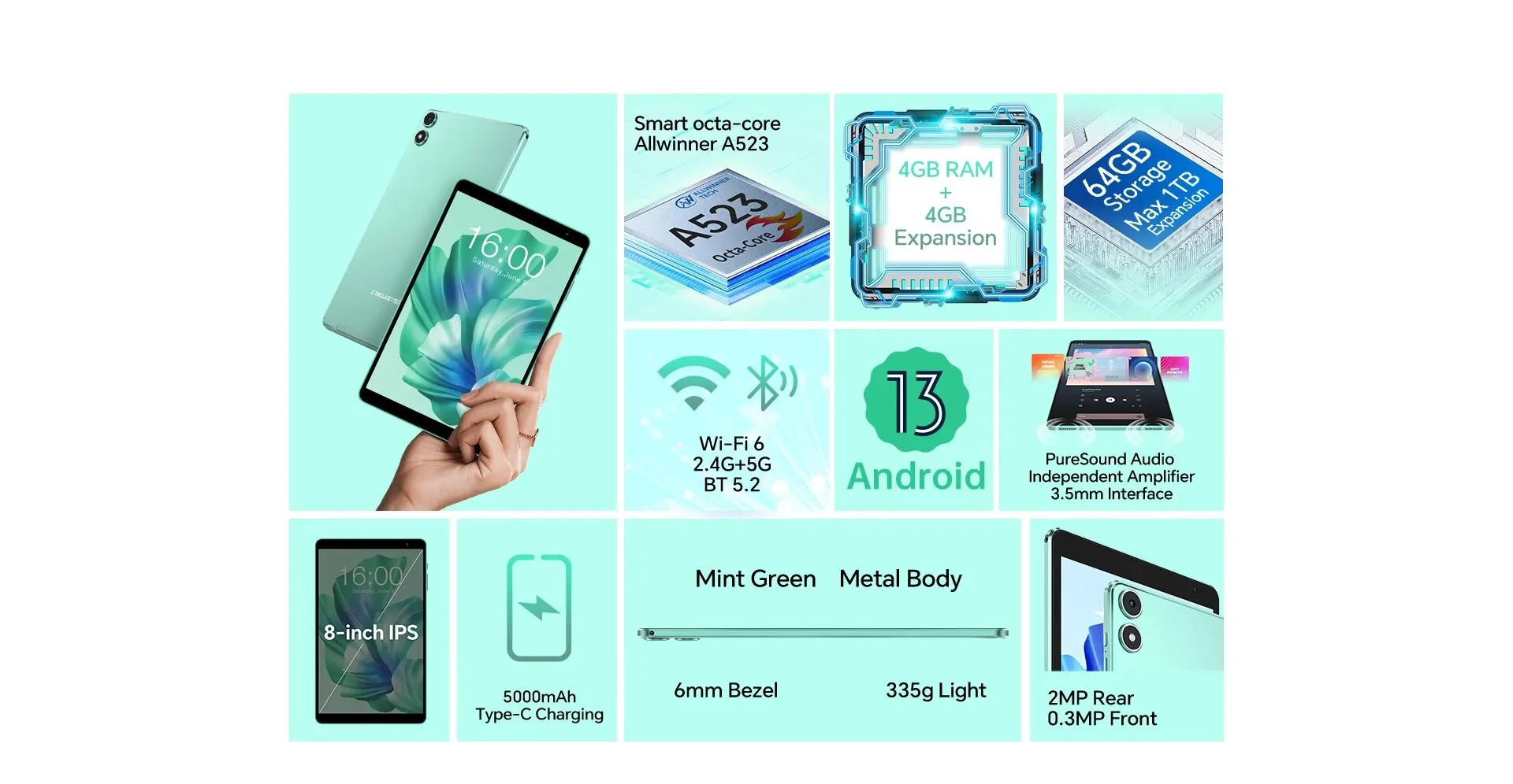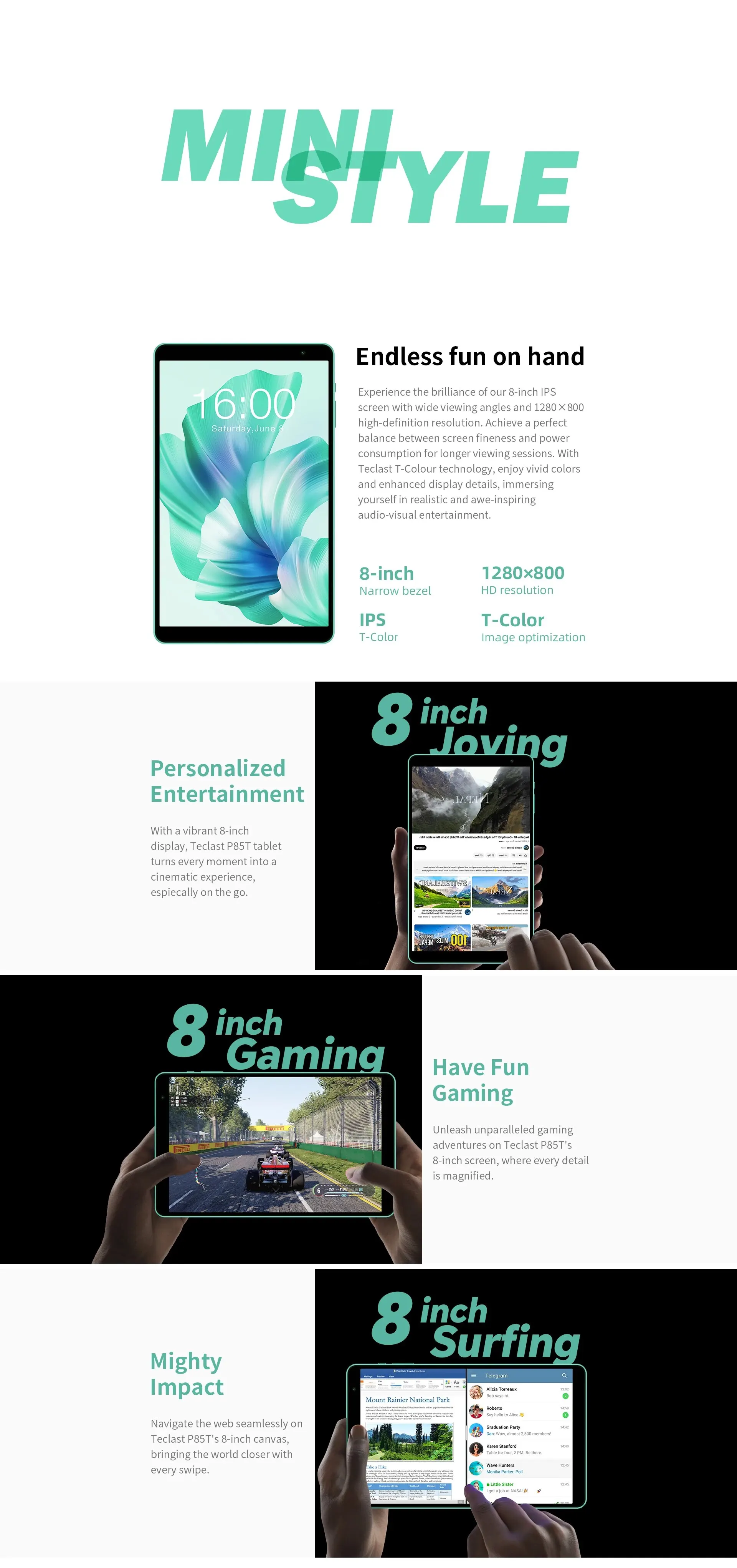 • Дисплей с высоким разрешением :Планшет оснащен 8-дюймовым дисплеем с разрешением 1200*800, предлагающим четкие и яркие визуальные эффекты для захватывающего просмотра.
