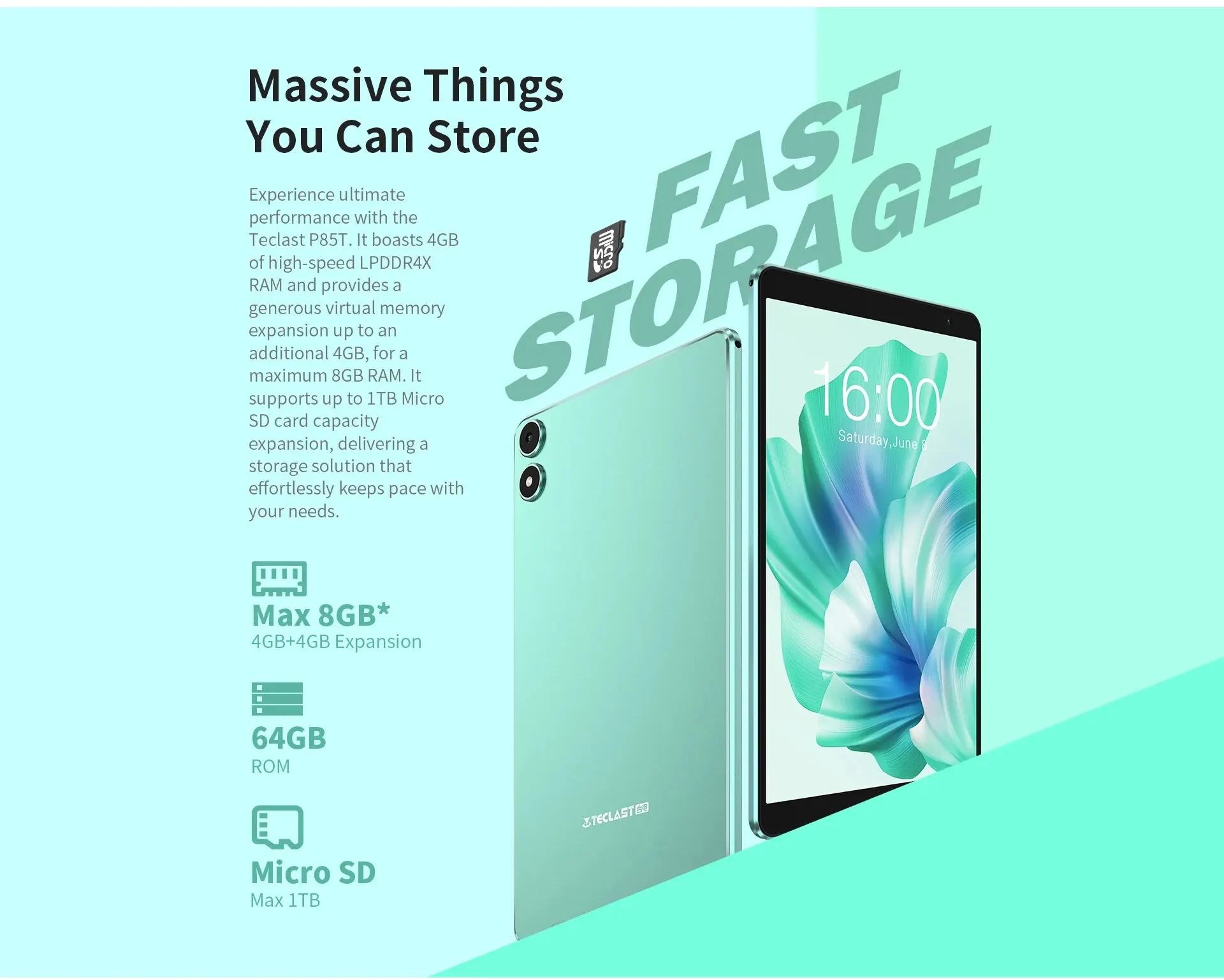 • Аккумулятор с длительным сроком службы :Обладая аккумулятором емкостью 5000 мАч, планшет Teclast P85T гарантирует длительный срок службы батареи, позволяя вам оставаться на связи весь день.
