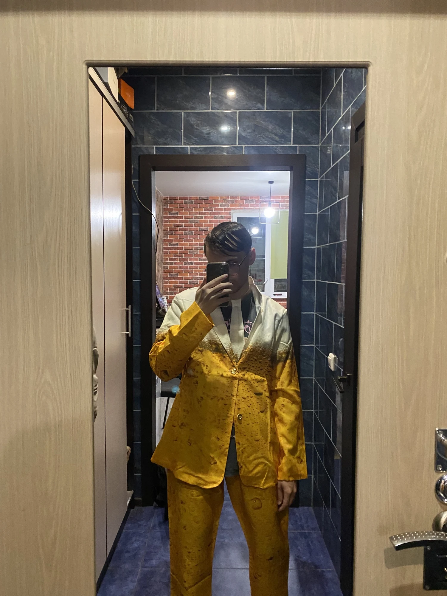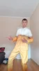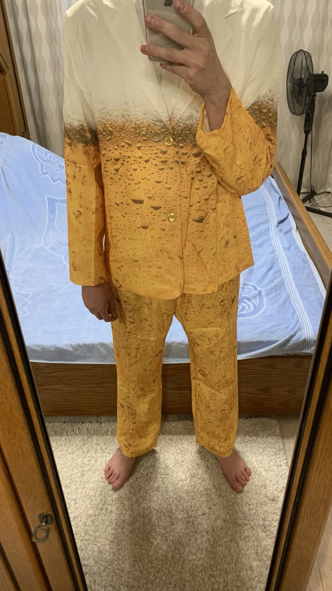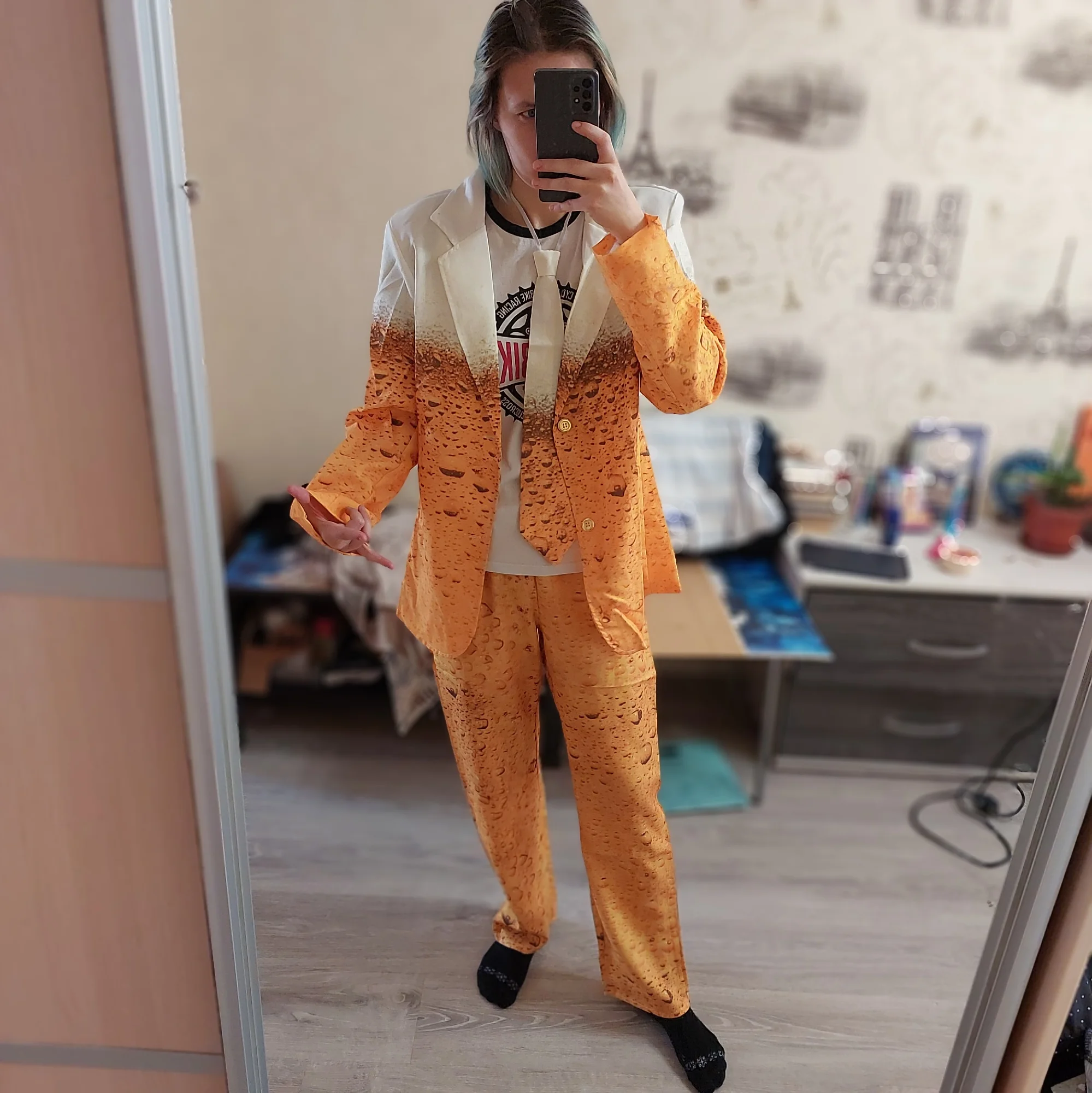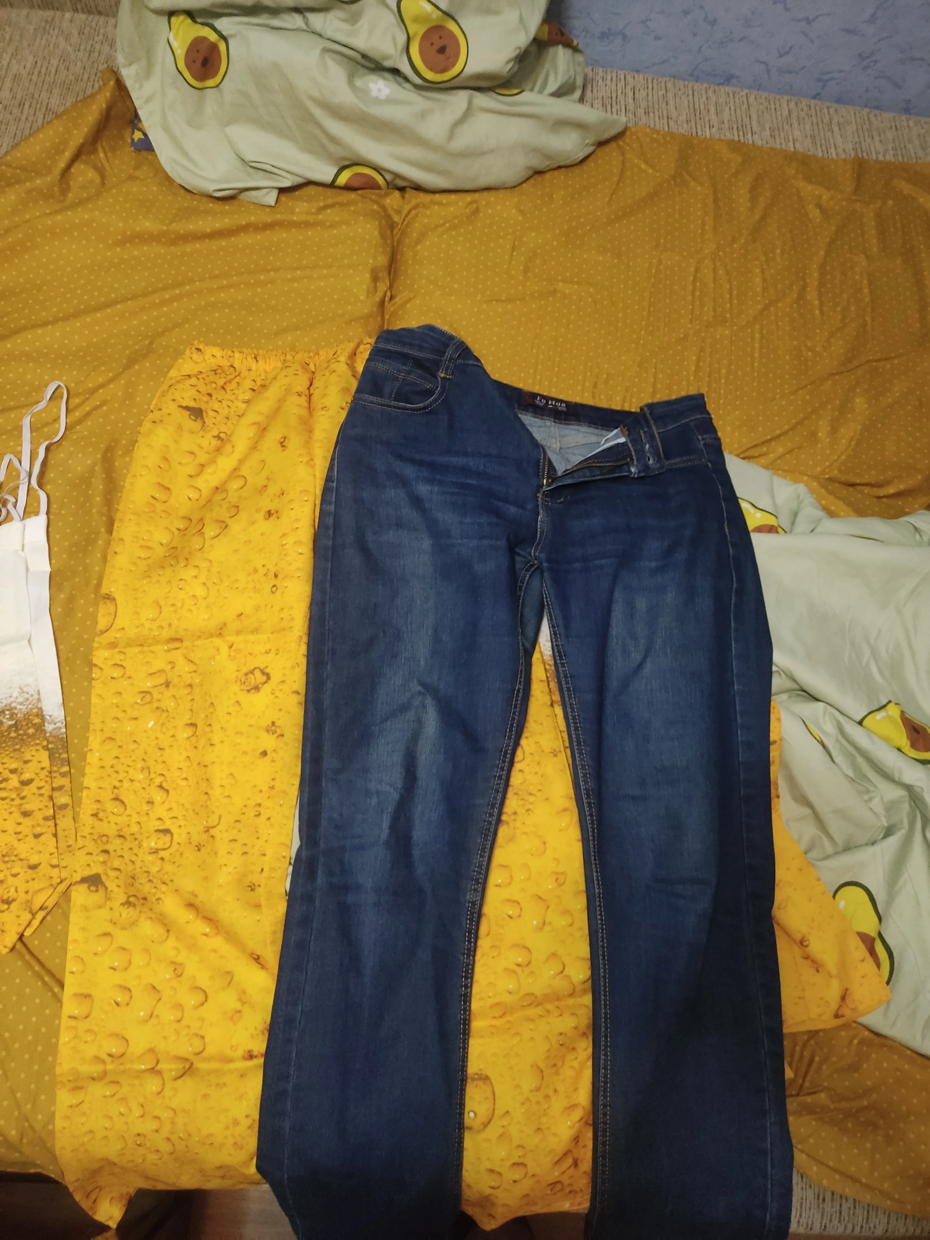 Качество ткани отвратительное, синтетика, ничего не тянется, как будто в плёнке, а не в костюме. Ещё и маломерят, брала себе L, парню XL, в штаны не влезла. Специально измерила всё перед заказом, в сетке было указано, что L на бёдра 110, а у меня 107, даже на зад не натянула, просто кошмар, деньги на ветер. Фото штанов костюма размера L и моих джинсов размера L