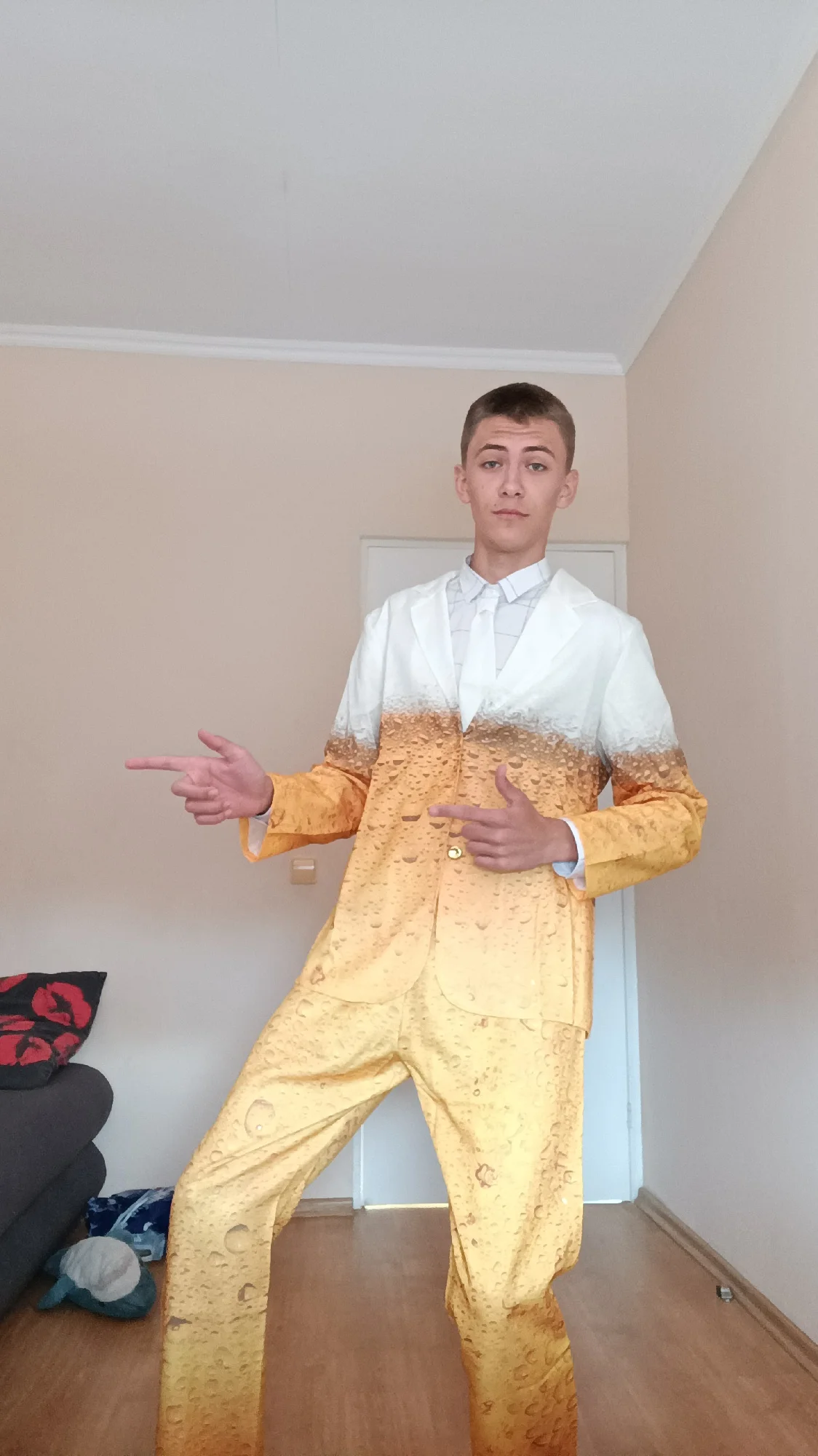 Хороший костюм за свои деньги. однако на брюках я бы добавил петли под ремень. По умолчанию штаны на резинке (под пиджаком не будет видно)