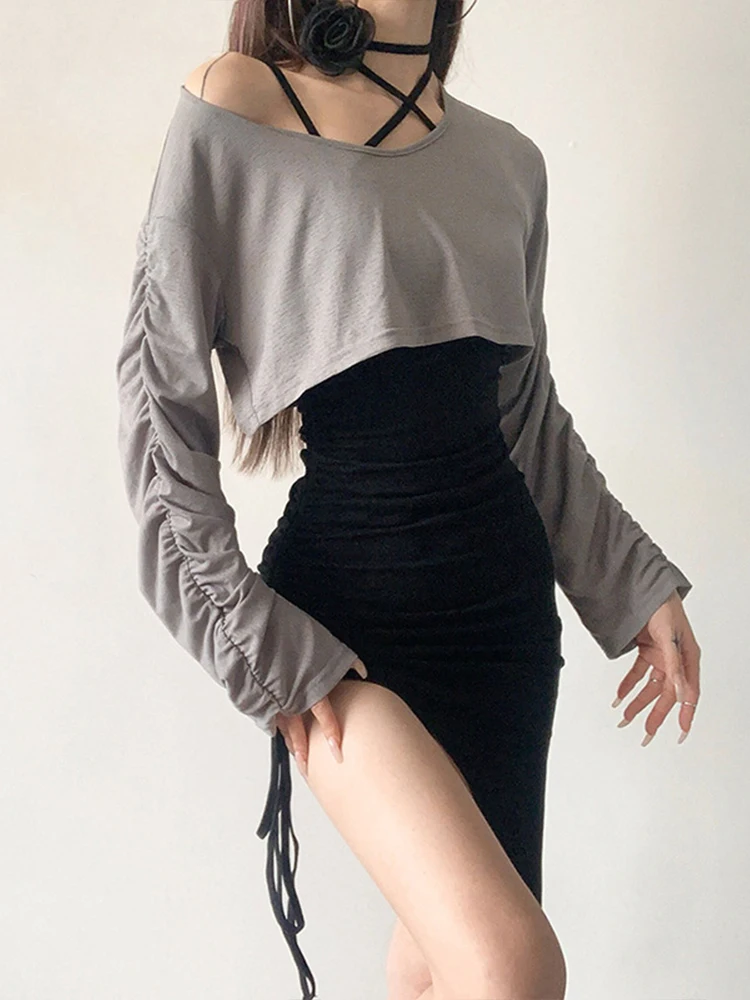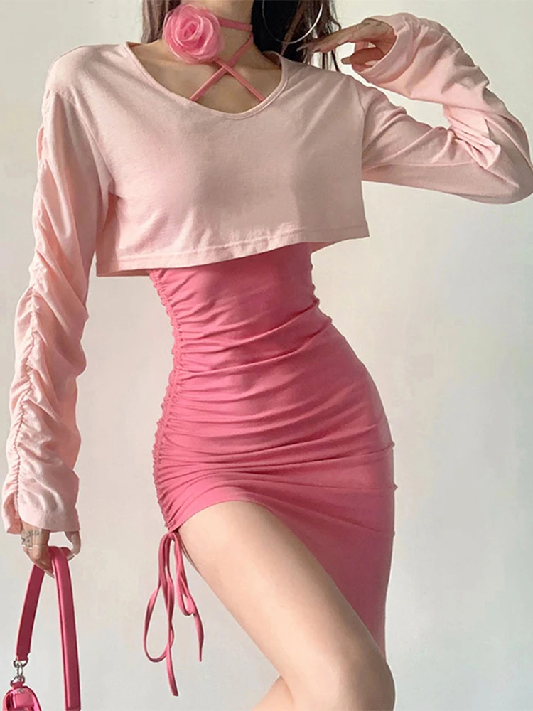 Милое розовое асимметричное платье, женское приталенное соблазнительное платье со шнуровкой для зрелых девушек, короткий топ с длинным рукавом, женские комплекты из двух предметов