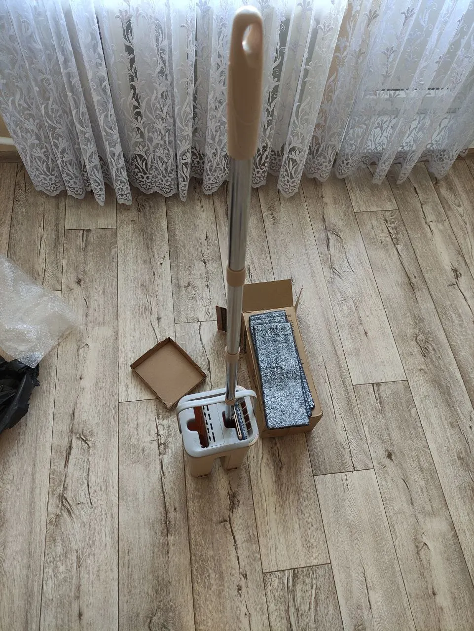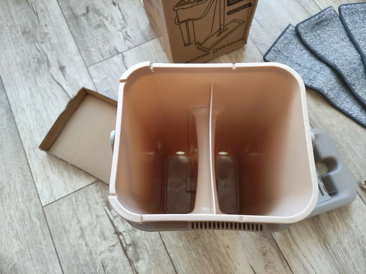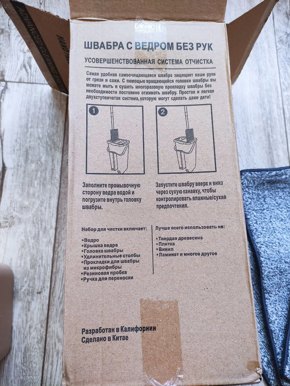 Заказываю тут 2й раз.1й раз пришла отличная швабра,в коробке с рисунком, с инструкцией, со сливами снизу. Из мягкого толстого пластика, удобное ведро с удобной ручкой посередине. Отлично выжимает и чистит тряпку.Мне очень понравилось и я купила такое же в подарок родителям.Но пришло что-то непонятное.В непонятной коробке без надписей,маркировки и инструкции.Без сливов и из тонкого блестящего пластика. С белыми тряпками. Ручка у ведра где то сбоку,а крышка болтается. Отверстие для отжима сильно широкое и швабра, не отжимается! После отжима с нее бежит вода. И так же плохо очищается, так как второе отверстие тоже большое! Если бы мне надо было отжимать руками, я бы купила швабру за 150 рублей! Отвратительная китайская подделка! Сейчас показывала как ей пользоваться, и только наделала луж. Это совсем не то, что обещано. Просто нет слов какая неудобная и бесполезная вещь. Пробовала изменить наклон при отжиме, упирается во что-то внизу, в какой то дополнительный отсек.и еще ведро шатается.