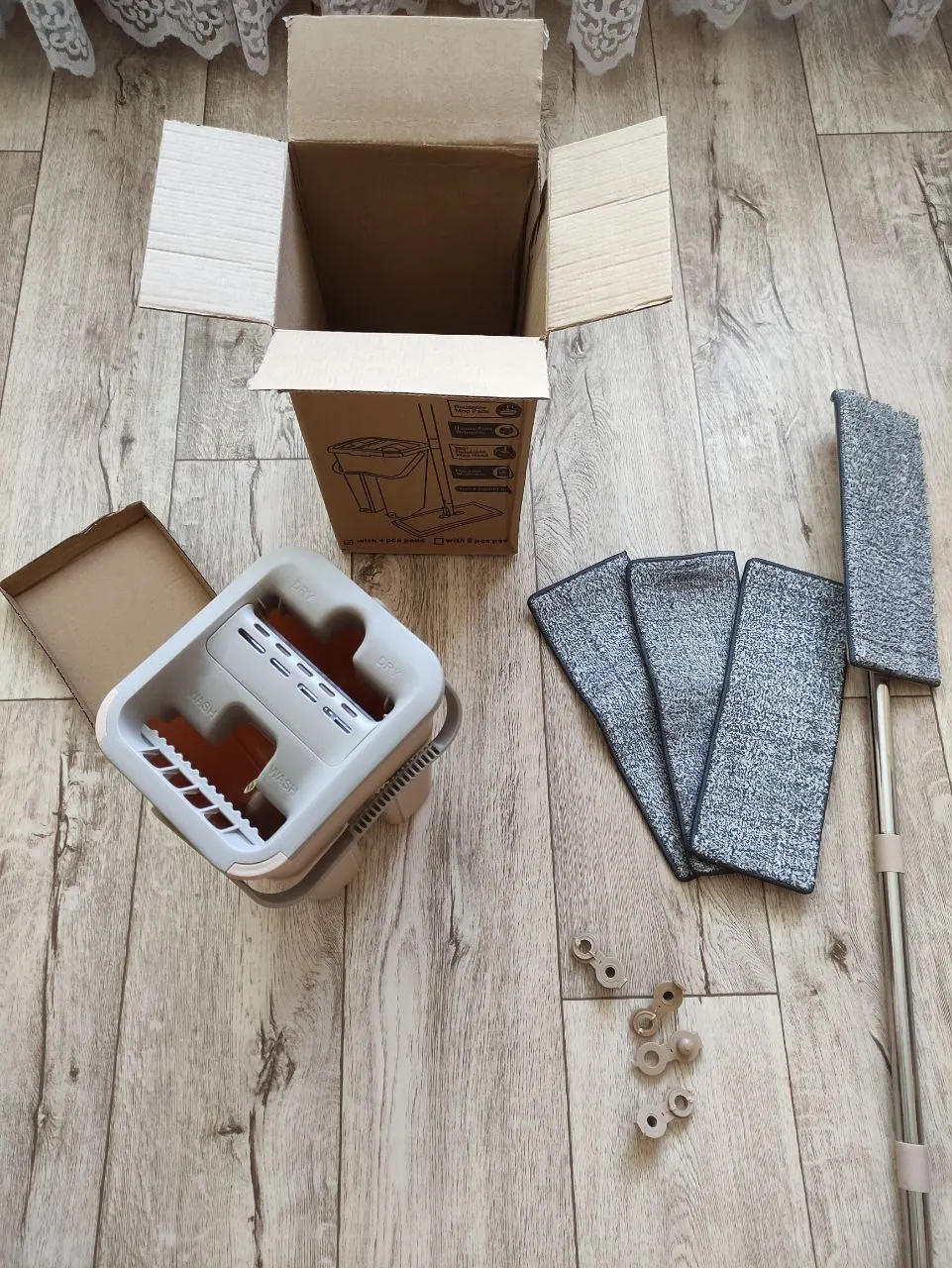 Швабра дошла до Сибири за 6 дней. Комплект запчастей полный, как и указано на коробке. Хорошо моет, в целом мне понравилась, гораздо быстрее получается, чем рачком ползать с тряпкой) Единственный косяк, который для себя подметил - это то что ворсинки от тряпки, когда её отжимаешь, попадают в само ведро и этих "ошмёток" в первый раз было достаточно много, как вариант взял мааленькие сито и сливал в туалет воду через него, вся хрень в сито и попала, ну а что делать!!! Поэтому в целом очень хорошая швабра, в 2-3 раза быстрее моется пол, только такая фигня с ошмётками от тряпки, но это лучше, чем ползать и мыть пол в ручную, поэтому швабру одобряю))