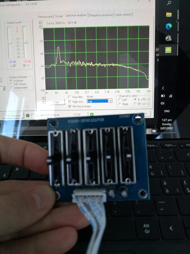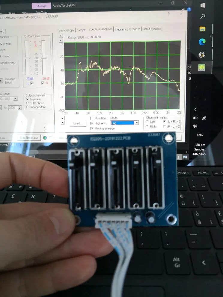 Кажется, работает. Был разочарован тем, что максимальное напряжение основной платы питания составляет 220 В, поэтому он не будет работать в странах с 240 В. Я извлекла трансформатор и добавила 2x9 в батарейных разъема. Эквалайзер достаточно хорош в усилении частот, но не очень хорош в подавлении их. Я приложил пару спектральных сегментов, показывающих, как эквалайзер влияет на аудио спектр. Я использовал ненастроенный радиошум в качестве входного сигнала для тестирования. В целом я доволен покупкой, качество пайки хорошее, и доски были хорошо защищены с коробкой из полистирола для доставки. Спасибо!Some O. 3 июля 2022