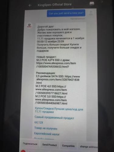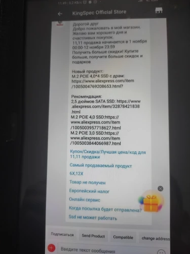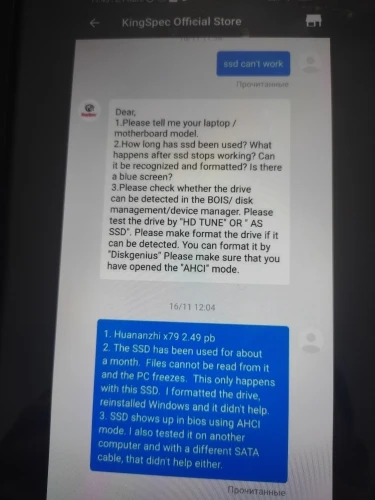 SSD вышел из строя через месяц. На самом деле сломан он был с самого начала, но я не проверил при покупке, все таки это мой 6 ssd от KingSpec и никаких проблем раньше не было. Защита покупателя на алиэкспресс теперь всего 15 дней, так что спор открыть я уже не смог. Написал продавцу, он заверил, что поможет в случае если я скину доказательства его неработоспособности. Это конечно очень обнажило, это ведь оффициальный магазин KingSpec на алиэкспресс и на коробке указана гарантия 3 года. Но после отосланных доказательств продавец стал меня игнорировать. Очень неприятный опыт покупки. Не покупайте у этого продавца! В случае чего ждать от него помощи не стоит. Повторяю, лучше обходите этот магазин стороной! Продавец мошенник! The seller is fraud!Elena K. 23 ноября 2022