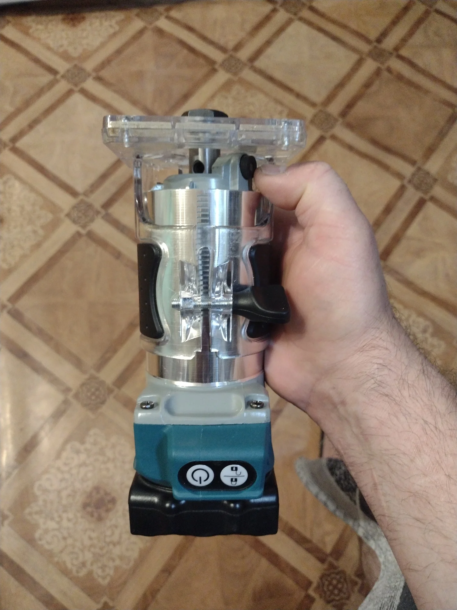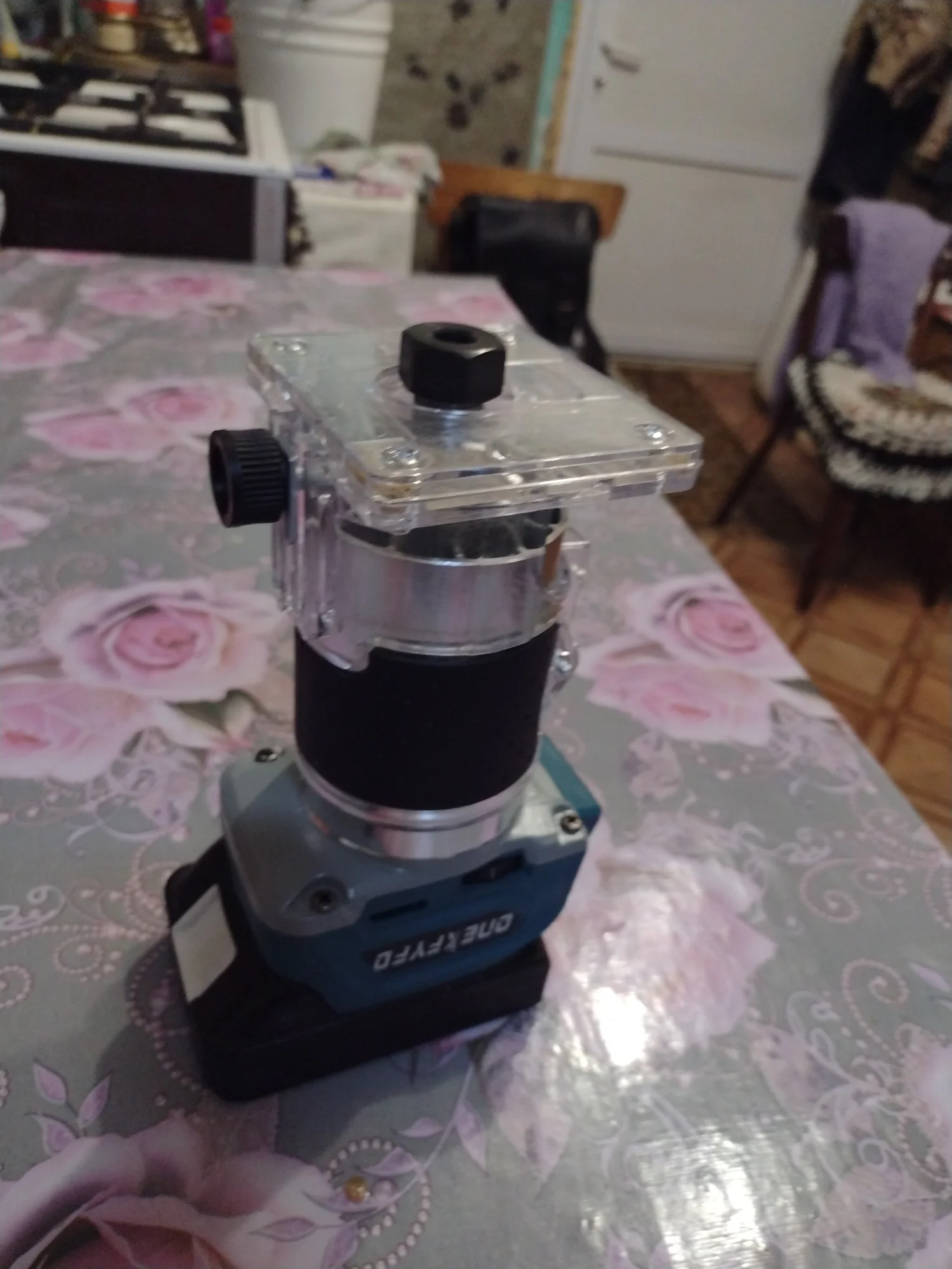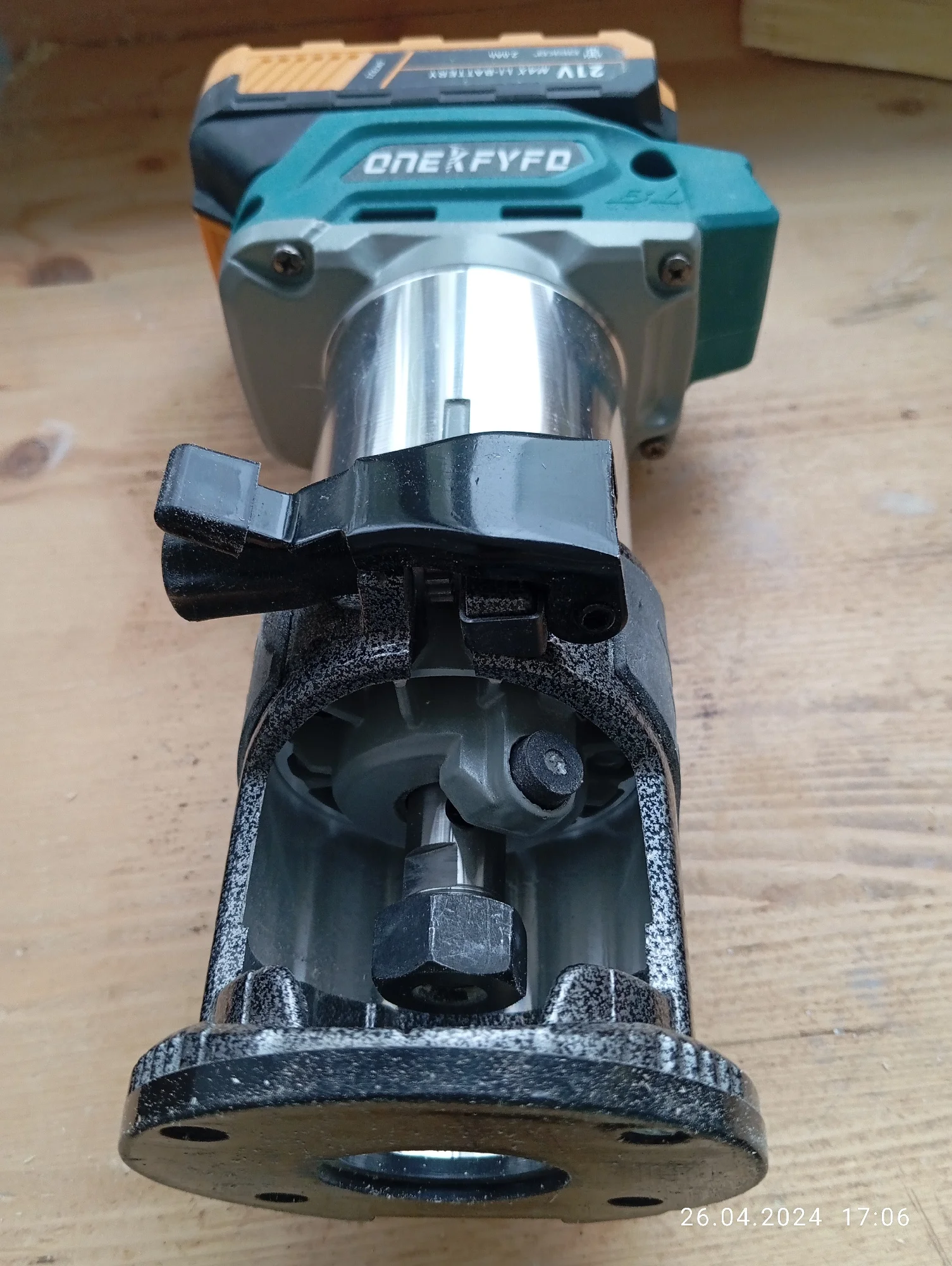 Хороший фрезер, по ощущениям мощность не меньше чем у кромочника макита - прогружная база от макита подходит почти как родная. Из минусов появилось биение на валу с соответствующим визжанием и шумом, оказалось что подшипник установлен в алюминиевый корпус через пластиковую проставку которая плотно сидит на подшипнике но болтается в корпусе - пока решил этот вопрос колхозным способом подмотав немного капронового скотча посмотрим на сколько хватит.