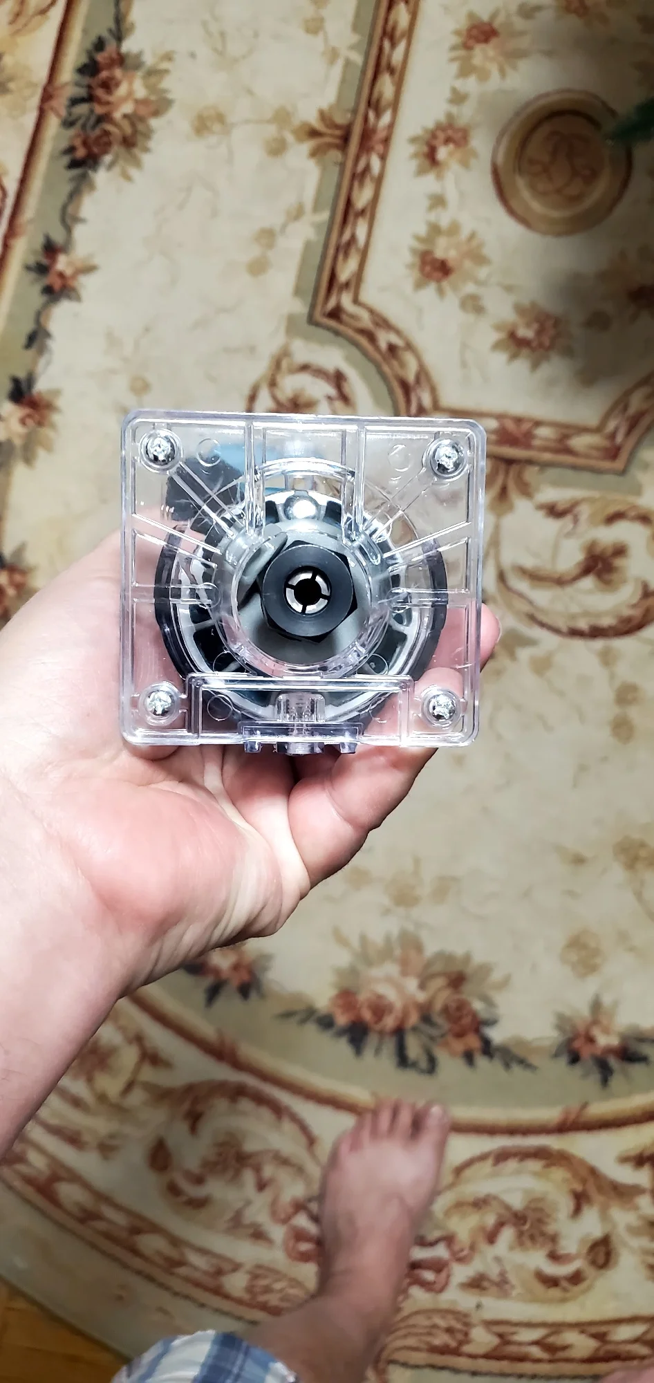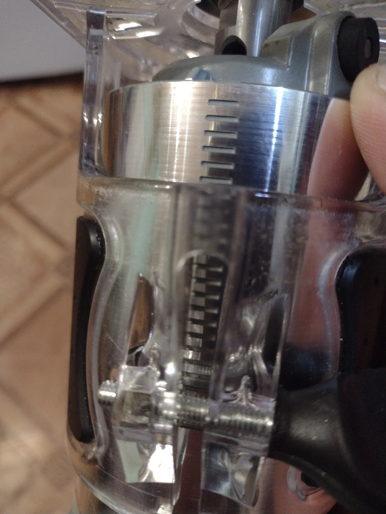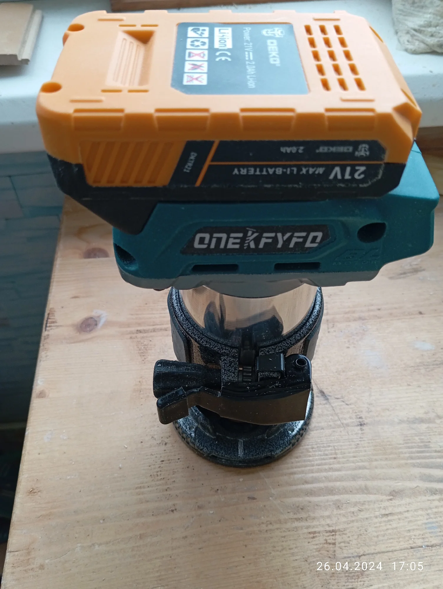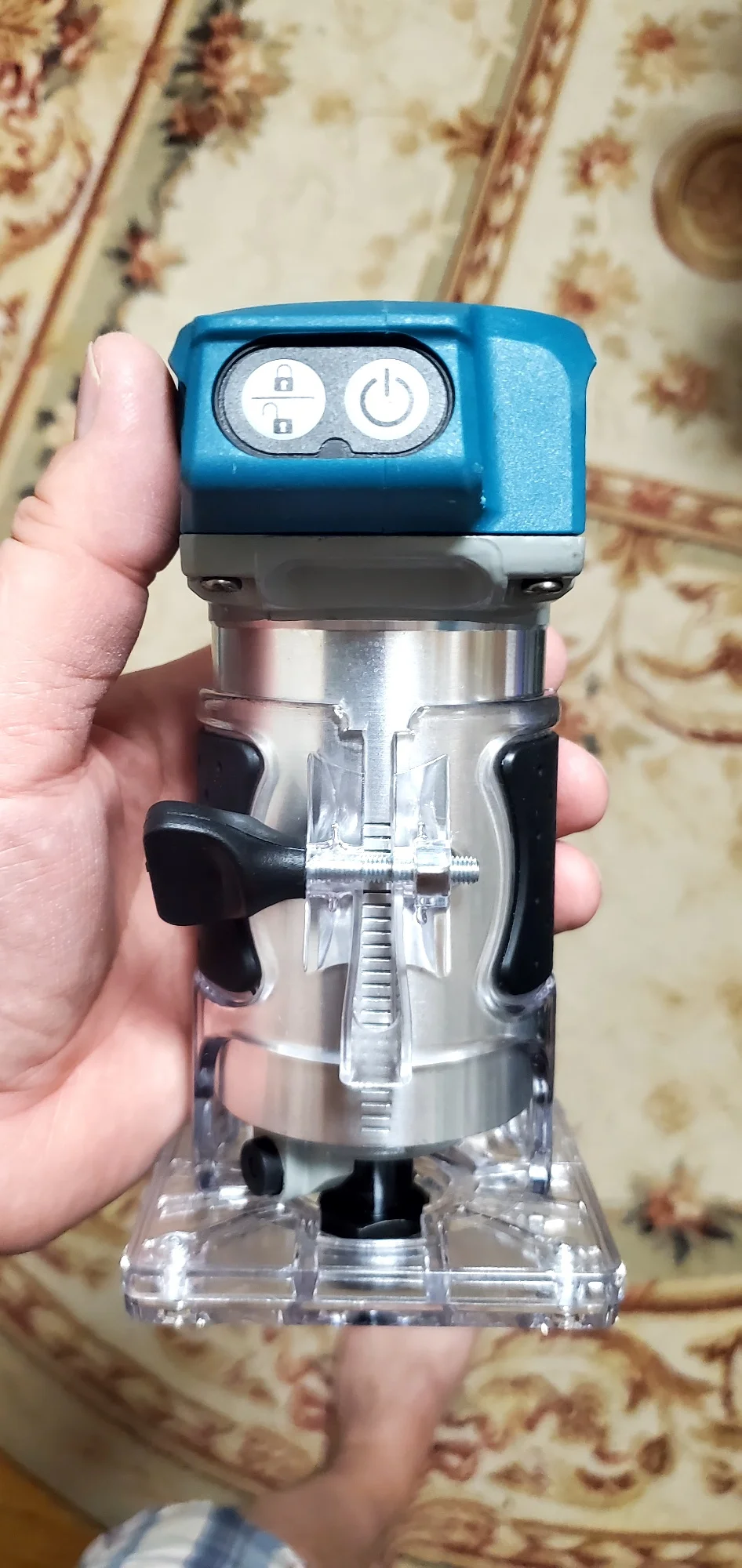 Хороший фрезер, по ощущениям мощность не меньше чем у кромочника макита - прогружная база от макита подходит почти как родная. Из минусов появилось биение на валу с соответствующим визжанием и шумом, оказалось что подшипник установлен в алюминиевый корпус через пластиковую проставку которая плотно сидит на подшипнике но болтается в корпусе - пока решил этот вопрос колхозным способом подмотав немного капронового скотча посмотрим на сколько хватит.