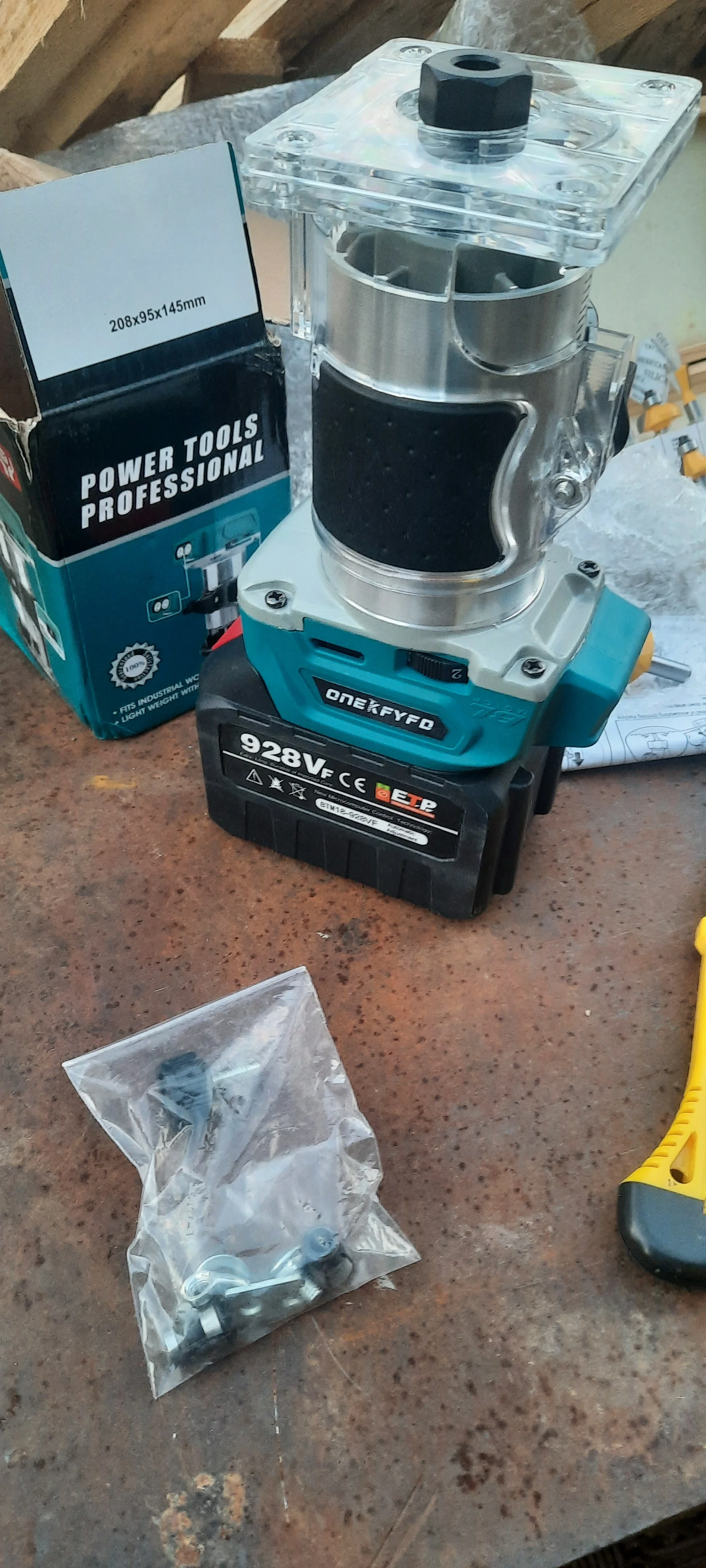 Компактный, работает шустро .только ключ один в комплекте , рамка параллельного упора согнута под другим углом и сам упор из тонкого металла. Плавного старта нет и тормозит резко.есть не большие наплывы на корпусе , заусенцы. Три цанги в комплекте 6. 6.35 .и 8 мм