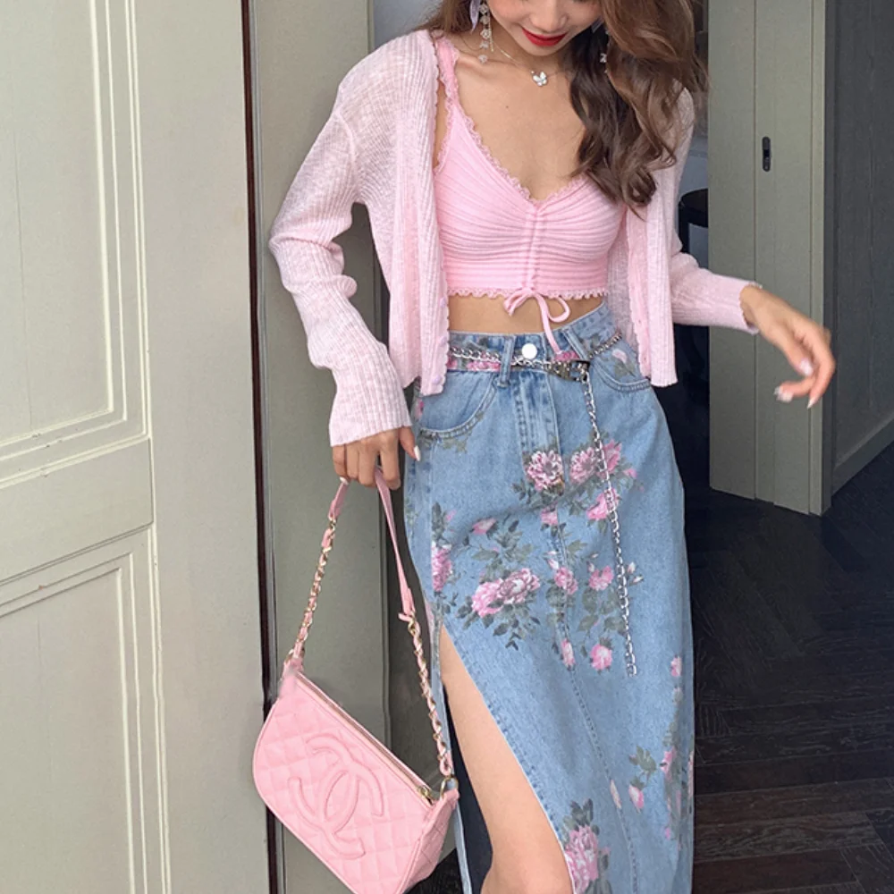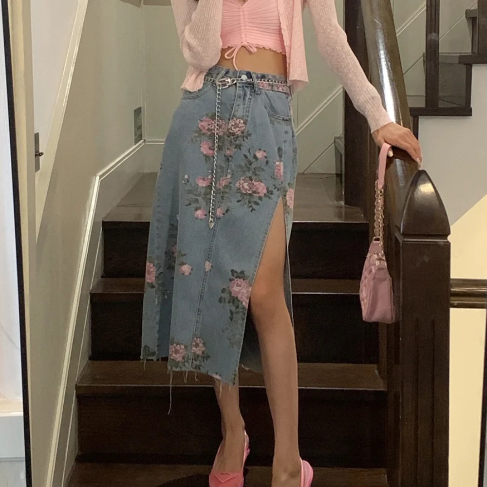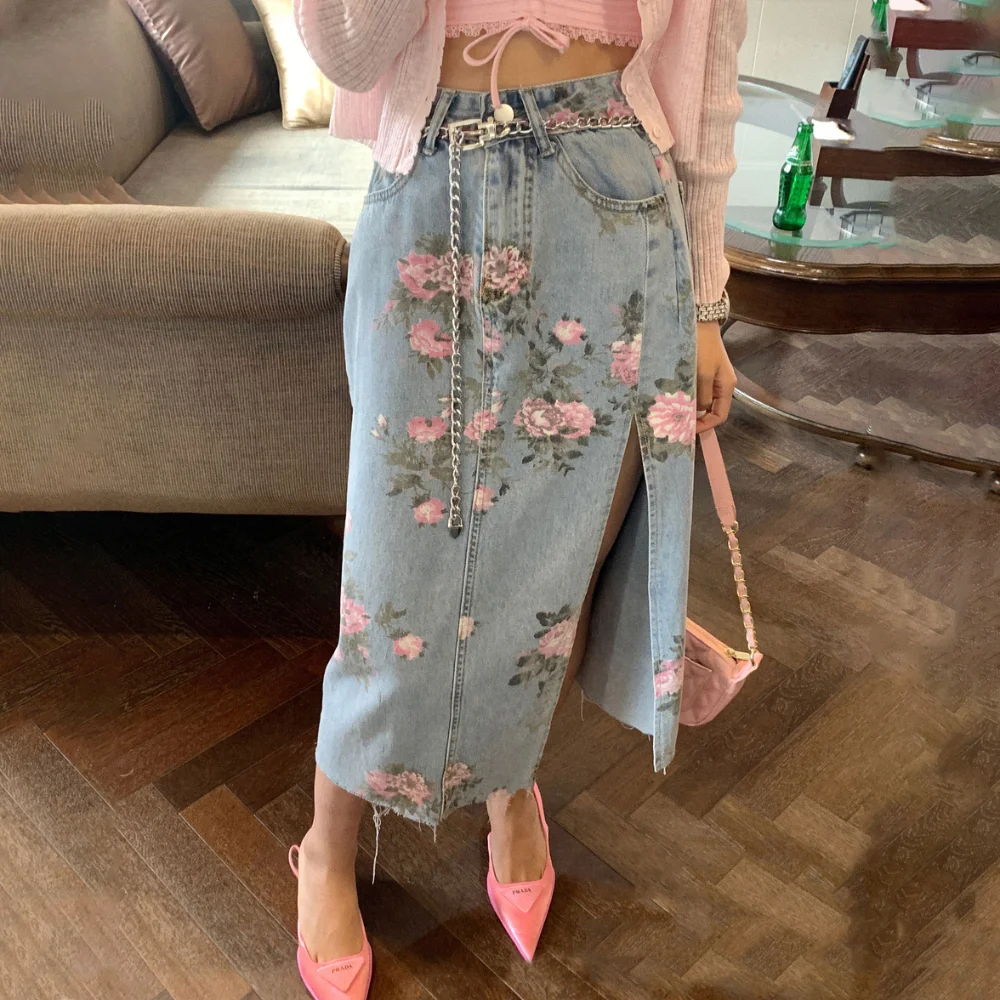Женская джинсовая юбка с высокой талией, длинная хлопковая юбка трапециевидной формы с цветочным принтом и поясом на талии, лето 2023