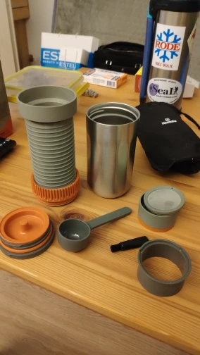 Идеальная кофеварка для походов. Хотя брал для того чтобы в офисе кофе делать. Если сравнивать с аэропрессом - результат получается ближе к воронке. Преимущество перед аэропрессом в том, что заваренный кофе остаётся в капсуле. Минус тоже в этом же. Поясню. В походе, на ходу или в дороге может не оказаться возможности выкинуть заваренный кофе куда-то. В этом случае то что кофе останется в капсуле, которая не пачкается и закрыта - это плюс. А вот мыть и вычищать ее потом - это боль. Еще из минусов- тяжеловато. Позорники поймут. Лишний килограмм в рюкзаке это ощутимо. Добавить к этому кофемолку и кофе… По этому для коротких поездок - идеальный вариант еще две запасные капсулы и чехол. Три капсулы - кофе на три дня. Все что вам нужно чтобы сварить хороший кофе - 260 грамм кипятка. В капсулу помещается странное количество кофе - порядка 17 грамм. Мерная ложечка в комплекте- чуть меньше 10 грамм. Взвешивать лучше на весах. В целом - очень доволен покупкой. Хороший кофе в любых(практически) условиях. Советую.