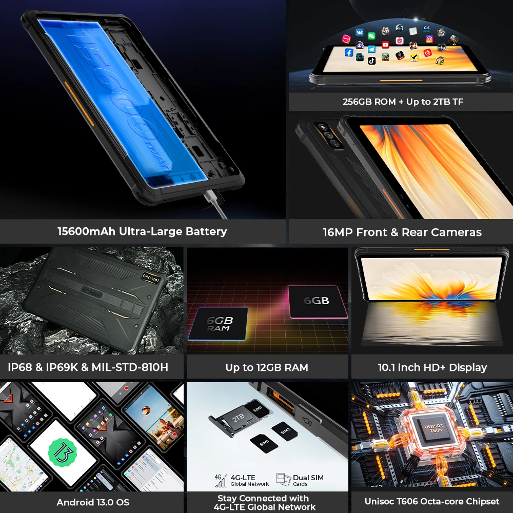 Прочные планшеты World Premeire HOTWAV R7 2024 года, Android 10,1 дюйма, HD +, 15600 мАч, 12 ГБ (6 + 6), 256 ГБ OTG, обратная зарядка, режим перчаток, глобальный режим