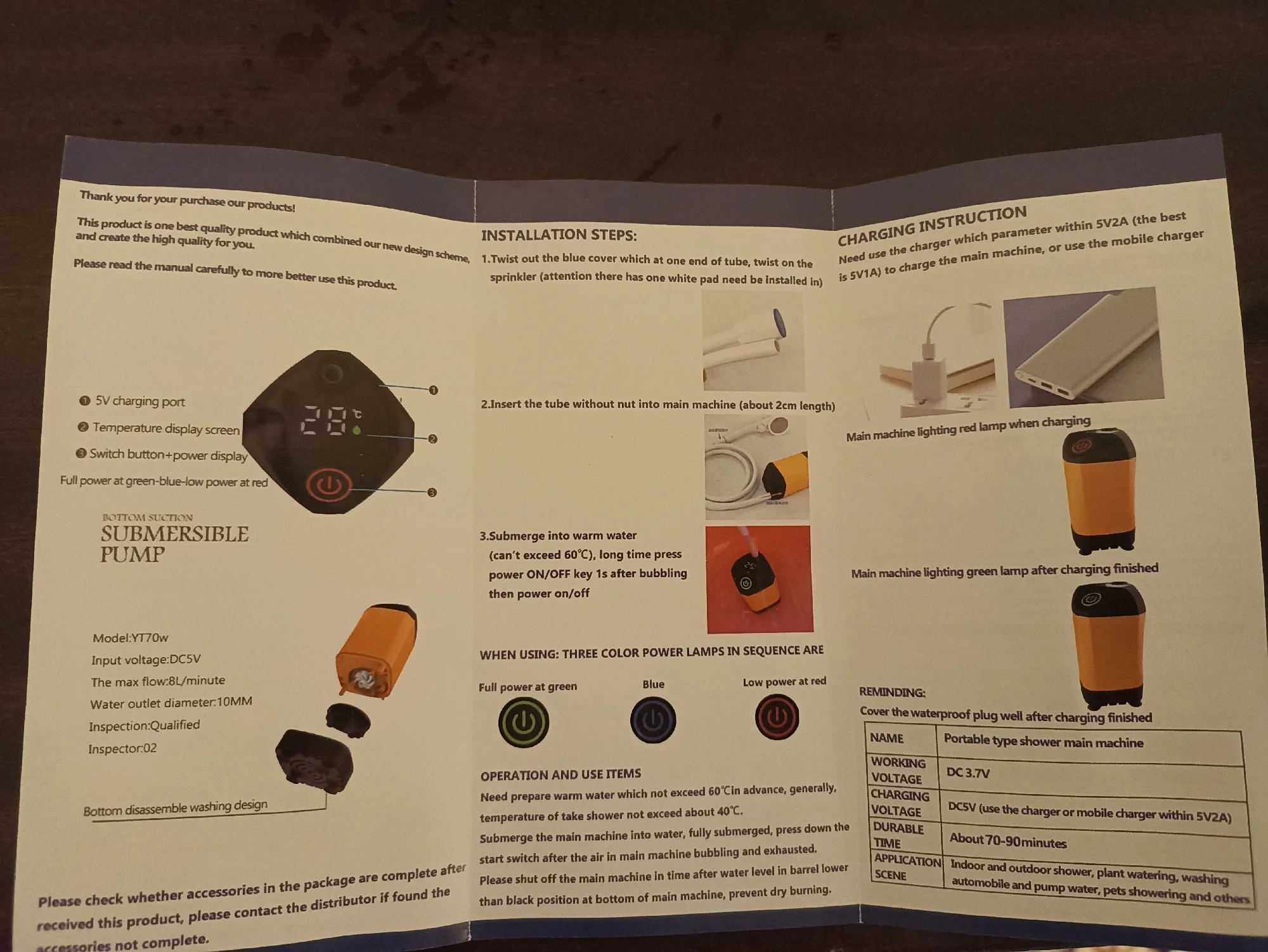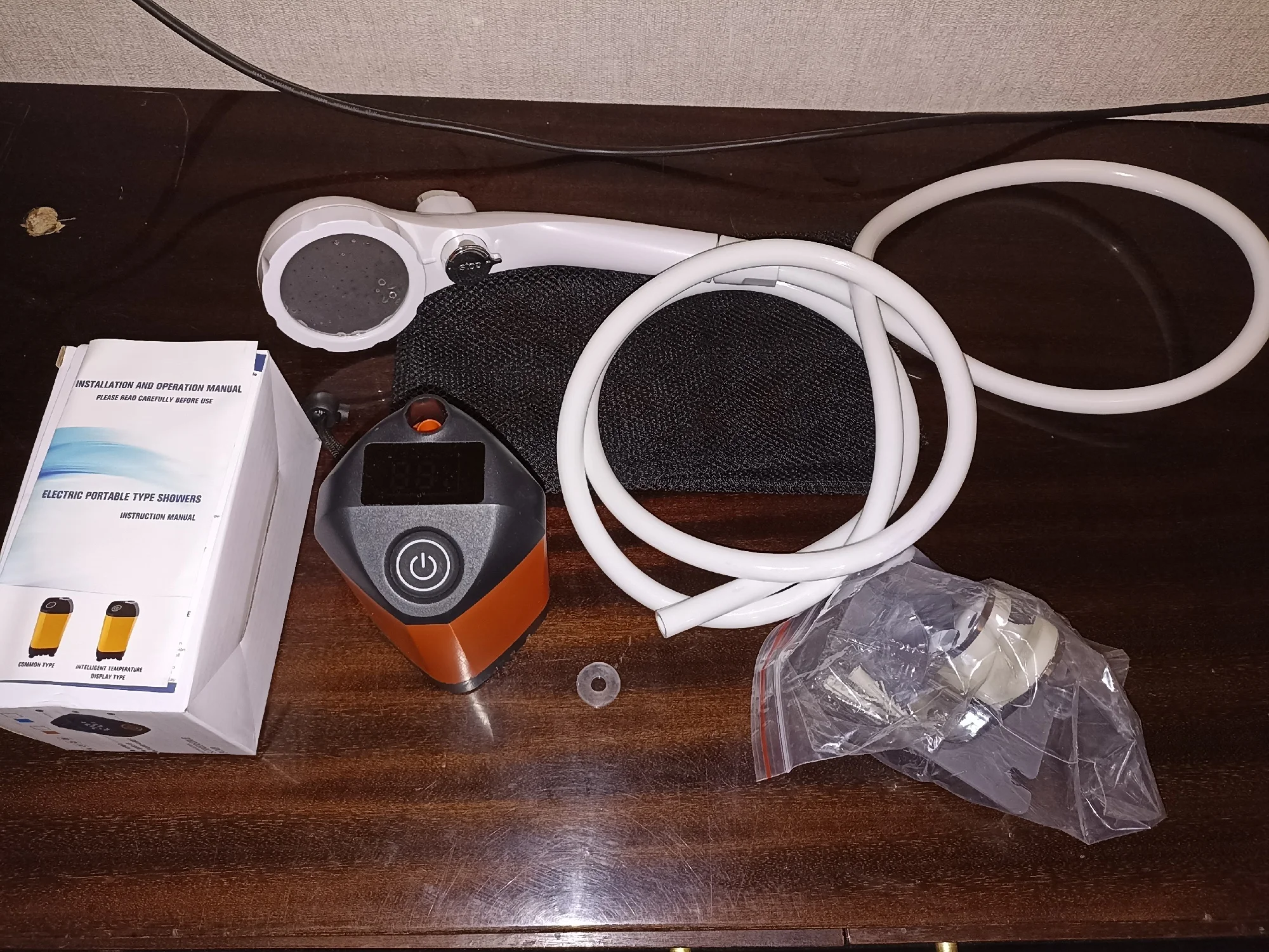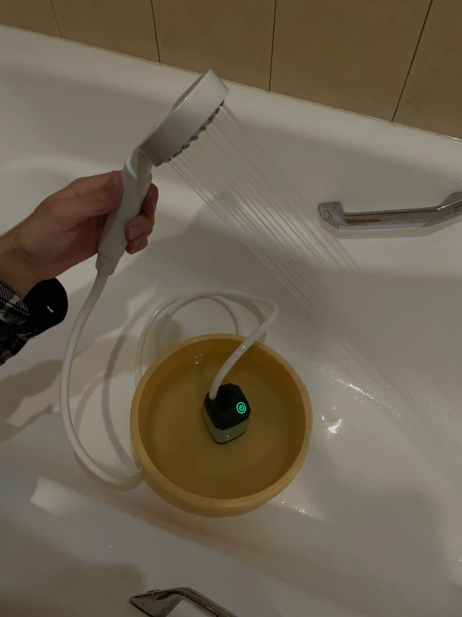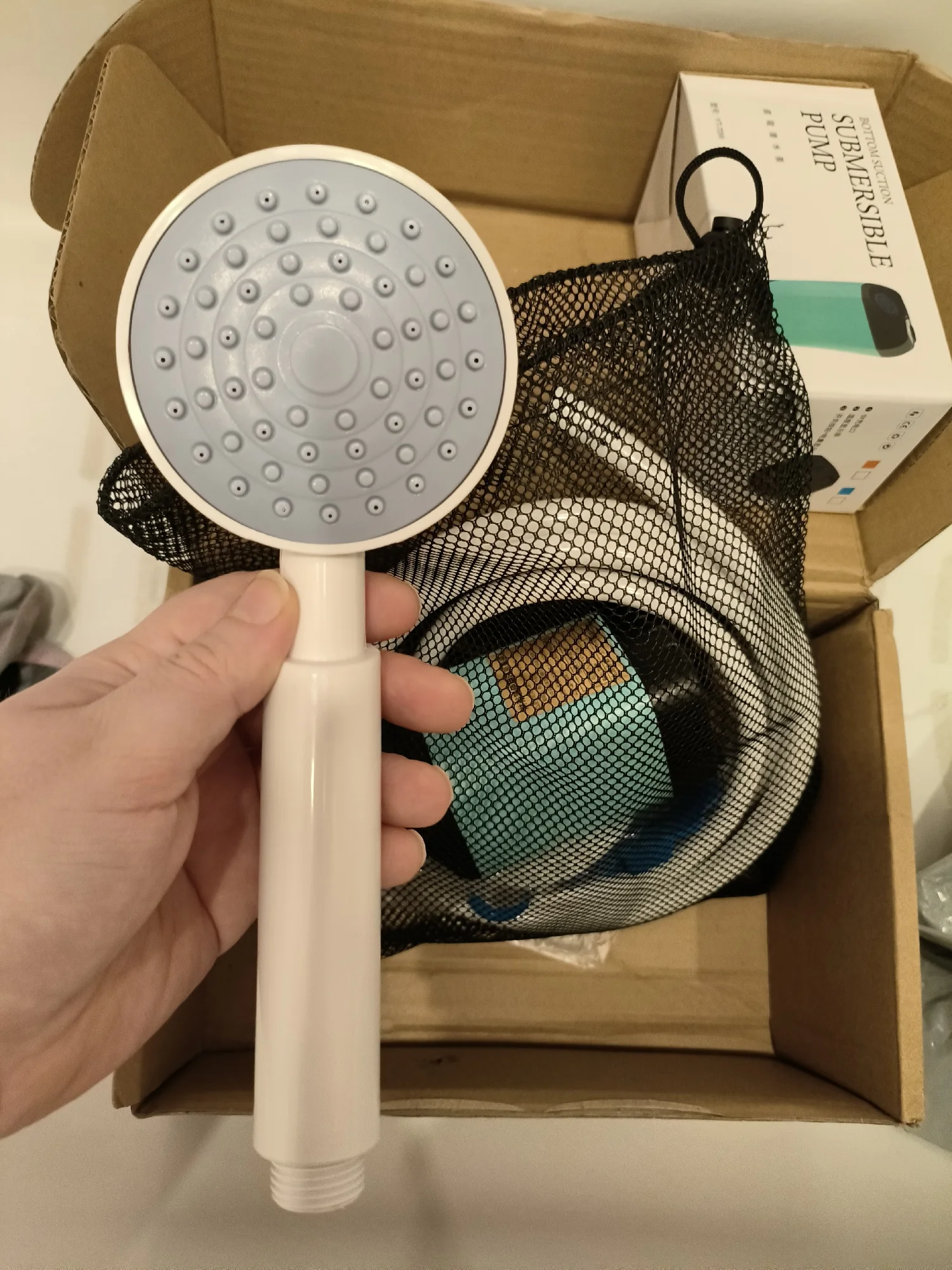 Заказывал 17.11.2023. Экспресс-доставка указывала получение 21.11.2023, доставлено - 22.11.2023. Цена со всеми скидками: 1586,11 рублей. Устройство испытал в первый же день. Собралось легко. Было заряжено. Показывает температуру воды, точность не проверял, но по ощущениям - что-то похожее на реальность. Полностью погружал под воду, ко дну ведра фиксируется присосками. Управление - непосредственно душевой ручкой: регулируется сила давления (при купании использовал минимум, чтоб вода расходовалась медленнее; для меня такого напора вполне хватило), а так же старт/стоп (насос при этом продолжает работать). В комплекте так же: зарядный кабель, две силиконовых прокладки (для шланга, одна - запасная), кронштейн для крепления душа на стену (вариант: на винты/на присоски/на двусторонний скотч), сумка-сетка, инструкция (на английском языке). При зарядке, индикация заряда - по цвету подсветки.
