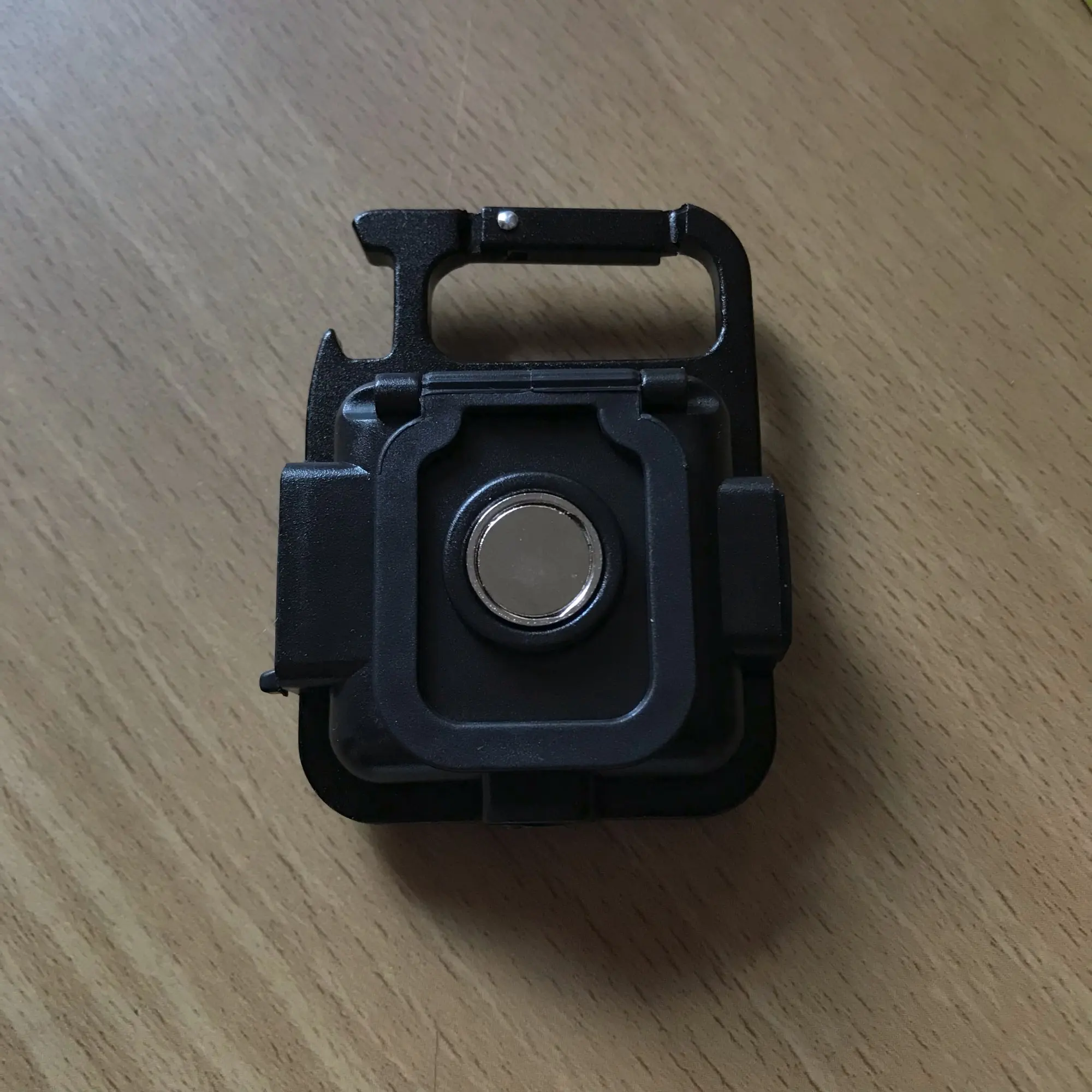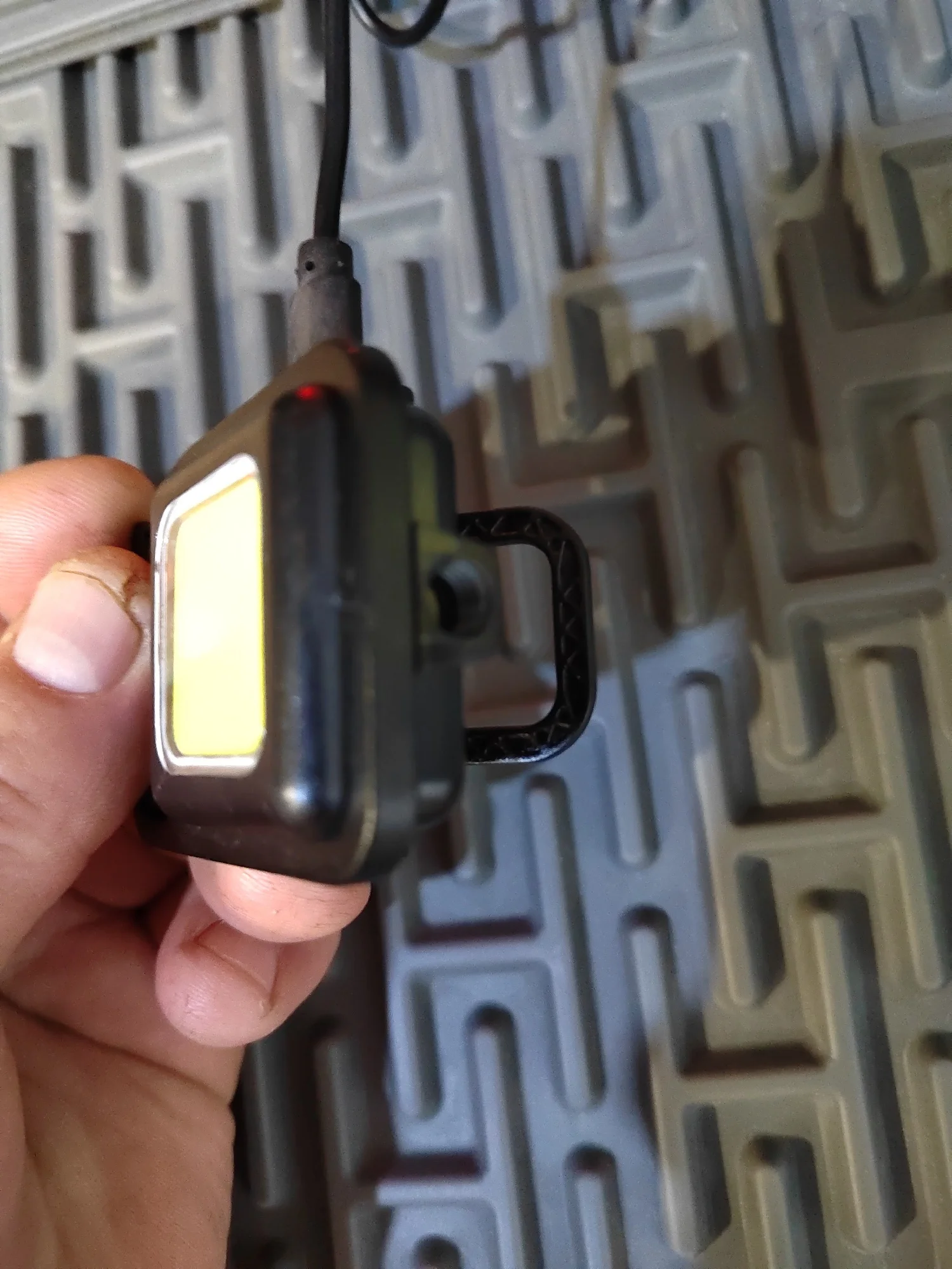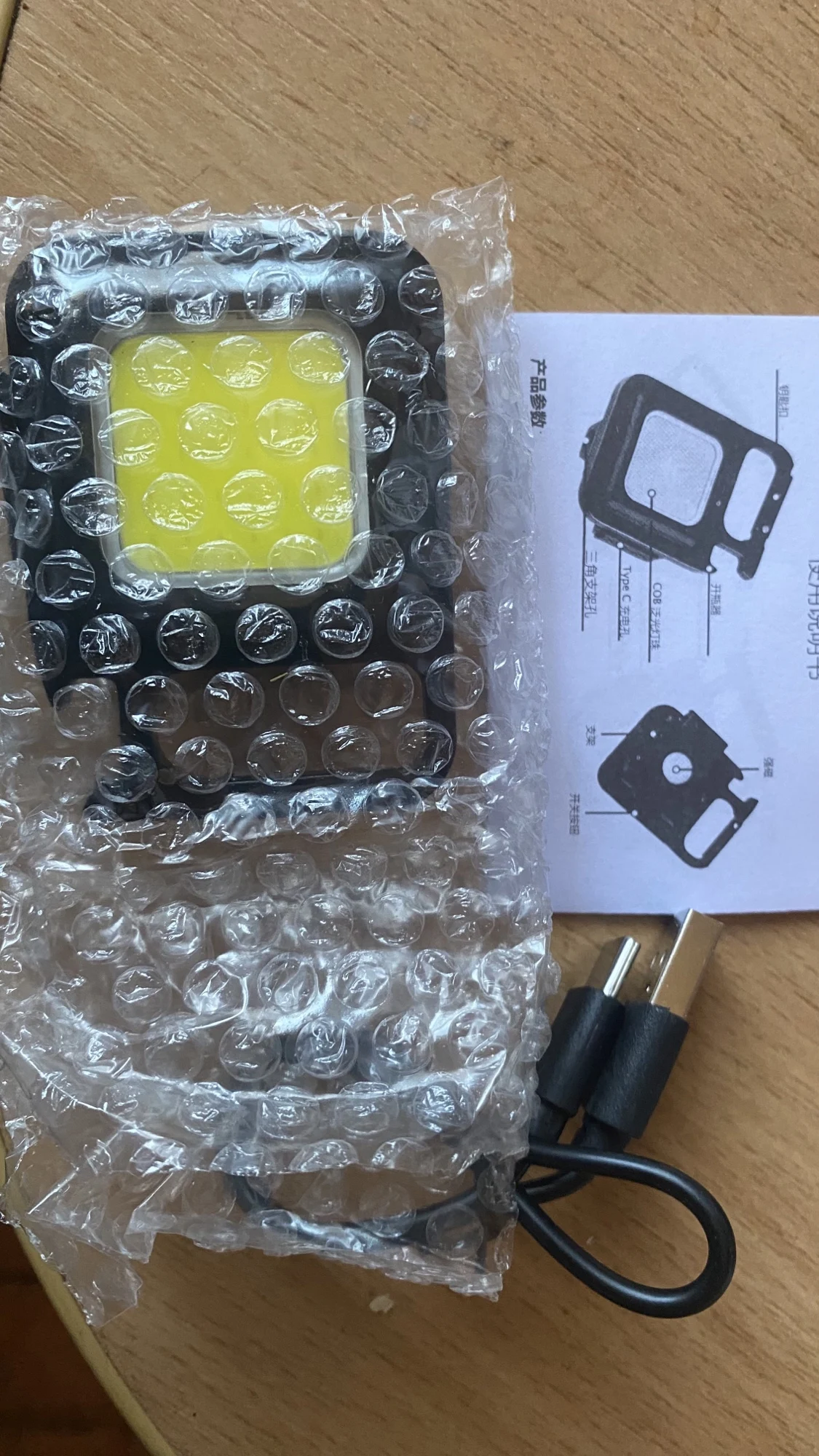 Маленький со спичечную коробочку. В руке тяжеленький светит ярко в 2х режимах- 3й режим СТРОБОСКОП. Tape C заряжается горит идекатор красный. Есть резьба, похоже крепление на штатив.