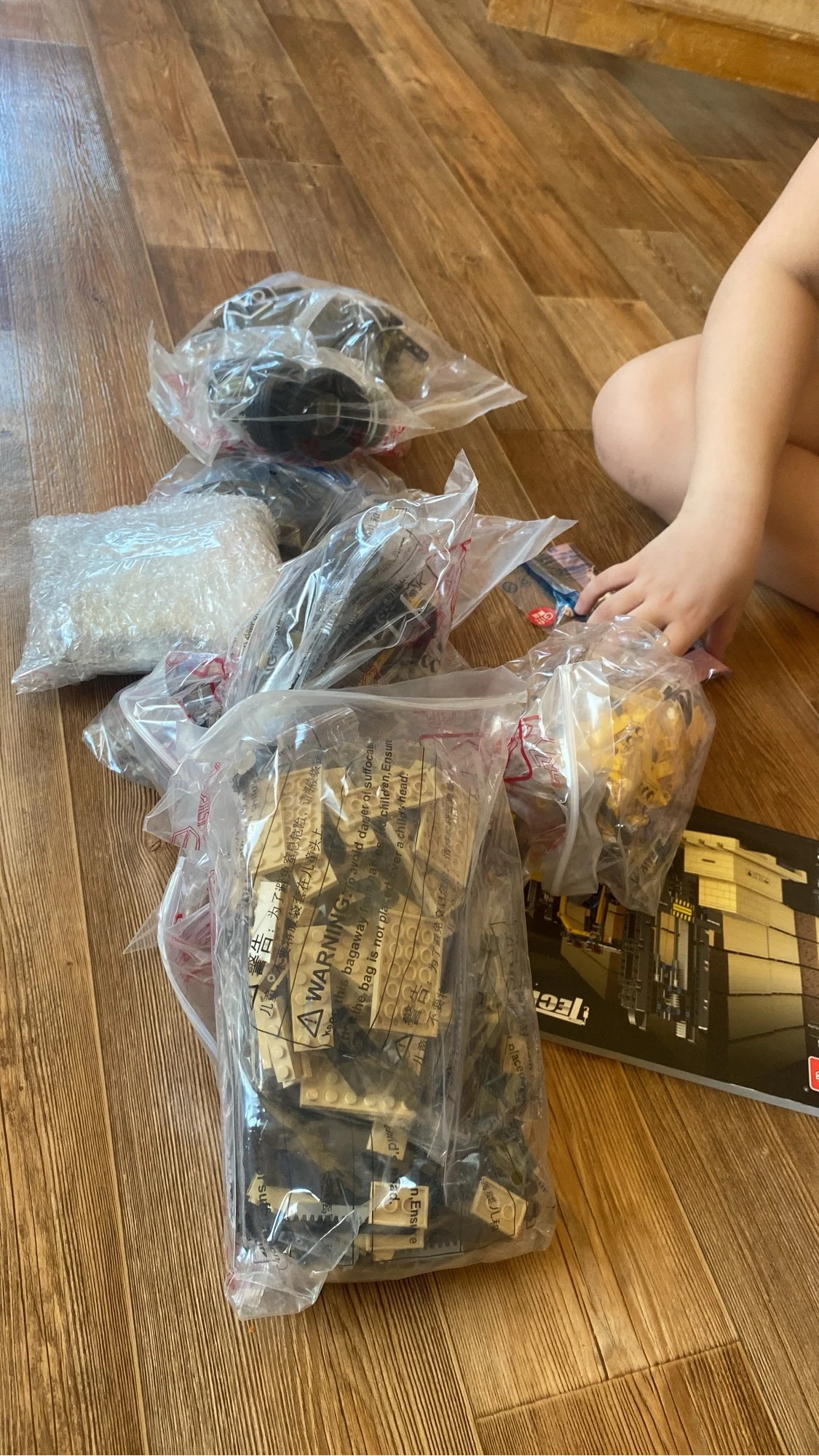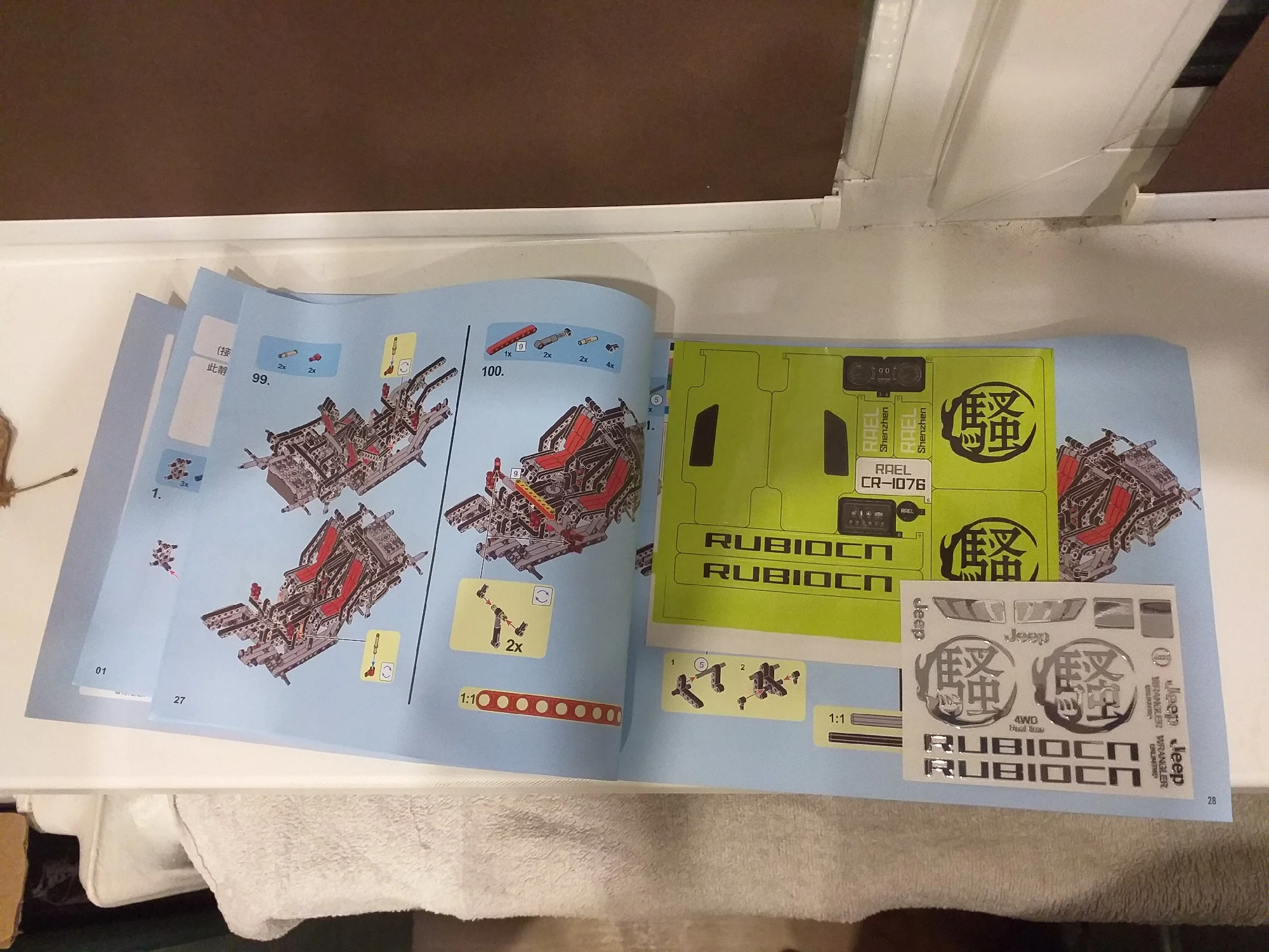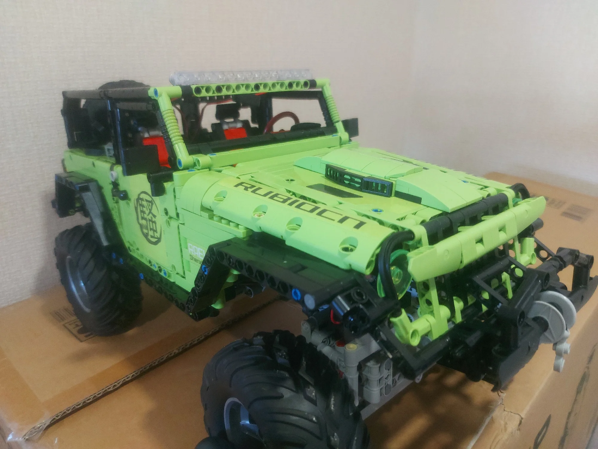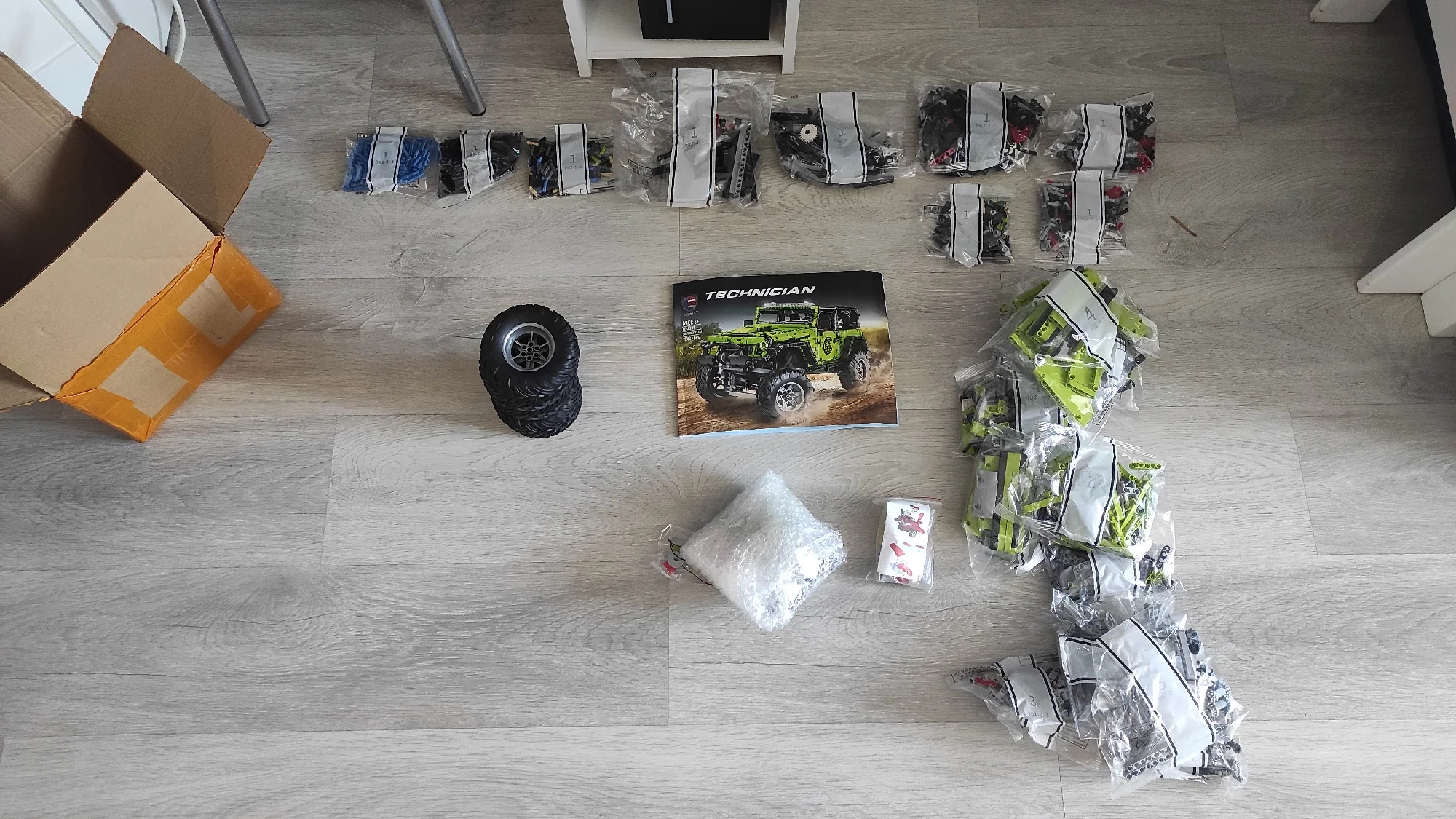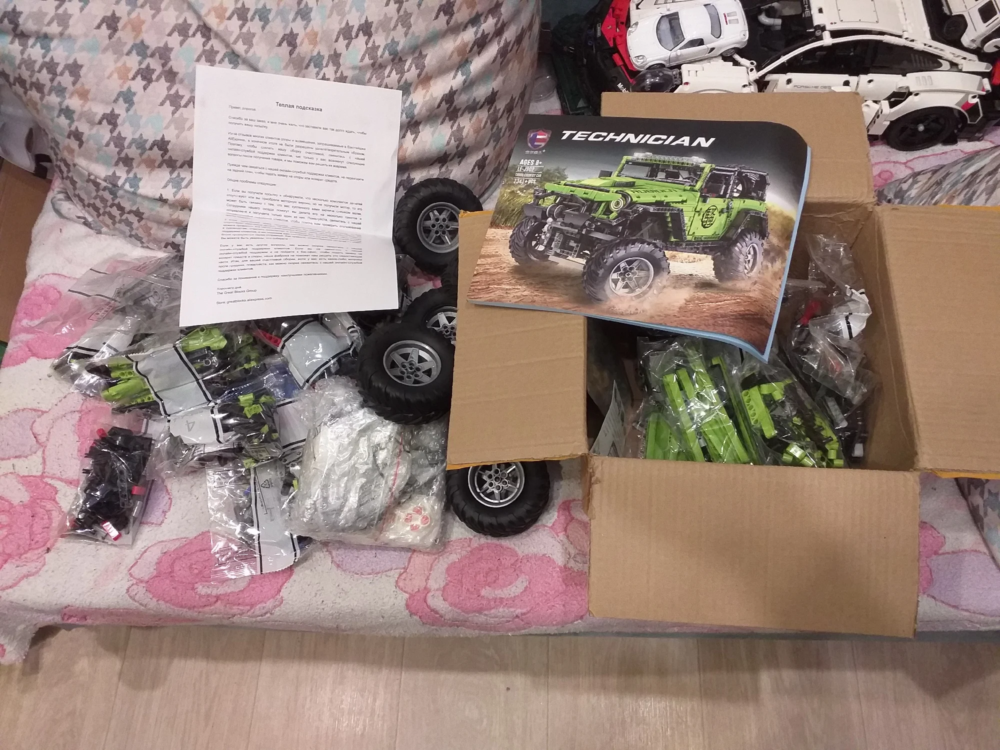 Сегодня получил посылку с джипом в постамате магазина "Пятёрочка". Посылка дошла до Мурманской области за неделю, что очень хорошо. Все детали распределены по группам в пакеты, пакеты пронумерованы. Четыре группы пакетов с номерами, всего их 22 штуки, ещё 2 без номеров. Пять колес с мягкими резиновыми шинами. Двигатели, пульт управления и блок управления с аккумулятором упакованы отдельно в пупырчатый пакет.В нём же есть шнурок для зарядки. В коробку вложена подробная цветная инструкция по сборке, наклейки и письмо, в котором объясняется, как разрешить форс-мажорные обстоятельства. Всё хорошо продумано, мы довольны, спасибо!