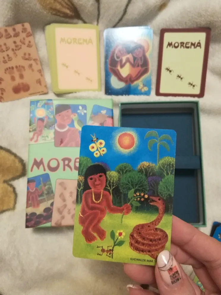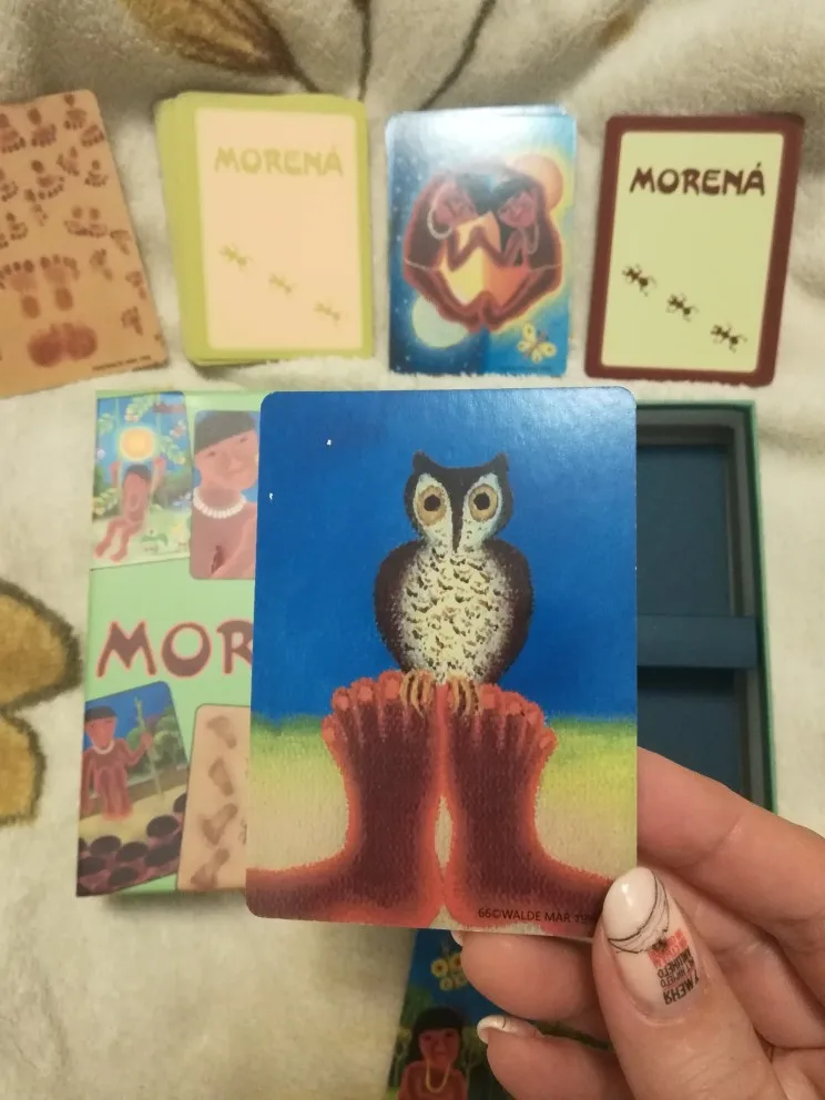 Колода метафорических карт Morena за 1033 р. Шла месяц, отслеживалась. Аккуратная коробочка под карты, незначительно повреждена. Сами карты маленькие, заламинированные, удобно держать в руках, перебирать. С оригиналом не сравнивала. Картинки яркие в сине-коричневых тонах. Колода состоит из 2 частей: 1. Изображения людей и животных в разных ситуациях. 2. Изображения следов ног людей и животных на песке. Человечки в своем естественном проявлении добывают пищу, отдыхают среди животных, прячутся от ливня, танцуют, встречают смерть. На картах со следами ног еще больше различных ситуаций общения, более тесного, очень интересно наблюдать за движениями людей и животных, их медитативными танцами, рисунками на песке. Быть в согласии с собой, с природой и другими, вот чему учит колода. Полезная, многоцелевая, профессиональная колода. Просто при рассматривании уже лечит, рекомендую!