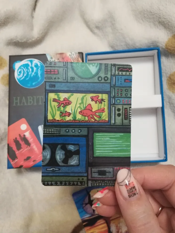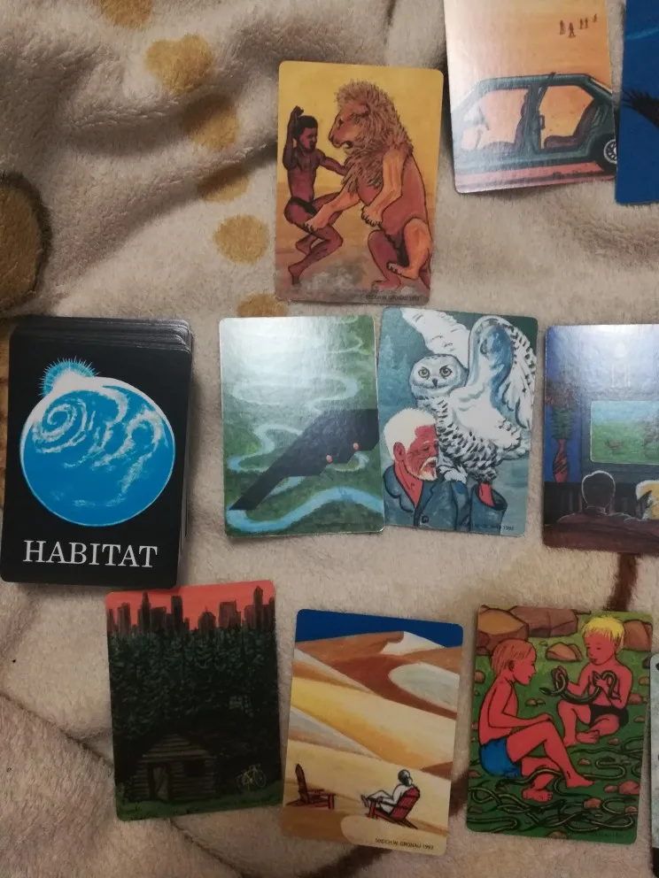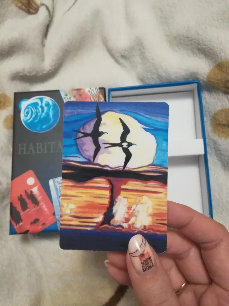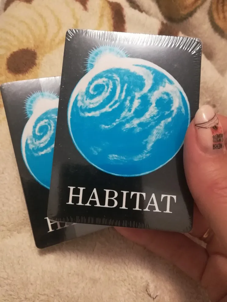 Колода метафорических карт Habitat за 1033 р. Пришла за месяц, с незначительными помятостями, карты маленькие, заламинированные, удобно держать и перебирать. С оригиналом не знакома, описание к картам и работу с ними не практиковала. На картах изображения связи изобретений человечества и природы. Космическая станция на фоне земного шара, лебеди около дымящей трубы, комбайн застрял в кустах, человек, сажающий ростки на камнях. Возникает много образов и чувств, много гармонизирующих карт, поэтому рекомендую для излечивания души!