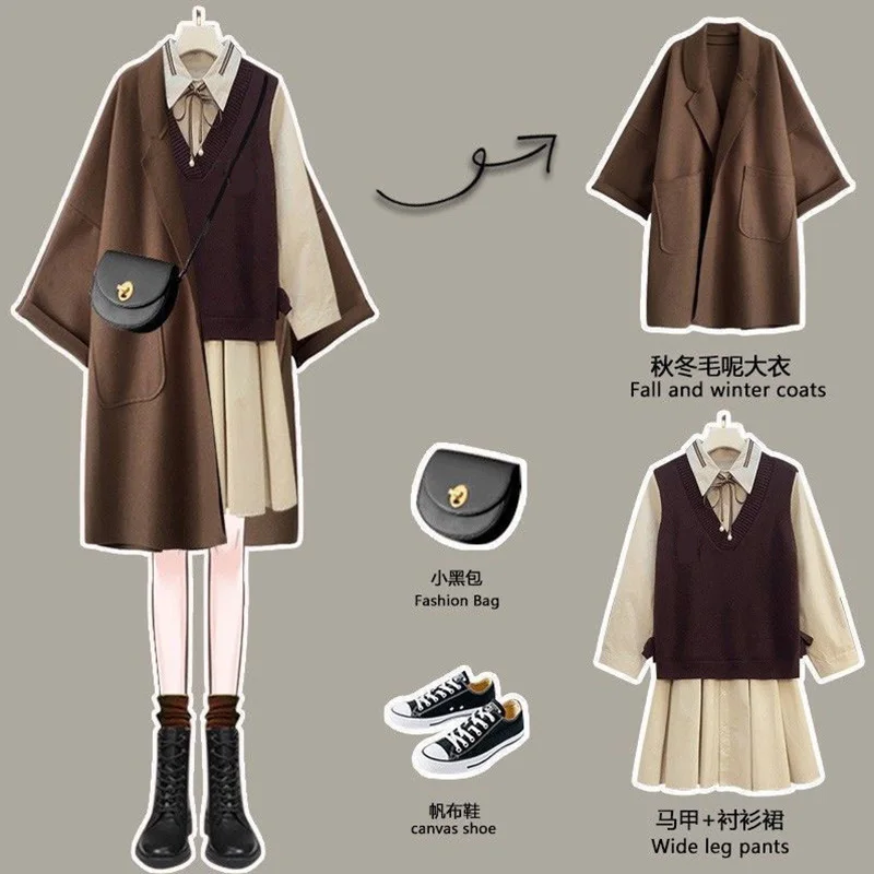 Женский весенне-осенний костюм большого размера, элегантный шерстяной жакет в стиле ретро, платье-рубашка с жилетом, костюмы-тройки, элегантные уличные костюмы