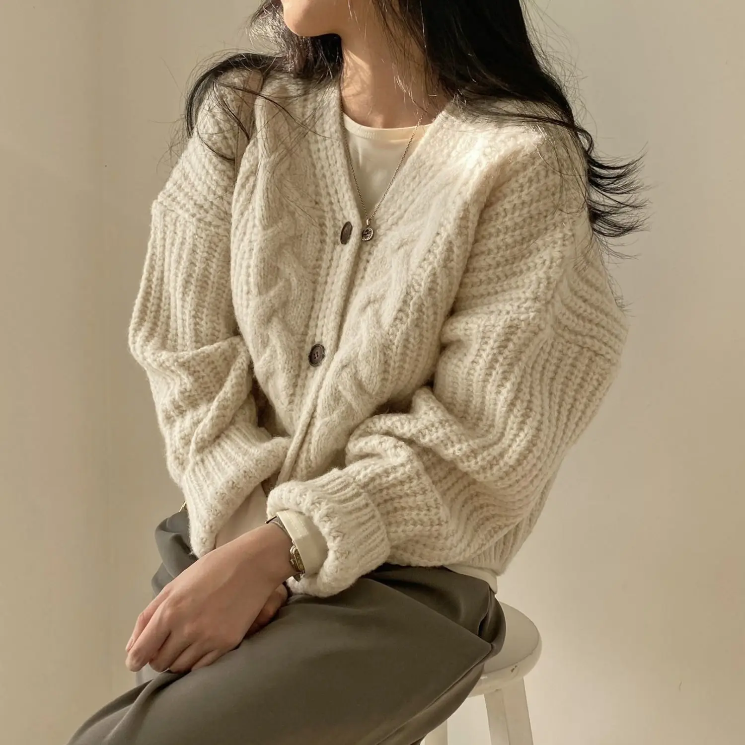 - Женский витой вязаный кардиган в гонконгском стиле с длинным рукавом,...