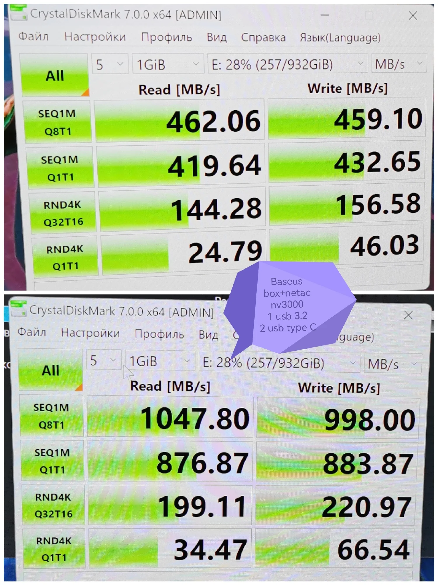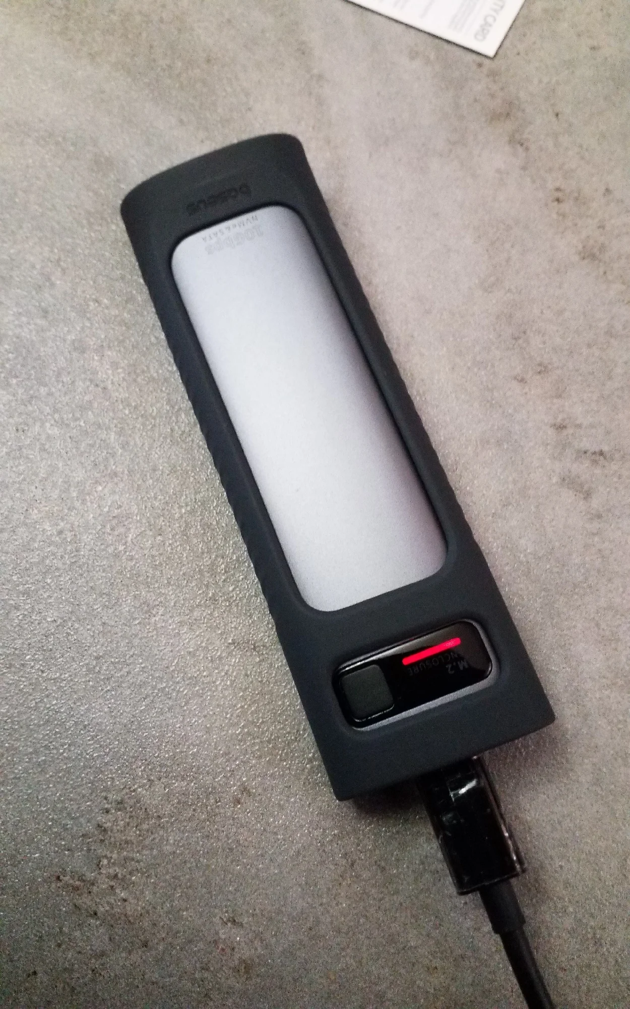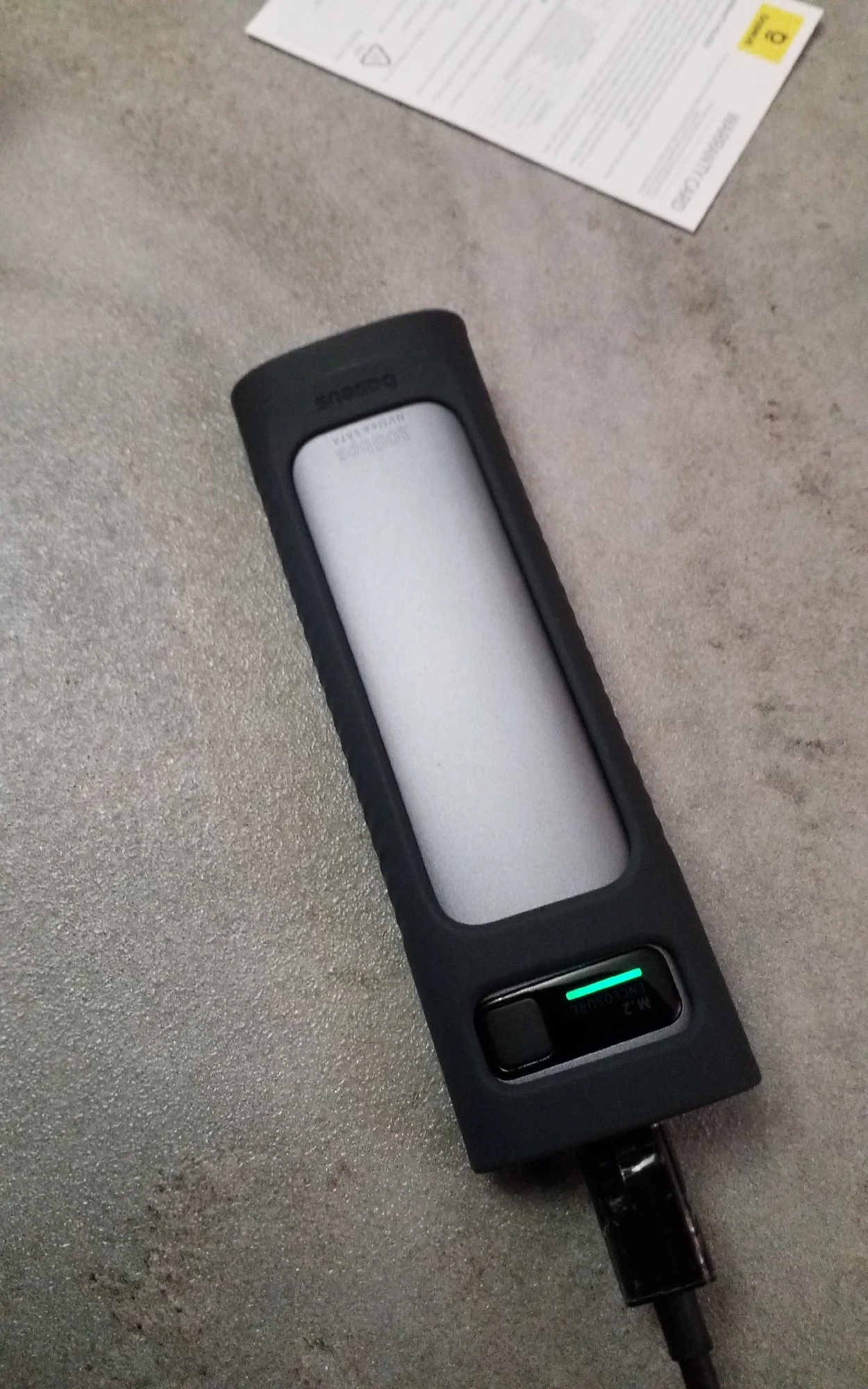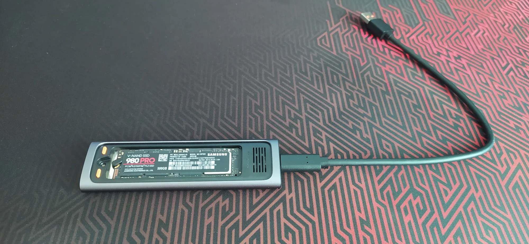 Хорошая штучка, лёгкая. Сделана качественно. Сомнения вызывает разве что болтик, которым прикручивается крышка. Скорости заявленные держит. Кабели толстые, но выглядят дёшево. Кнопка по долгому нажатию отключает накопитель и наоборот, короткие нажатия меняют подсветку. Температура с термопрокладкой, идущей в комплекте, не превысила 42 градуса в тестах. На фотках тесты по type-c и type-a соответственно.