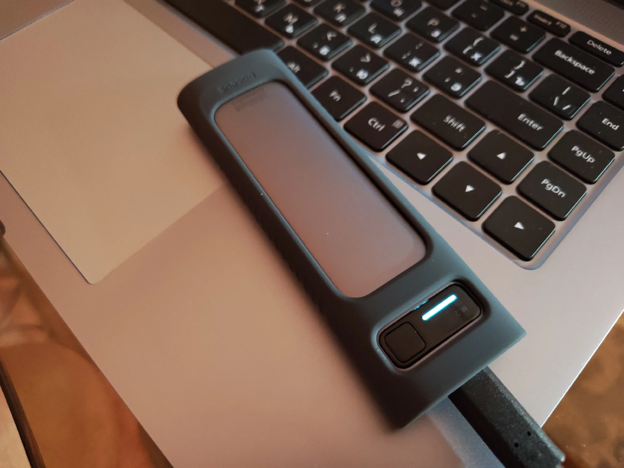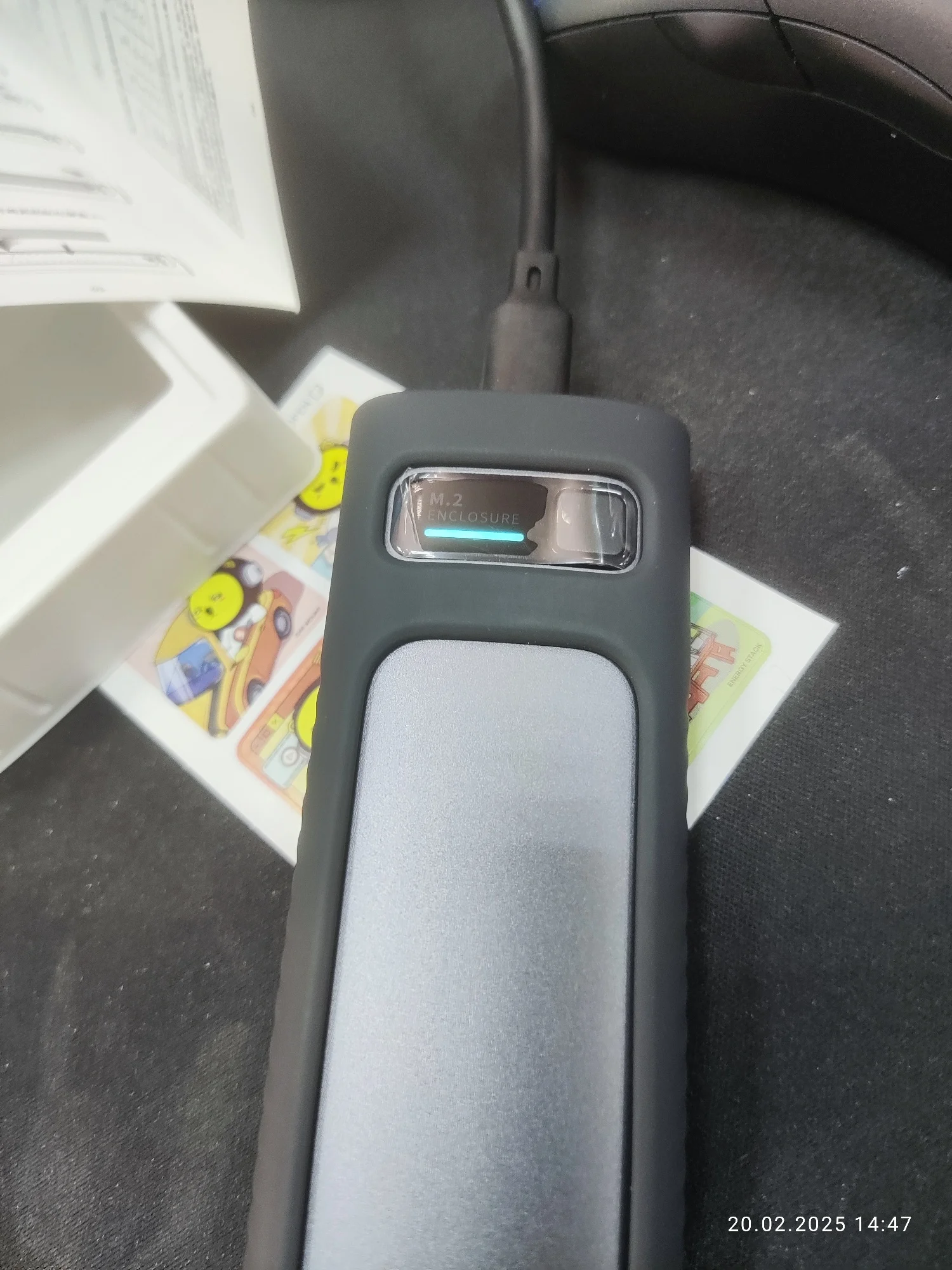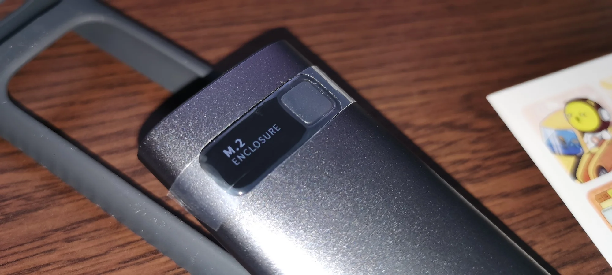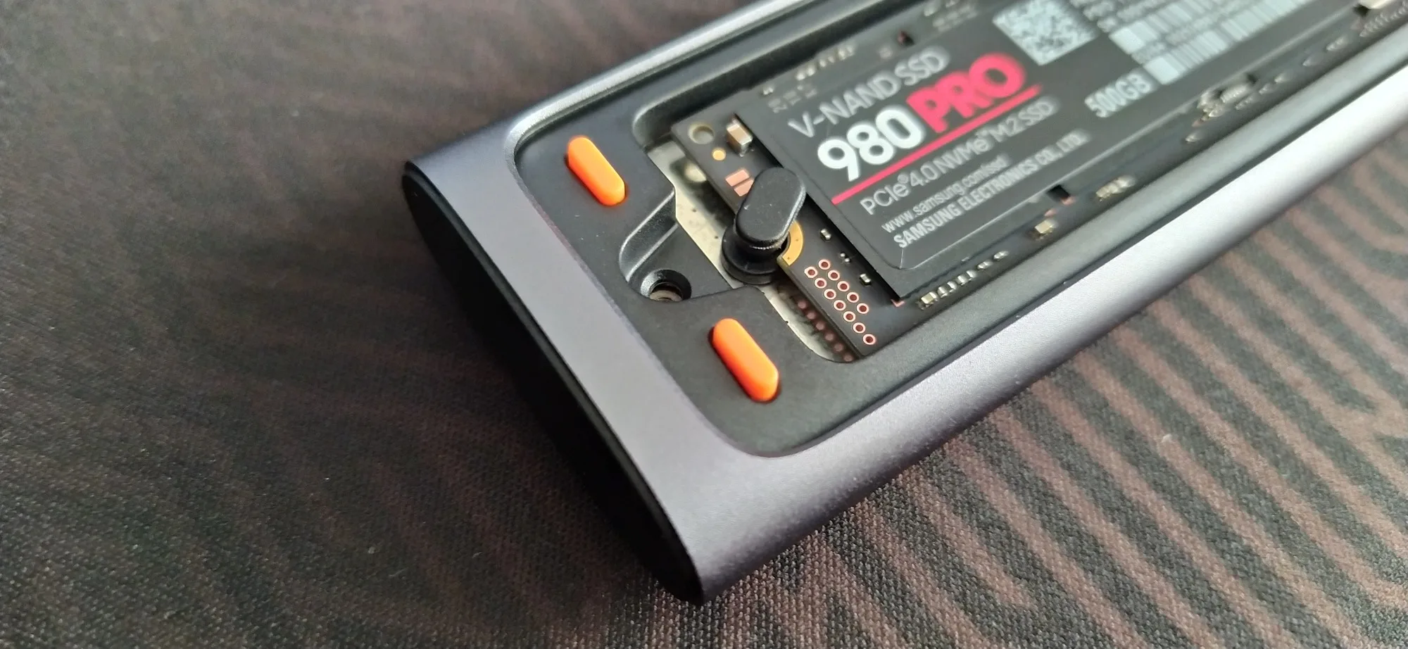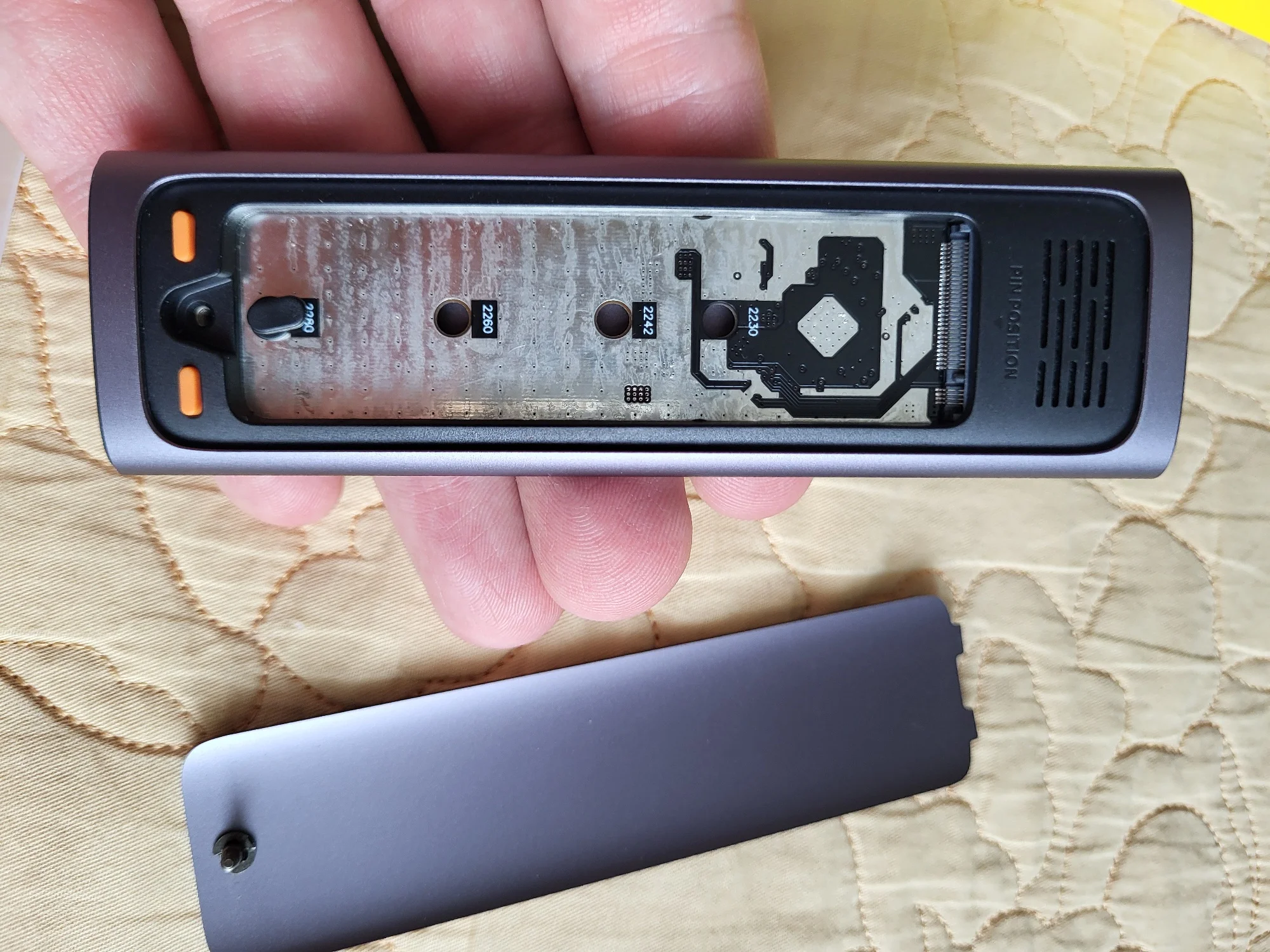 Хорошая штучка, лёгкая. Сделана качественно. Сомнения вызывает разве что болтик, которым прикручивается крышка. Скорости заявленные держит. Кабели толстые, но выглядят дёшево. Кнопка по долгому нажатию отключает накопитель и наоборот, короткие нажатия меняют подсветку. Температура с термопрокладкой, идущей в комплекте, не превысила 42 градуса в тестах. На фотках тесты по type-c и type-a соответственно.