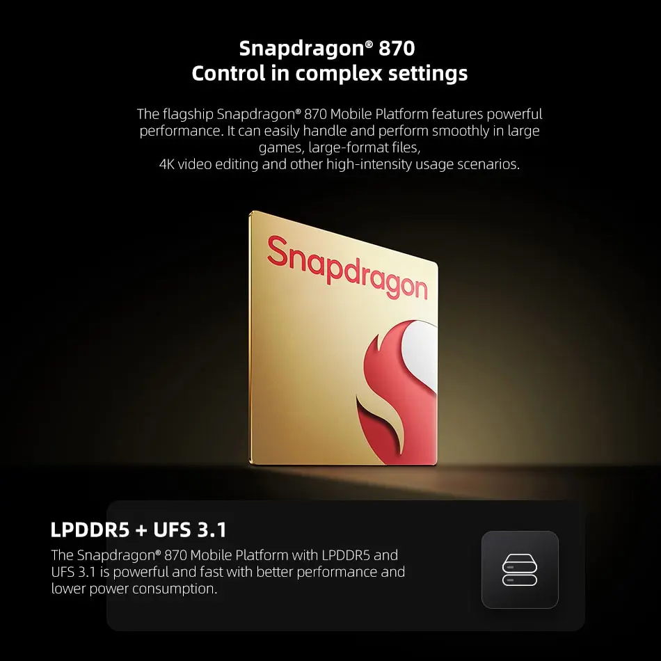 Флагманская Мобильная платформа Snapdragon® 870 отличается высокой производительностью. Он может легко обрабатывать и плавно работать в больших играх, файлах большого формата,