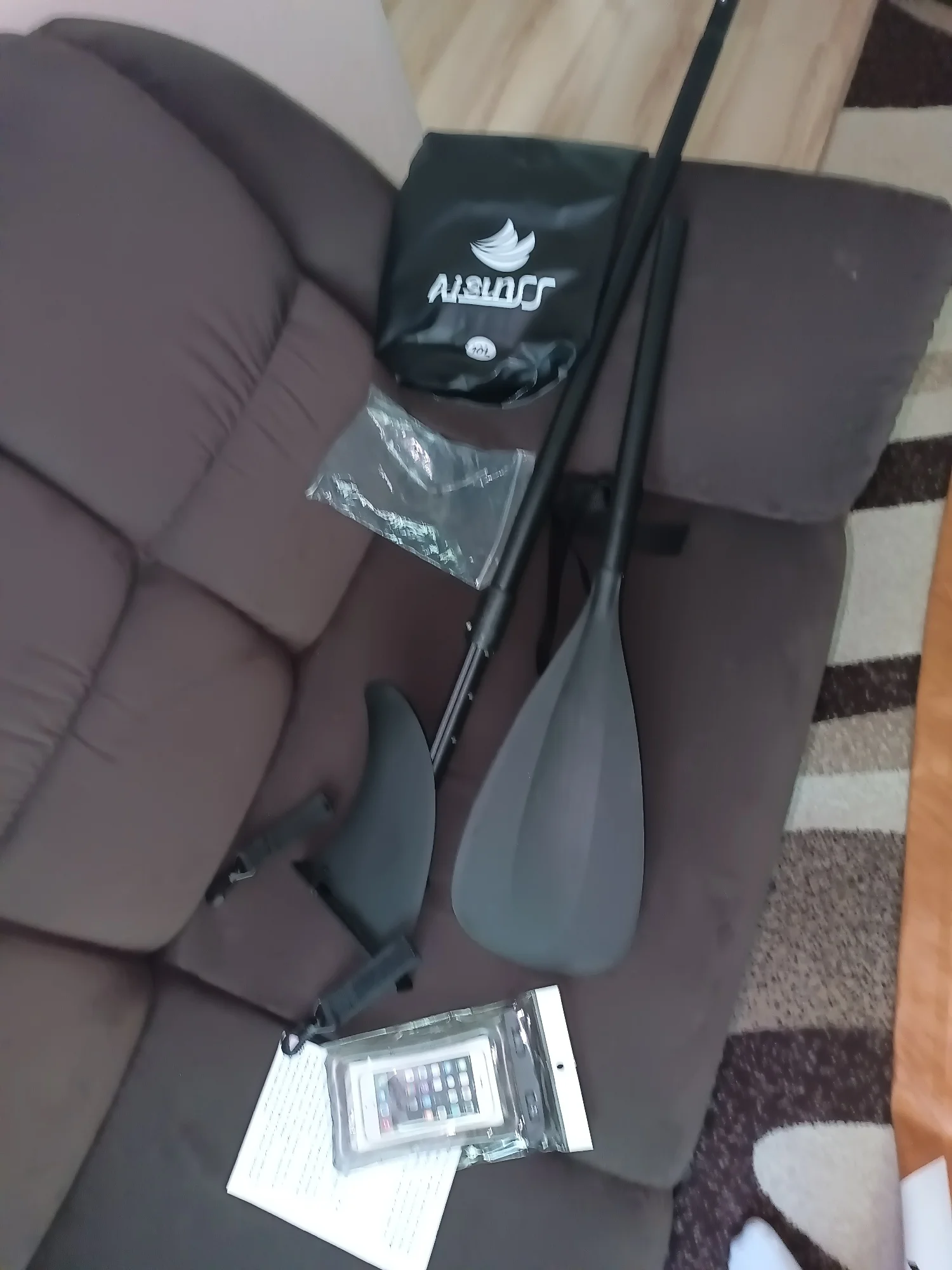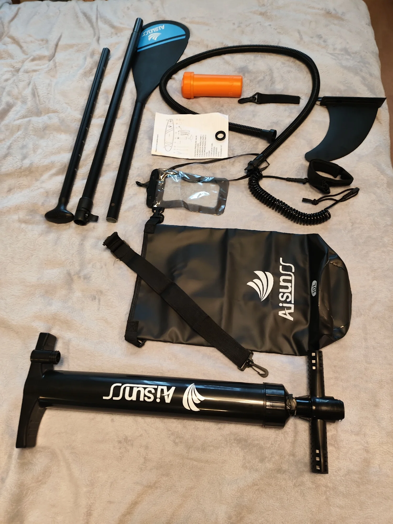 сап,насос (с обратной откачкой,можно делать вакуум)весло,чехол для телефона,две сумки,чехол для ноги с карабином.все супер,продавцу спасибо,доставка 12дней.