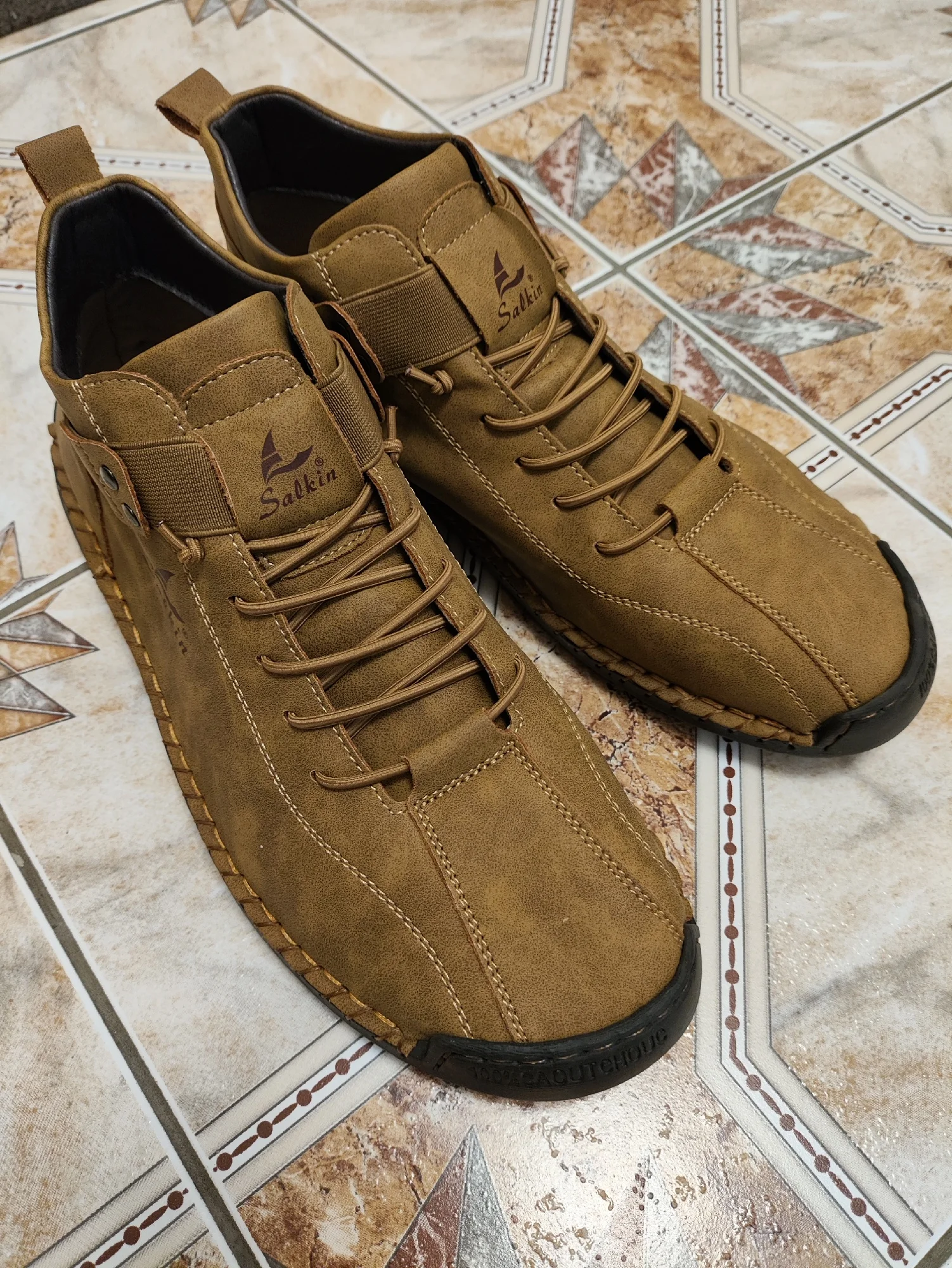 обувь нормальная, подошва мягкая, не знаю плюс это или минус, но мне нравится, на вид кожа, может качественный кожзам.. доставка быстрая. ношу 42 размер взял по таблице 45ый. подошли нормально миллиметров пять впереди свободно. на ногах смотрятся и сидят нормально. подошва прошита, не знаю как поведут себя дальше, пока полёт нормальный. всем спасибо