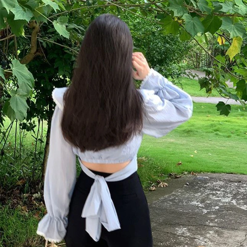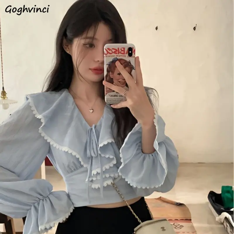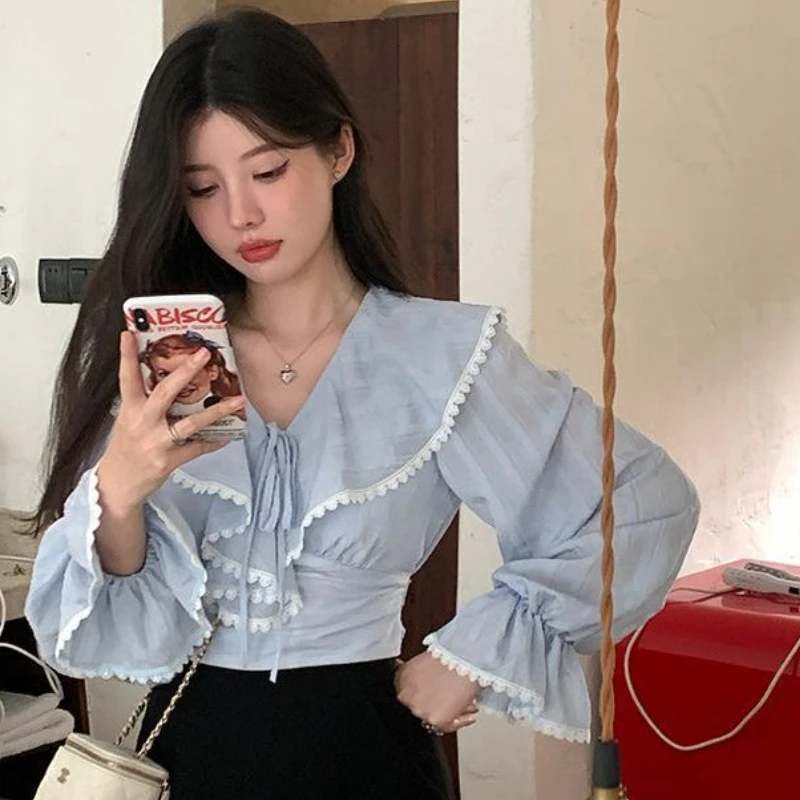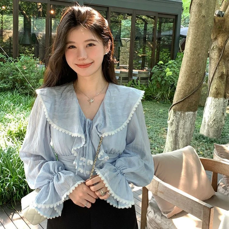 Блузка женская кружевная с оборками, милый приталенный Бандаж с расклешенным рукавом принцессы, модная простая универсальная классика в стиле ольччан