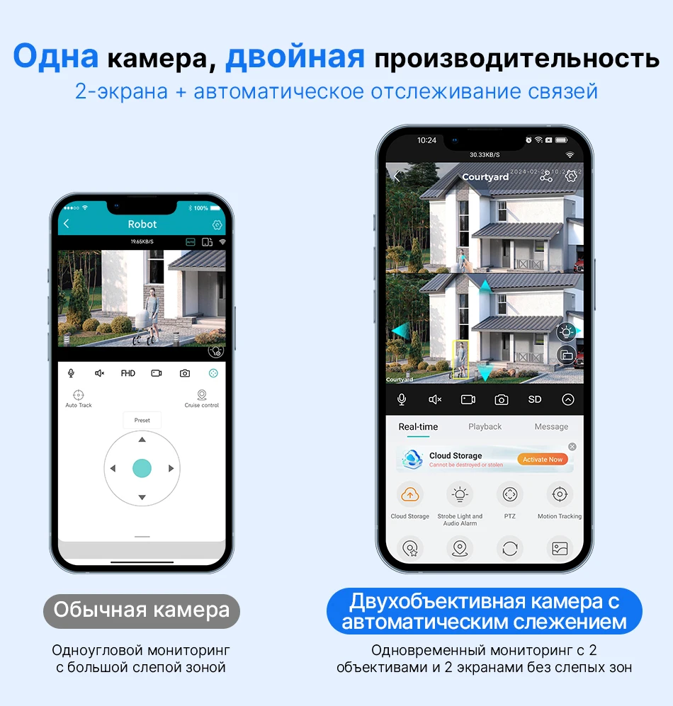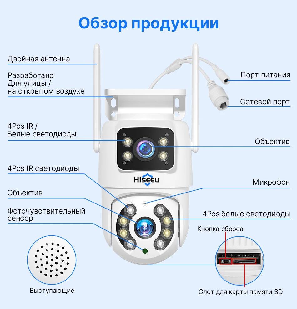 Двойной объектив, двойной экран, сигнализация с уведомлениями, отслеживание гуманоидов, Двусторонняя голосовая связь 360 мониторинг, полноцветное ночное видение, водонепроницаемость IP66, мобильный телефон Удаленный мониторинг, обмен видео, хранение SD-карт, 24 часа записи видео