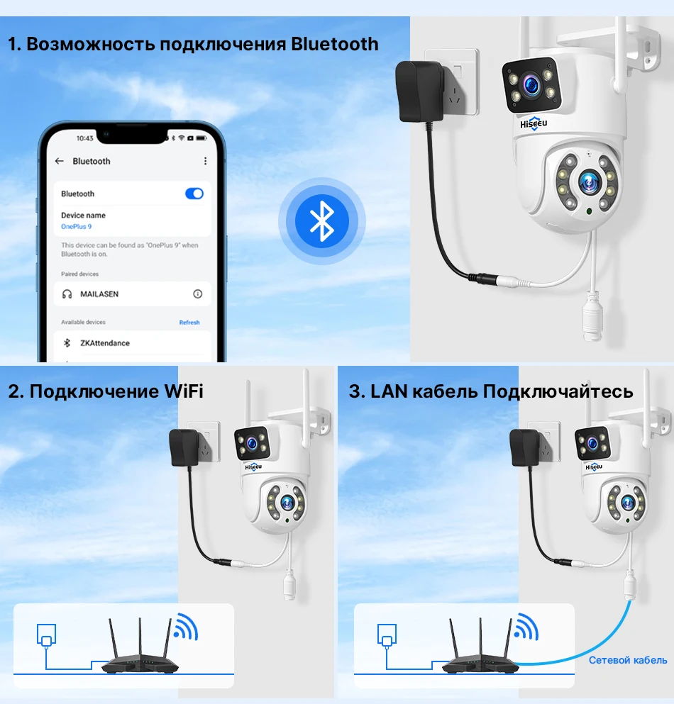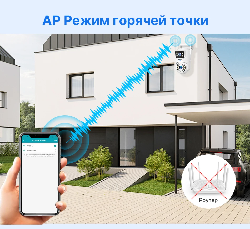 Питание от адаптера DC12V, вы можете подключить камеру к сети Wi-Fi. Вы можете настроить Wi-Fi-соединение камеры или поиск по локальной сети с помощью сетевого кабеля, подключенного к маршрутизатору, работать только с 2,4G Wi-Fi (не поддерживает 5G).