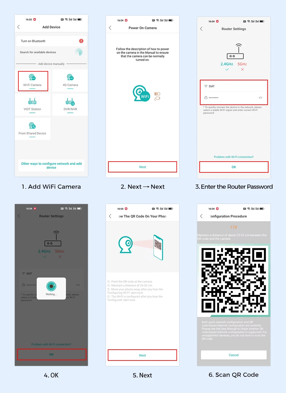 ③ Подключите камеру через сетевой диапазон Wi-Fi 2,4G HZ, выполните 6 шагов на картинке, чтобы подключиться, и вы можете успешно настроить ее.