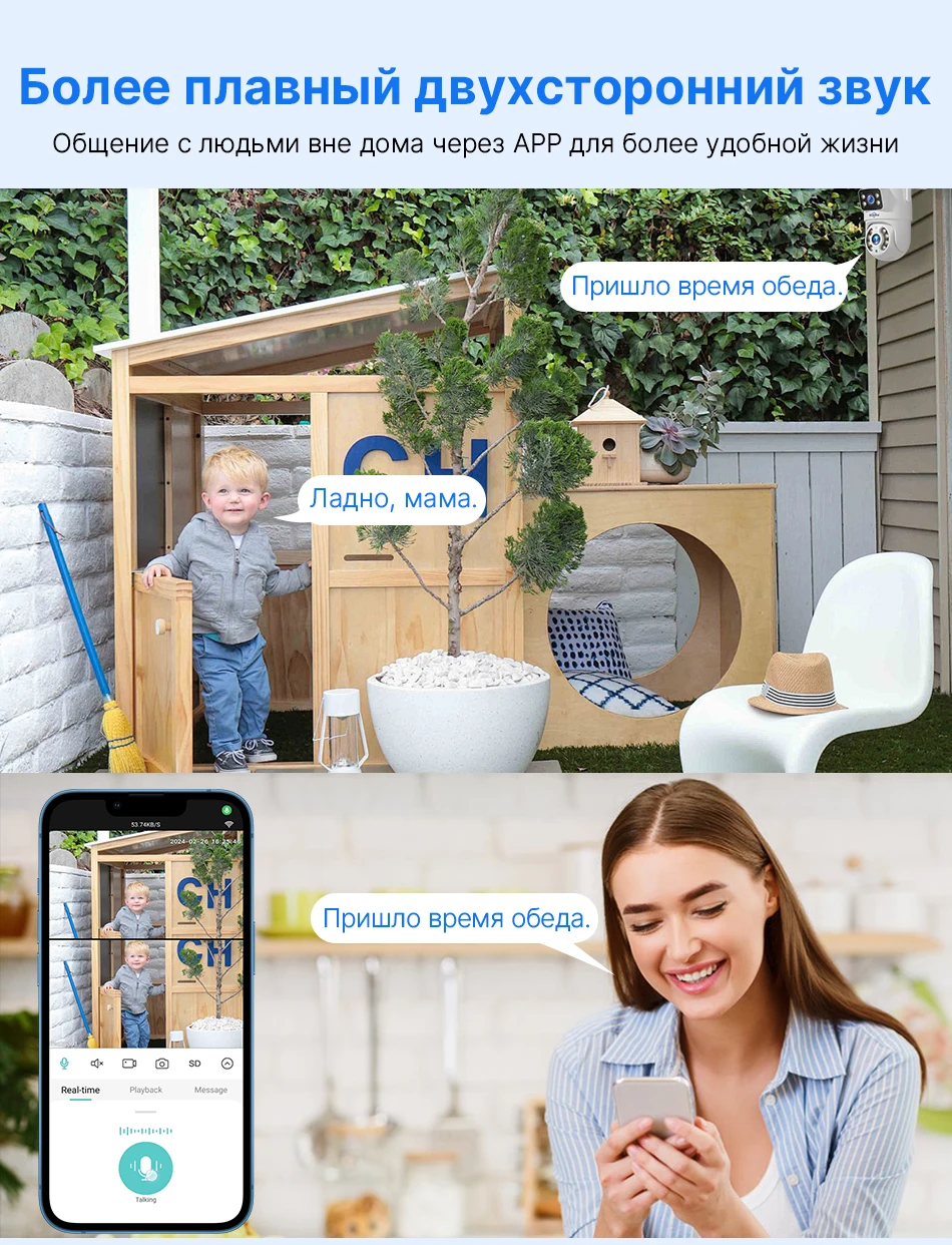 Встроенный микрофон и динамик поддерживают видео в реальном времени, что позволяет разговаривать с посетителем в реальном времени, где бы вы ни находились.