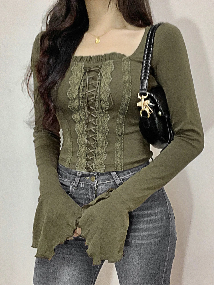 Женская винтажная облегающая футболка IAMSURE в стиле пэчворк с кружевом, облегающие футболки с квадратным воротником и длинным рукавом, модная уличная зимняя одежда 2023
