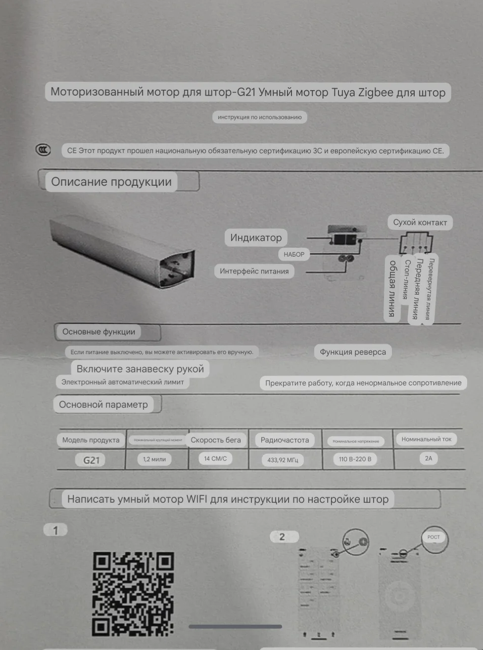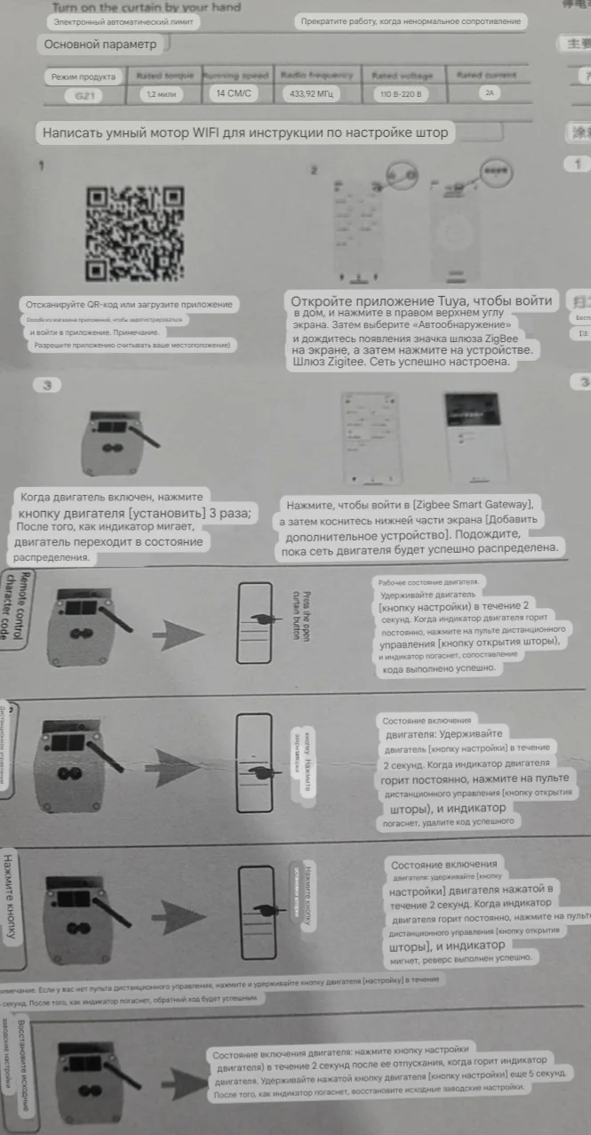 товар пришёл раньше срока. упакован хорошо, доя работы потребуется зигби шлюз от туя, Алиса не подтянула устройство, а так хотелось. в комплекте к мотор идёт шнур для Российского региона и пульт