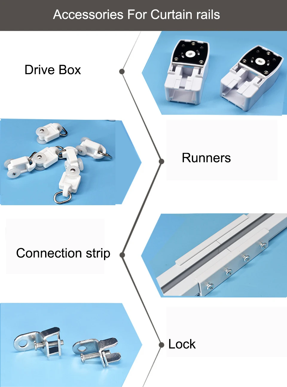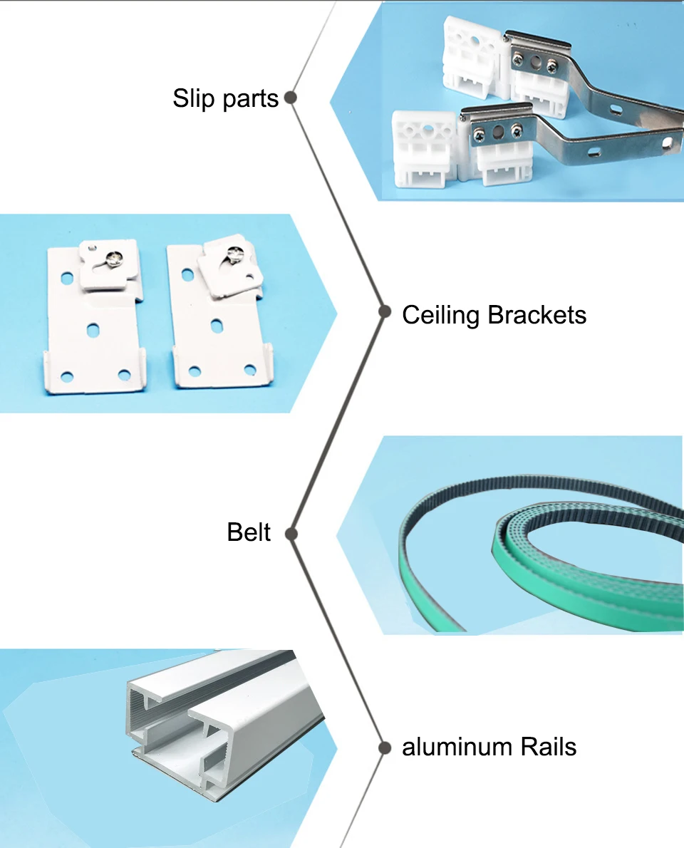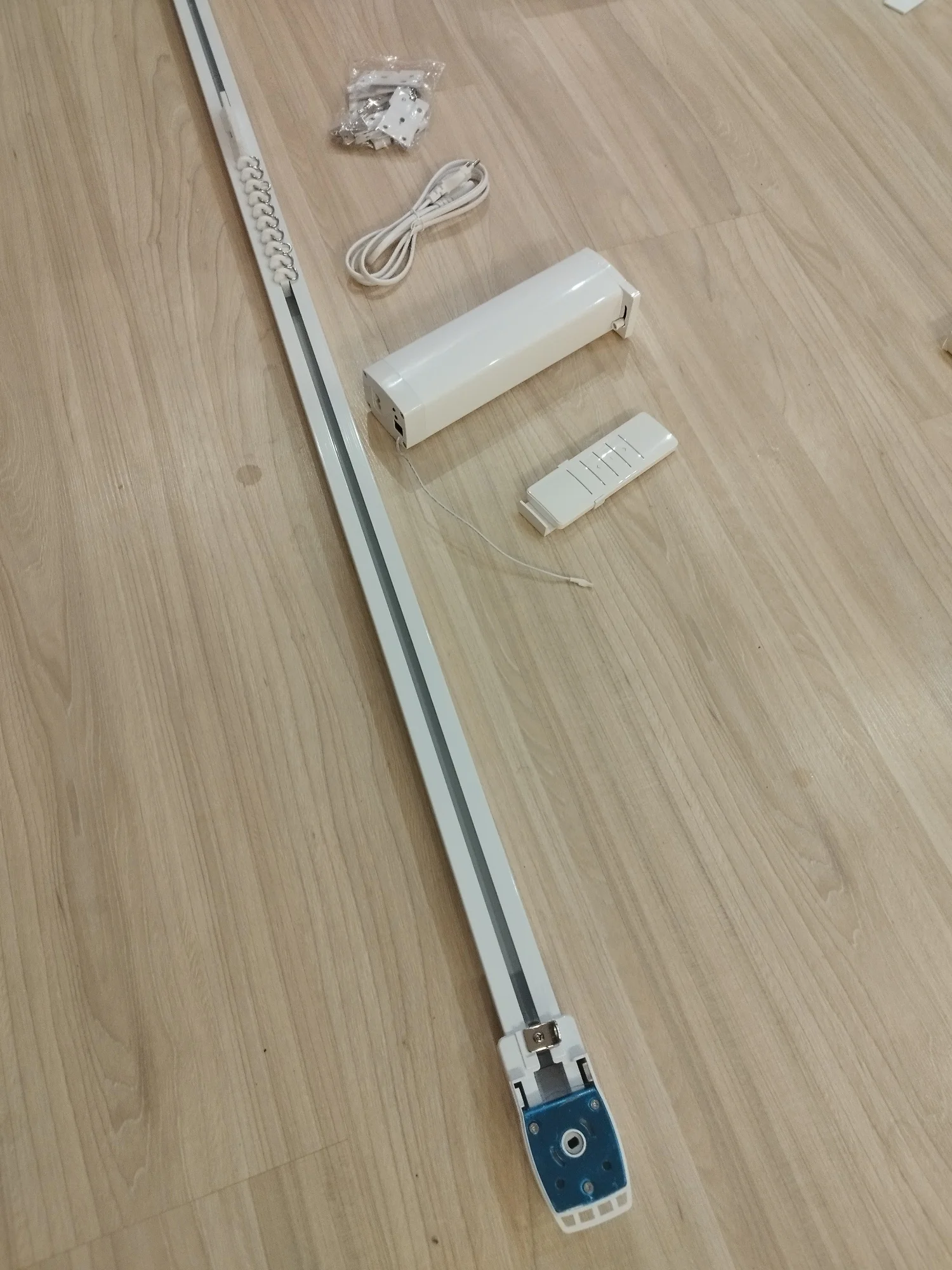 1 * Один комплект готовых карнизов (включая алюминиевую направляющую, направляющие, ремень, приводной коробку, кронштейны для потолочного крепления и т. д.)