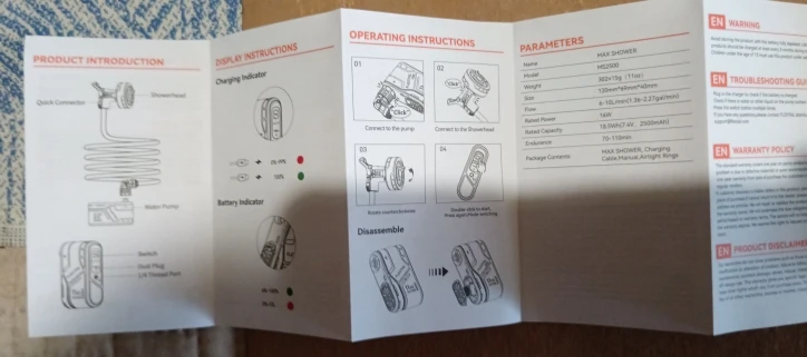 Упакованно отлично. Качество изготовления на высоте. Это лучший походный душ. шланг очень мягкий и гибкий. На шланге с двух стопон быстросъемные соединения. Блок с насосом запускается двойным кликом. Включается первая скорость. Еще одно надатие - вторая скорость. Следующее нажатие - выключается. На лейке есть возможность открыть/закрыть подачу воды. В комплекте набор запасных колечек уплотнителей. Напрр на первой скорости достаточен, чтобы помыться. На второй скорости можно сбивать грязь с предметов. Струйки очень тонкие - позволяют экономно расходовать воду.Andrei Z. 19 июня 2024